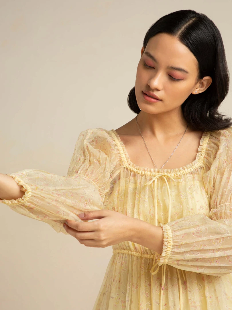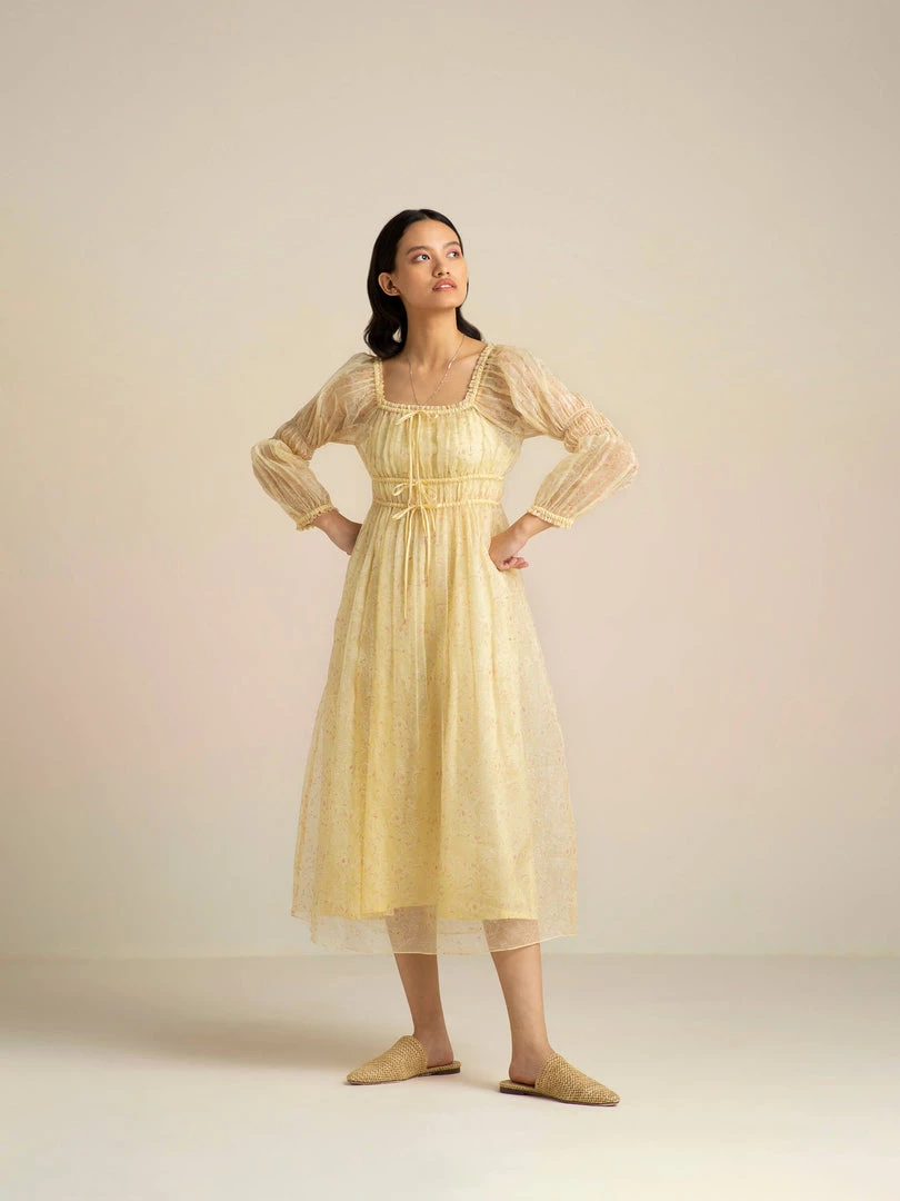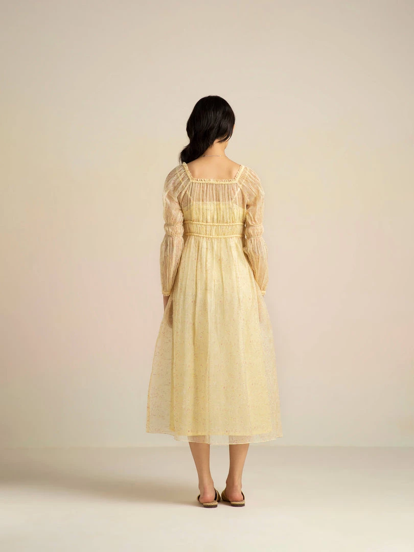 Soft lemon hues, fresh florals, a square neckline and elasticated shirred waist give this dress a slender form and evokes a carefree bohemian mood this spring.