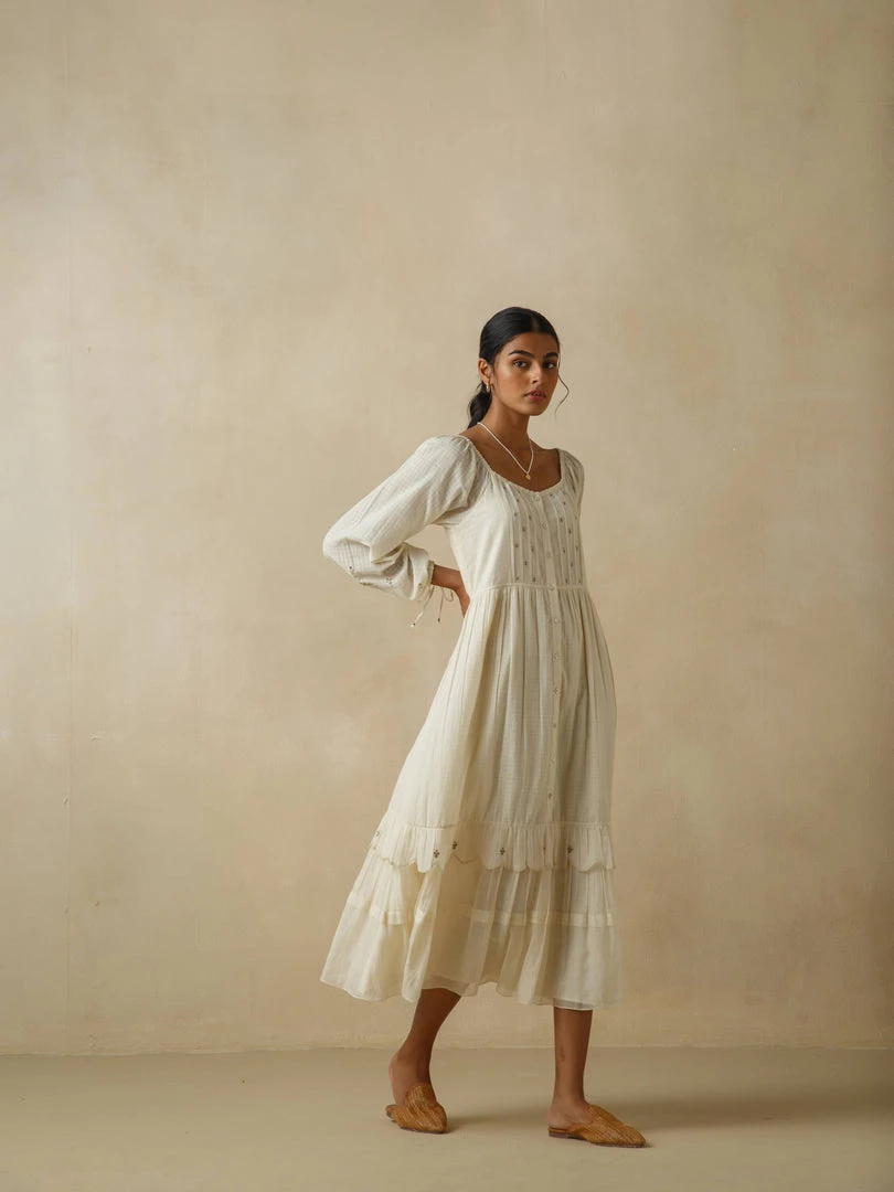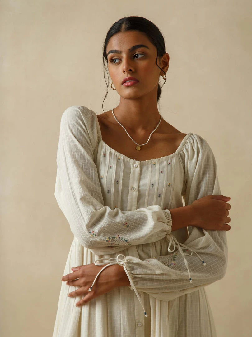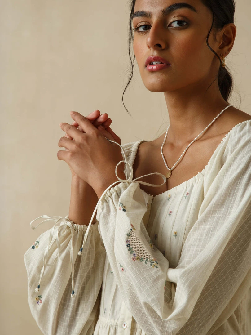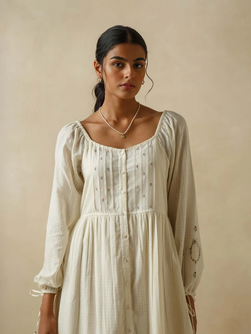 Drive the summer blues away in this soft and airy dress made from our unbleached handwoven cotton fabric with a sweetheart neckline and delicate embroidery on the front bodice. It comes with elasticated sleeves with adjustable drawstring tie-ups.  Â