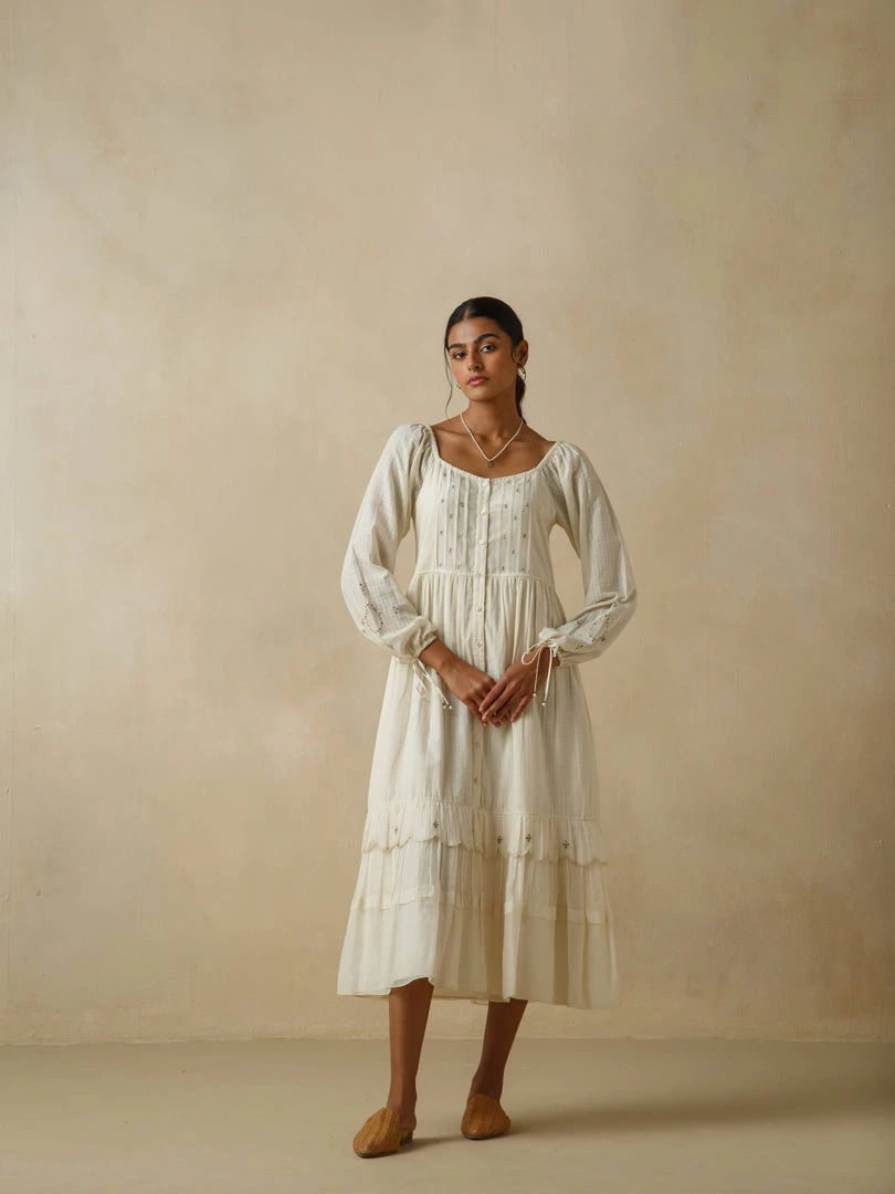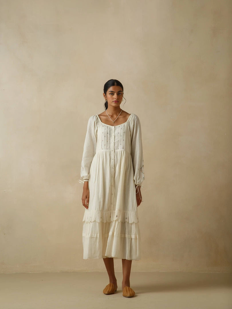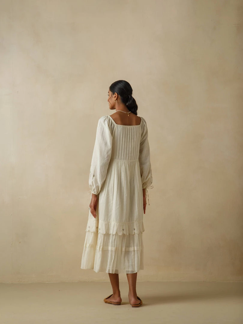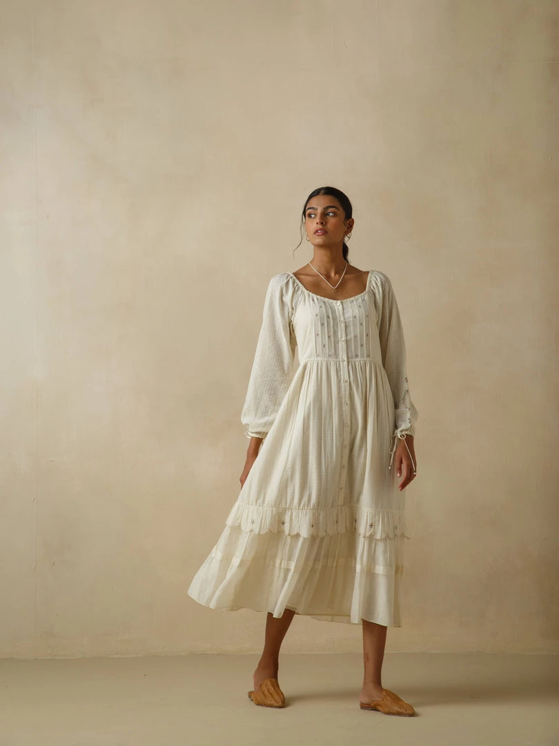 Drive the summer blues away in this soft and airy dress made from our unbleached handwoven cotton fabric with a sweetheart neckline and delicate embroidery on the front bodice. It comes with elasticated sleeves with adjustable drawstring tie-ups.  Â
