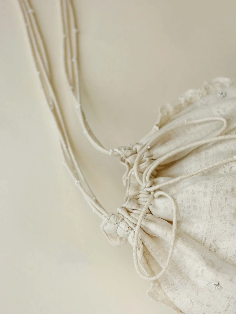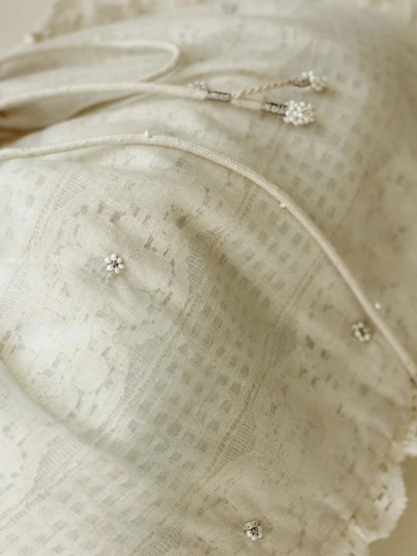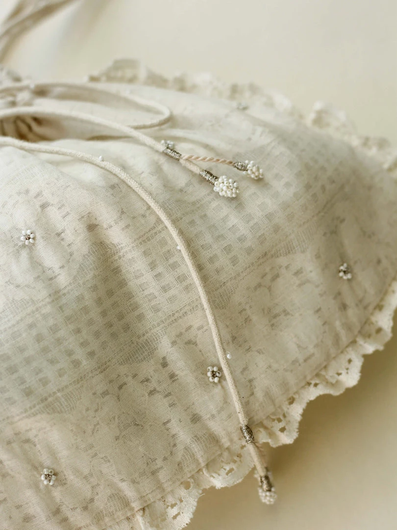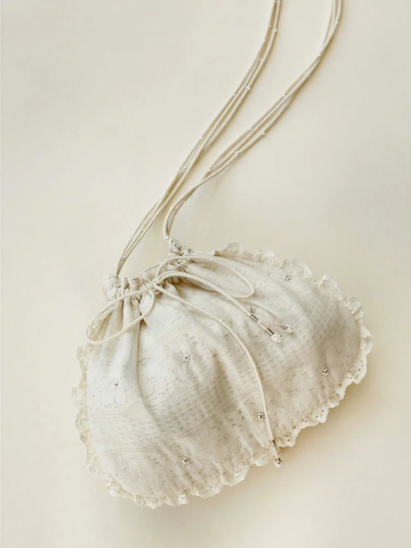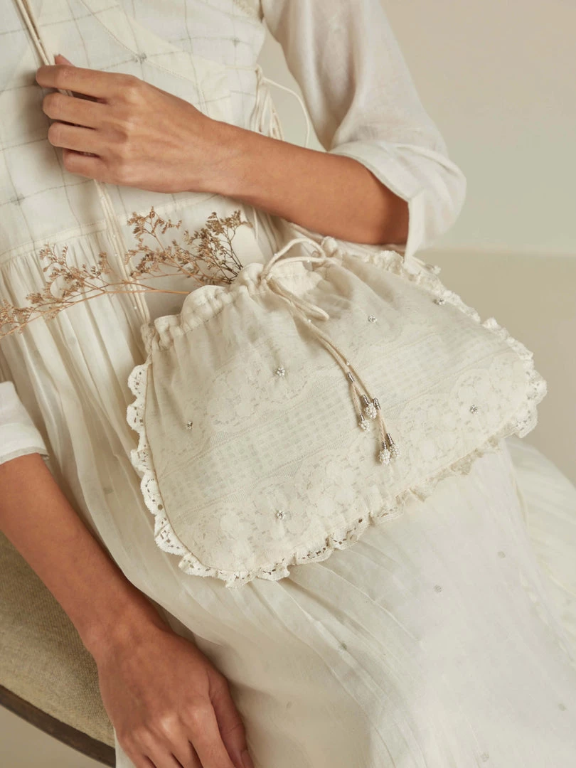 A vintage lace layered with sheer chanderi fabric and the beaded hand embroidery makes the Orna Drawstring Pouch your go-to bag for the festive season. It can Be styled as a sling bag or as a potli pouch.ย Pair it with our Aoki Kedia Dress.ย