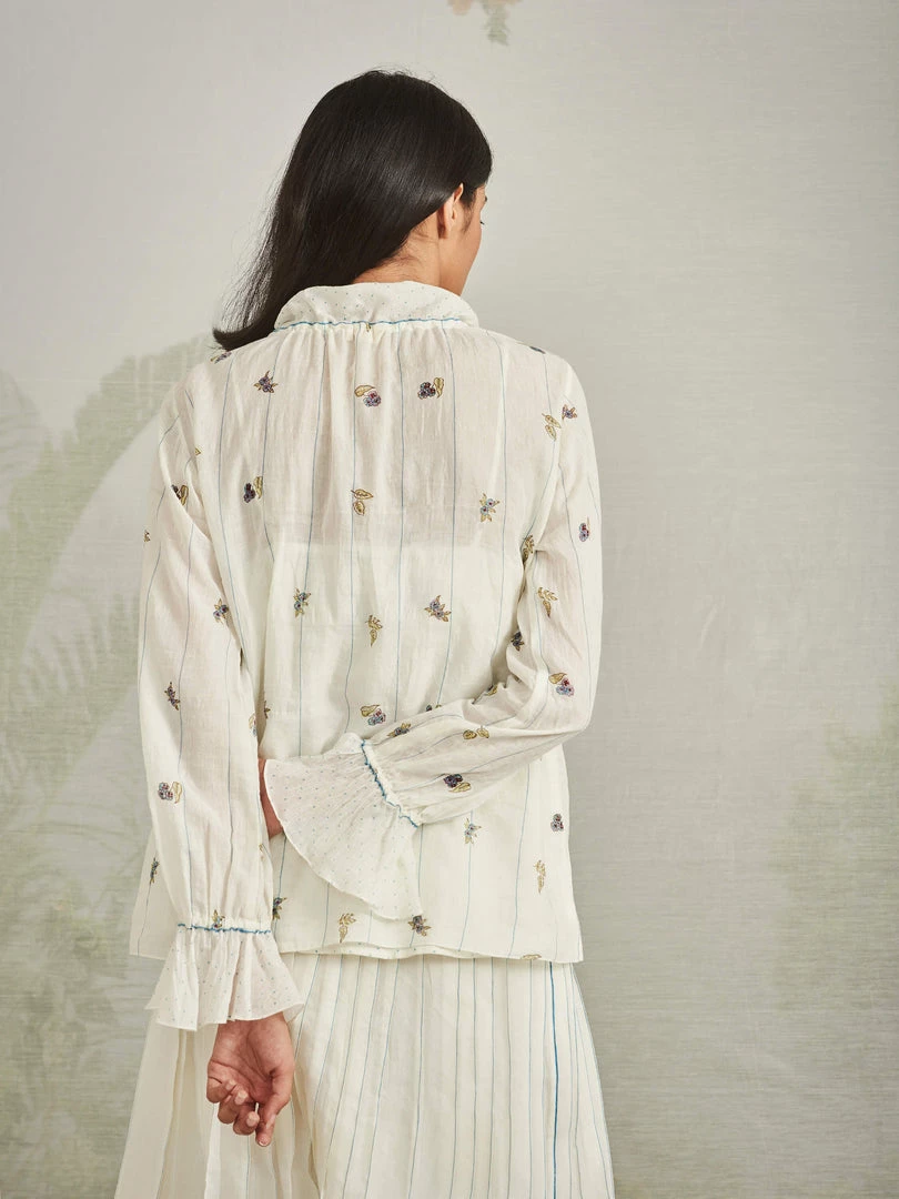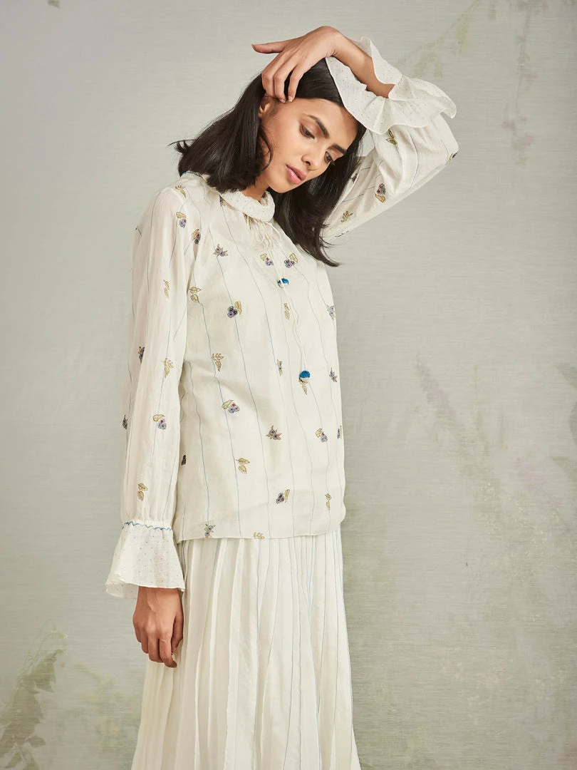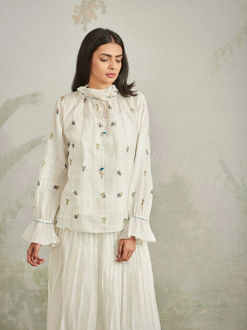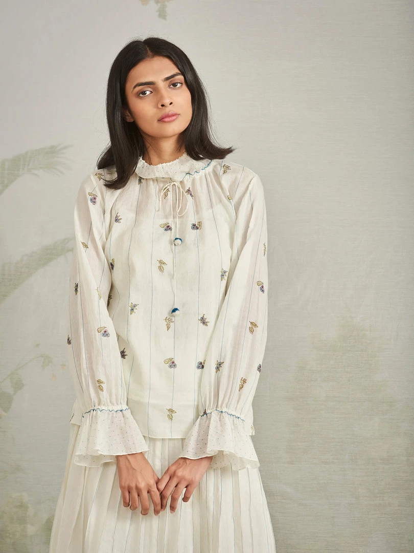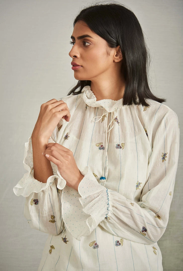 A blouse for inspirational, elfish workdays featuring ruffled sleeves and an adjustable ruffle collar edged with pearl beads. The collar can be adjusted using a drawstring for comfort. Hand block printed, polka dots, and aqua blue selvedge detailing at the sleeve hem lend to this garment’s whimsical nature. Gentle, blue pinstripes run across its length stringing together hand-block printed bluebonnet motifs.