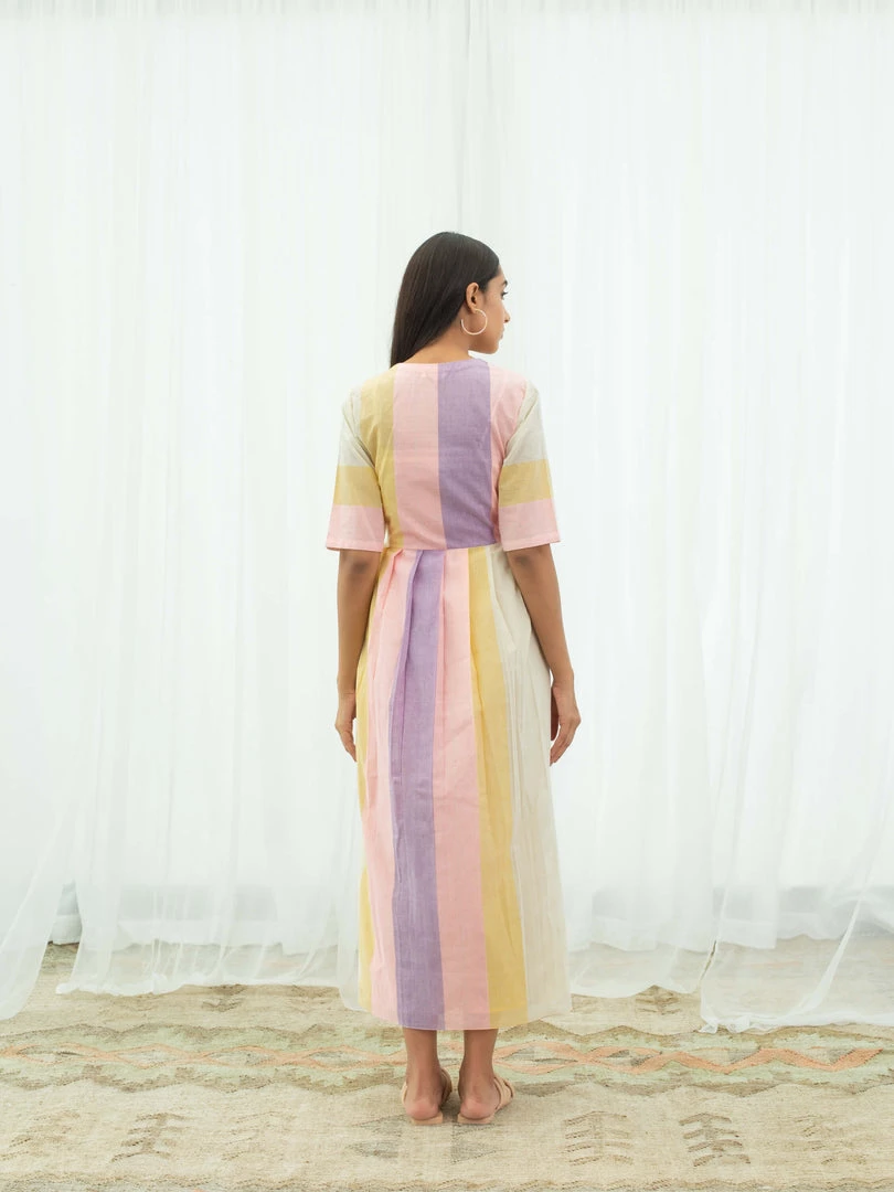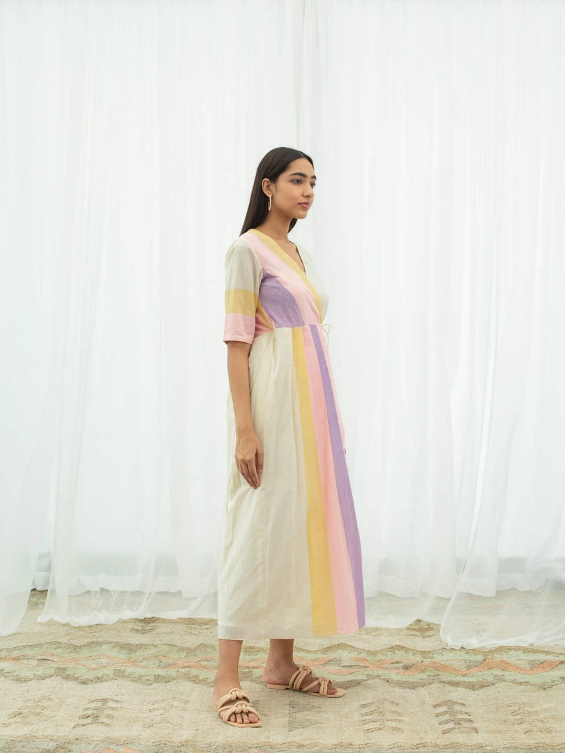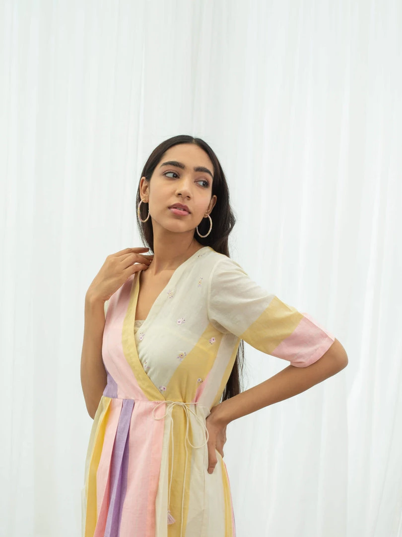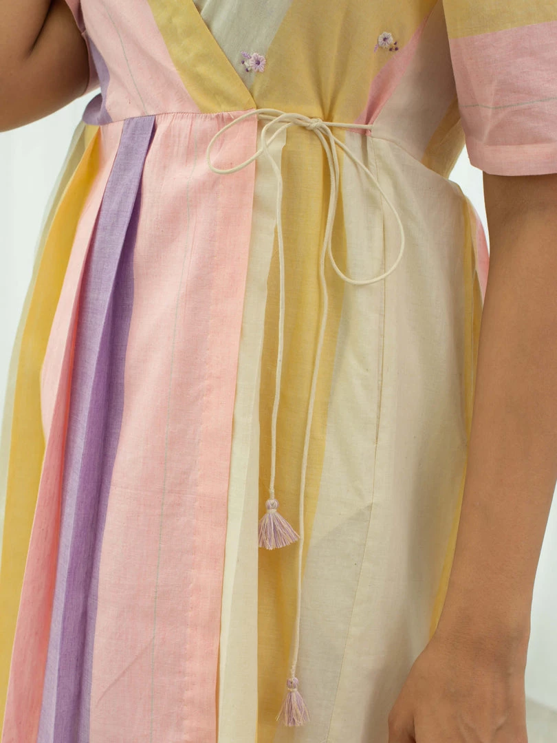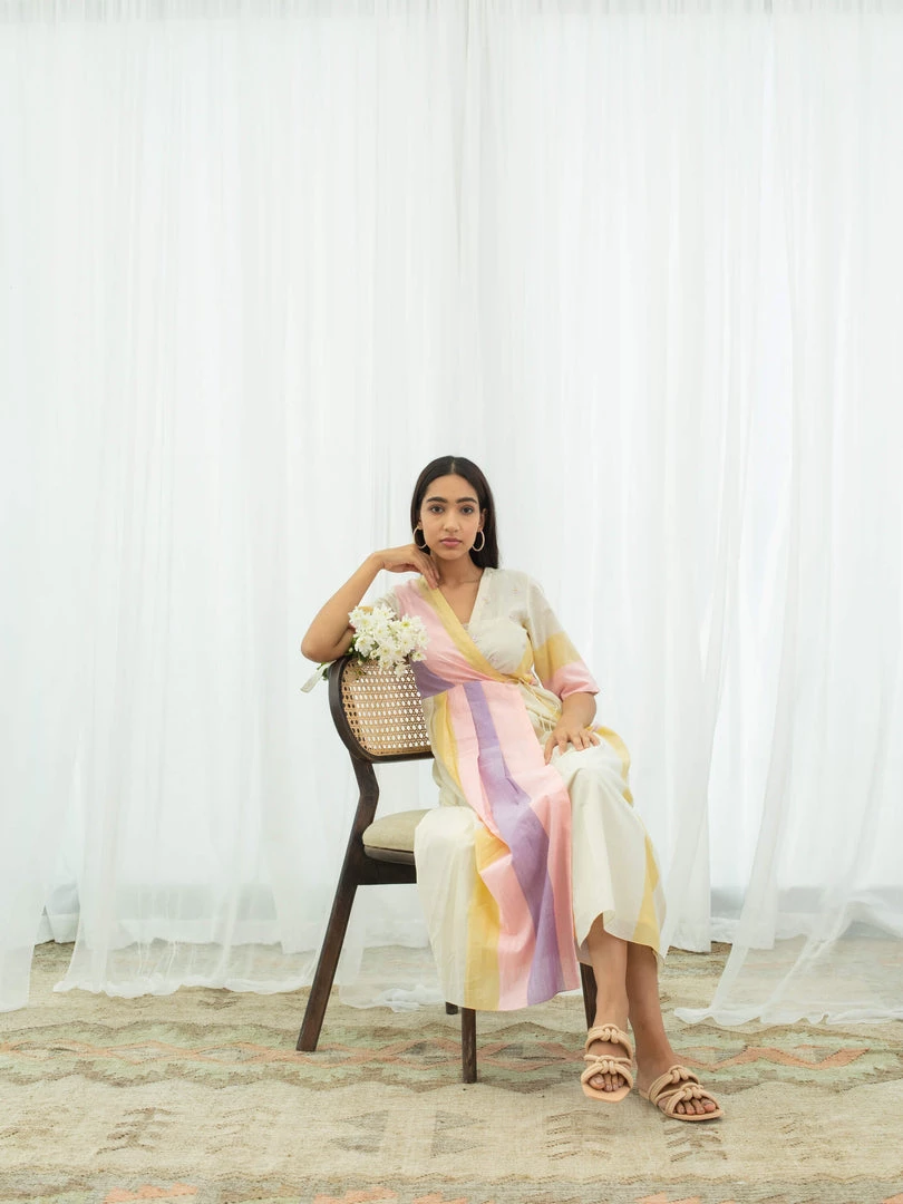 This wrap dress in yarn dyed pink, purple and yellow stripes is made in the finest handwoven mulmul of Bengal. Details include minimal hand embroidery on the yoke and tassel tie ups. It comes with a cotton slip dress with lace edgings.