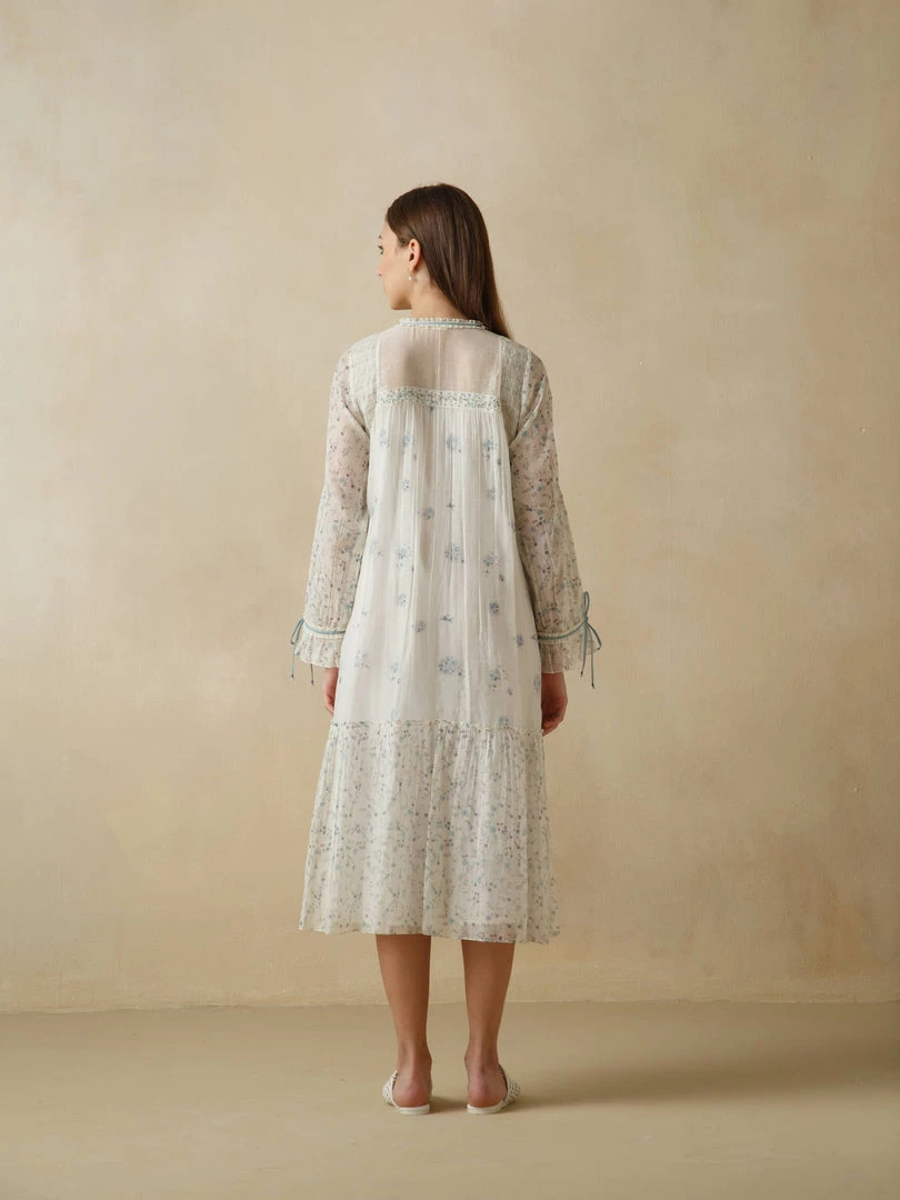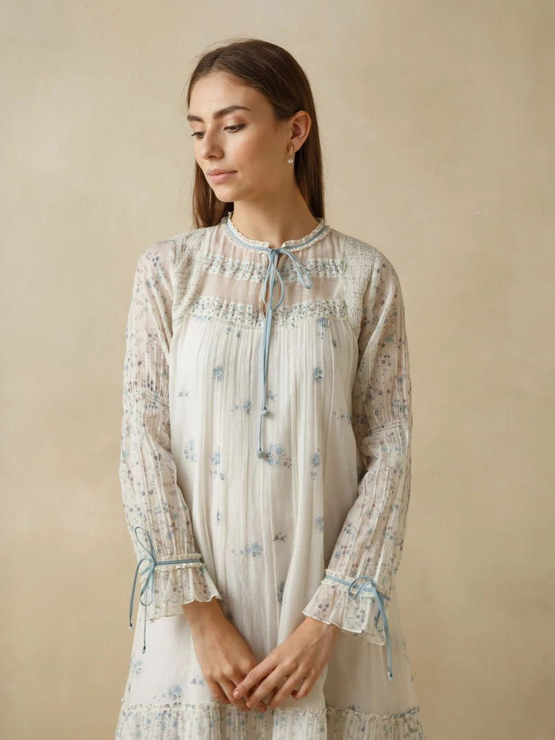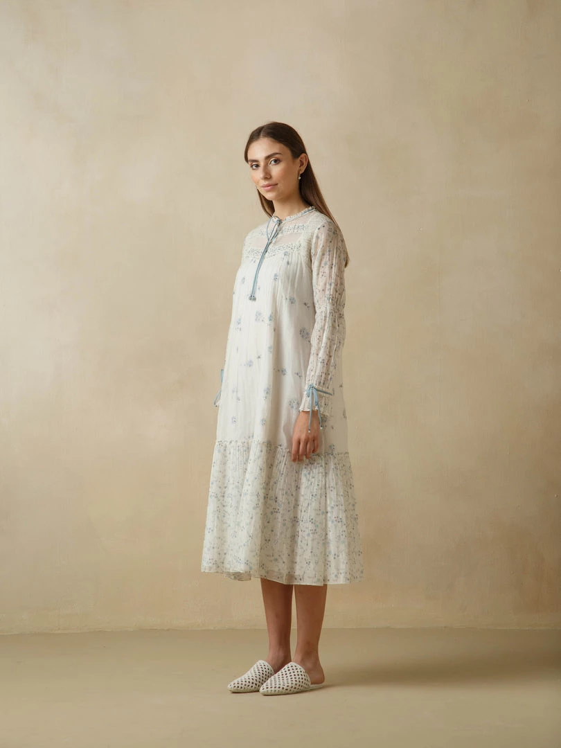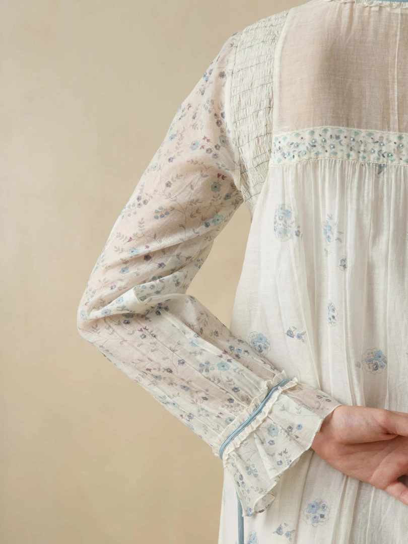 Suggestive of the small daily wonders of life – the squirrel in the tree, the owl that hoots among the hills calling for its mate, the sparrow on the window; our vintage inspired floral hand block printed Bucolic Countryside midi dress features scattered periwinkle blue florals on beige cotton chanderi fabric. The neck details include embroidered trellis borders which can be tied with drawstrings and smocking.