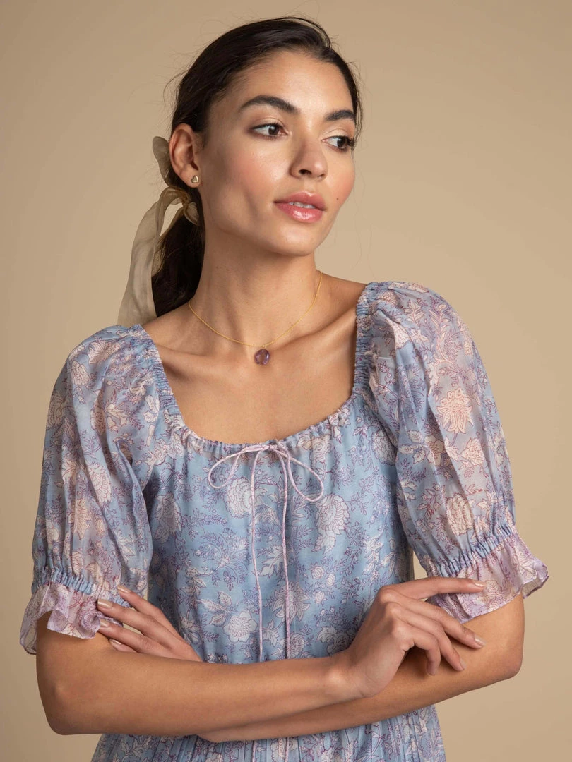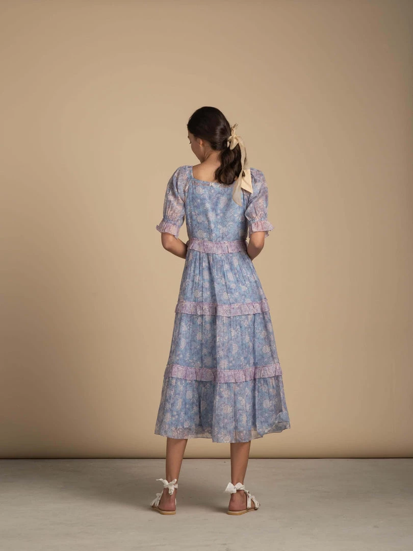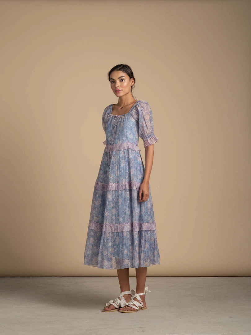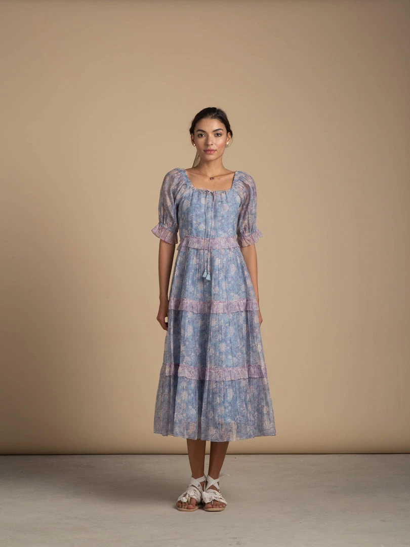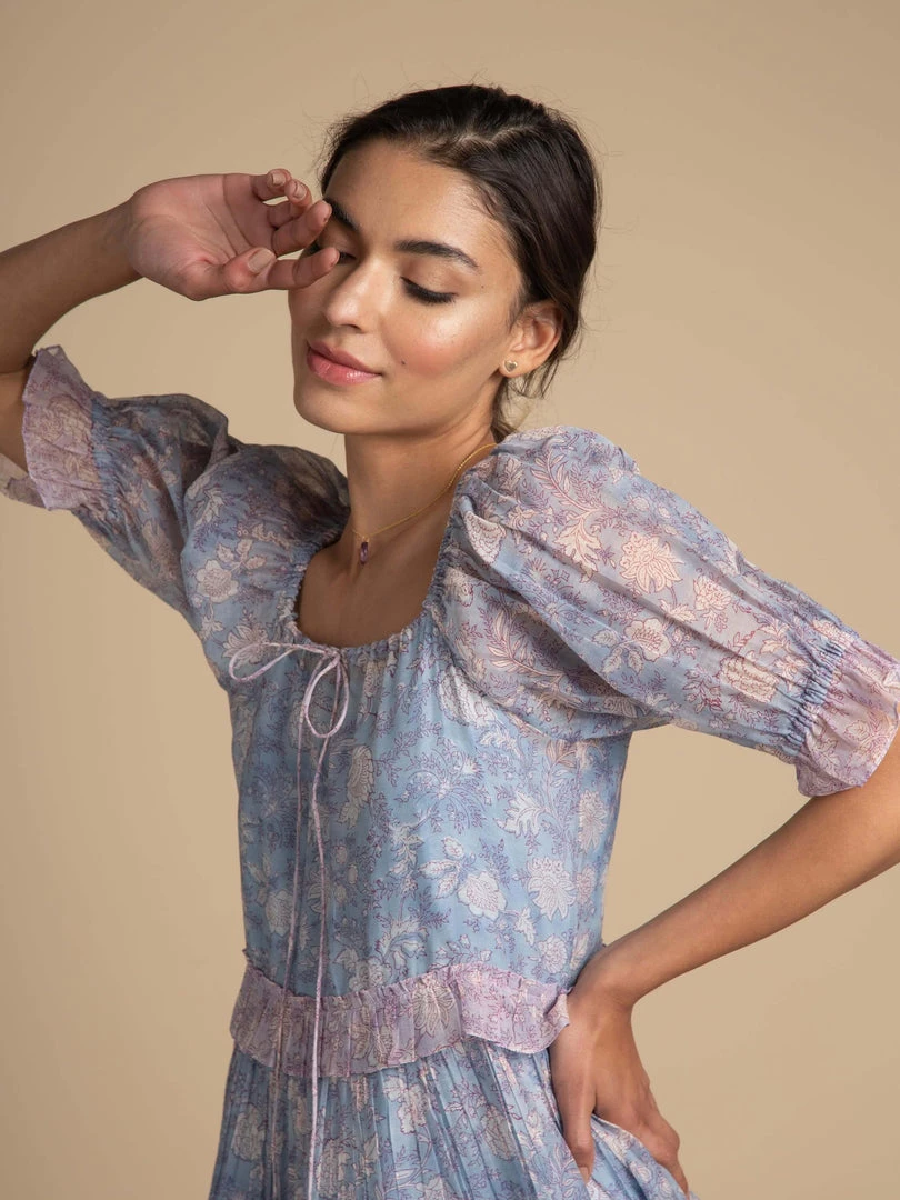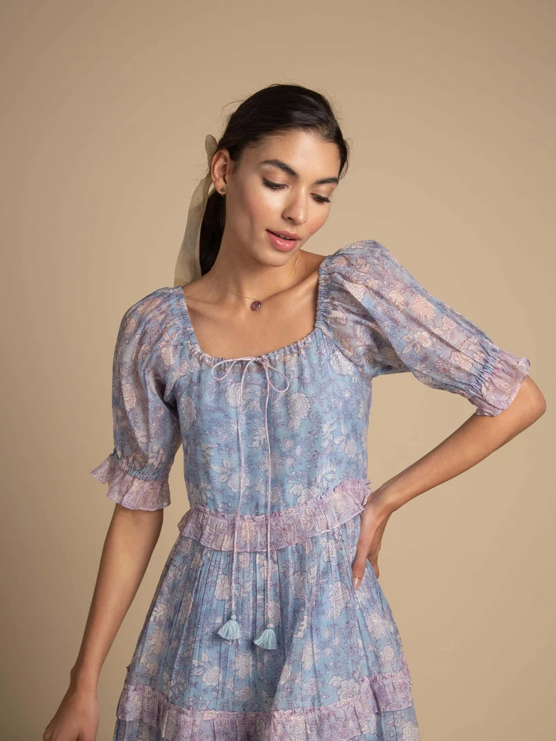 Our Carolina Ruffle Dress features a flattering square neckline which can be worn both on & off-shoulder. The contrast ruffle accents on tiers and short puff sleeves give it a romantic vibe. It’s shaped from our signature sky blue chintz print on feather light Chanderi fabric.