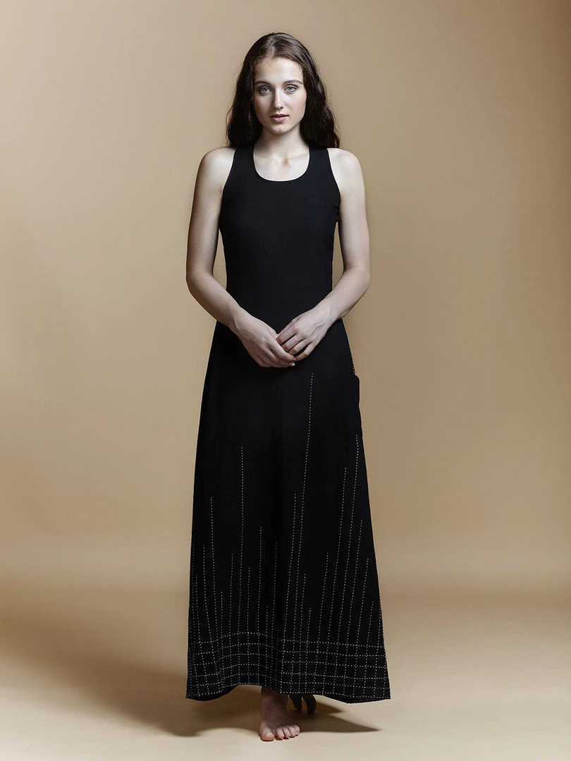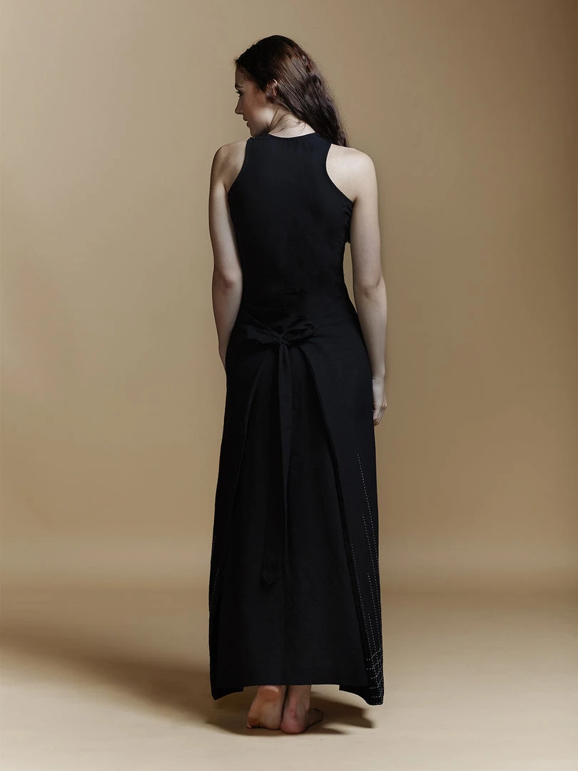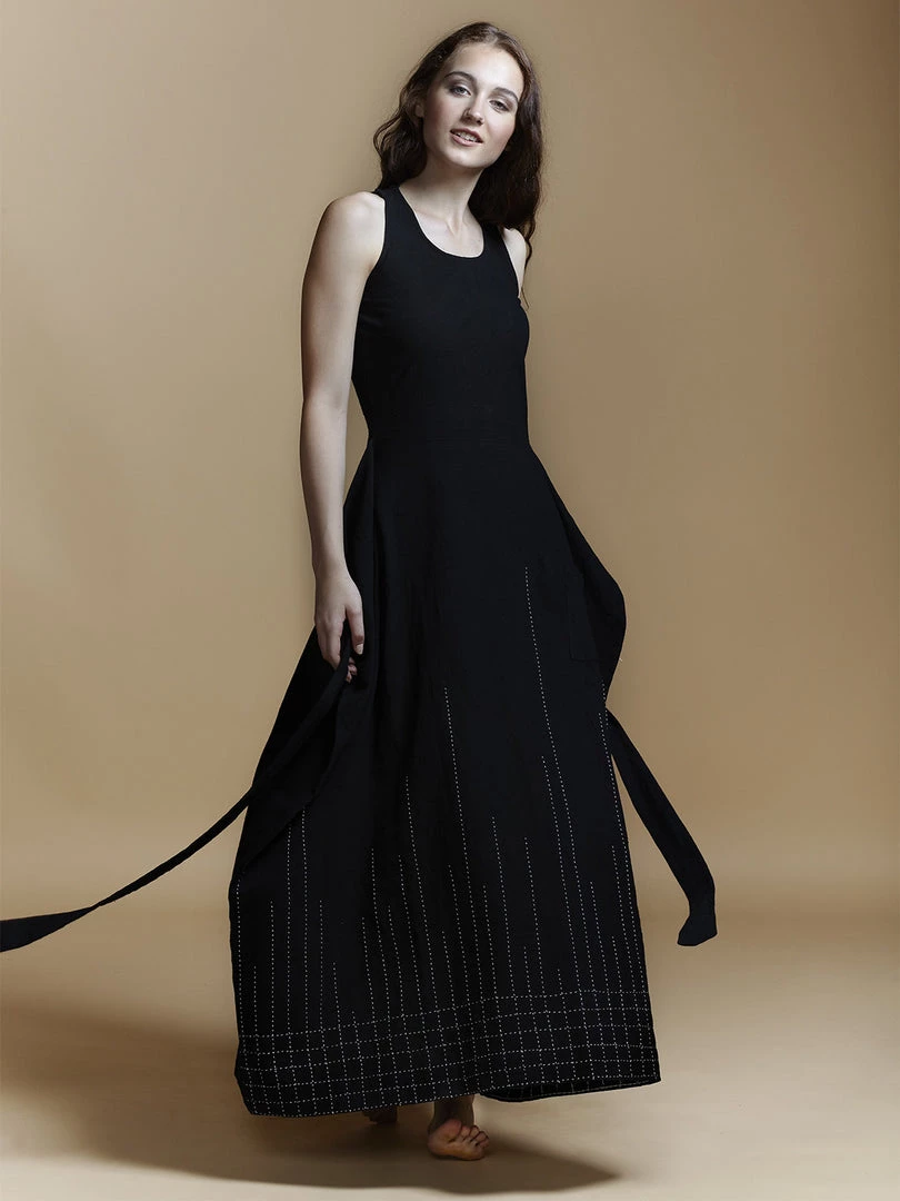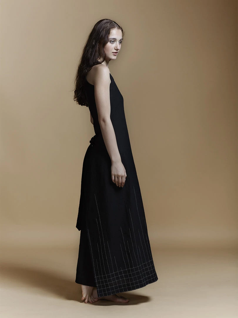 Dress made from slubby handwoven fabric that will help you channel your inner self. Feel free this summer, to do whatever, be whoever you want. Inspired by the traditional Tibetan Choba, we have borrowed the elegant timelessness it exudes. It features a back tie up that gives a chic edge to this enduring silhouette.