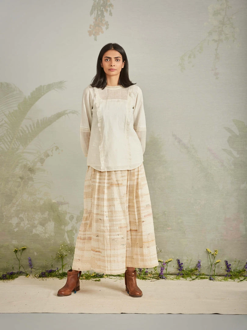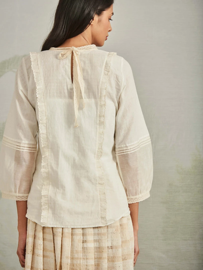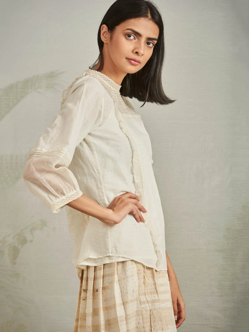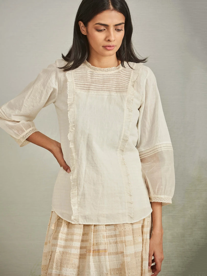 The nebulous summer air is reminiscent in this top featuring sheer chanderi inserts cast in pleated panels down the yoke and on the sleeves. The vintage lace collar forms a bow tie at the back, and the three-by-fourth length sleeves are edged with lace.