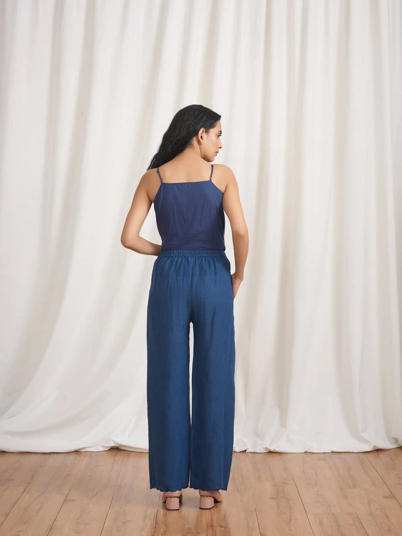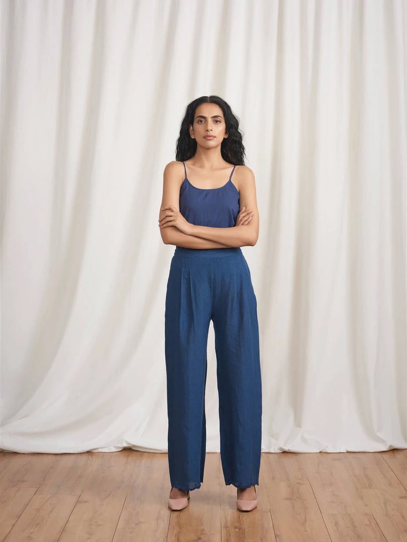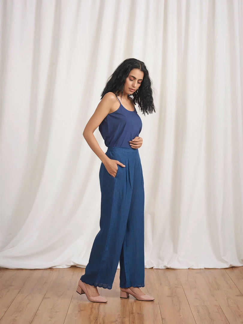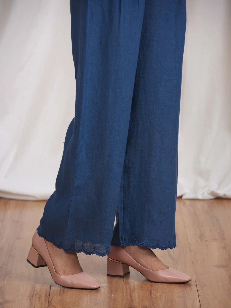 These casual pants in deep cerulean blue are made in handwoven linen with a rich texture. It comes with scallop edging details, knife pleats and inseam pockets.