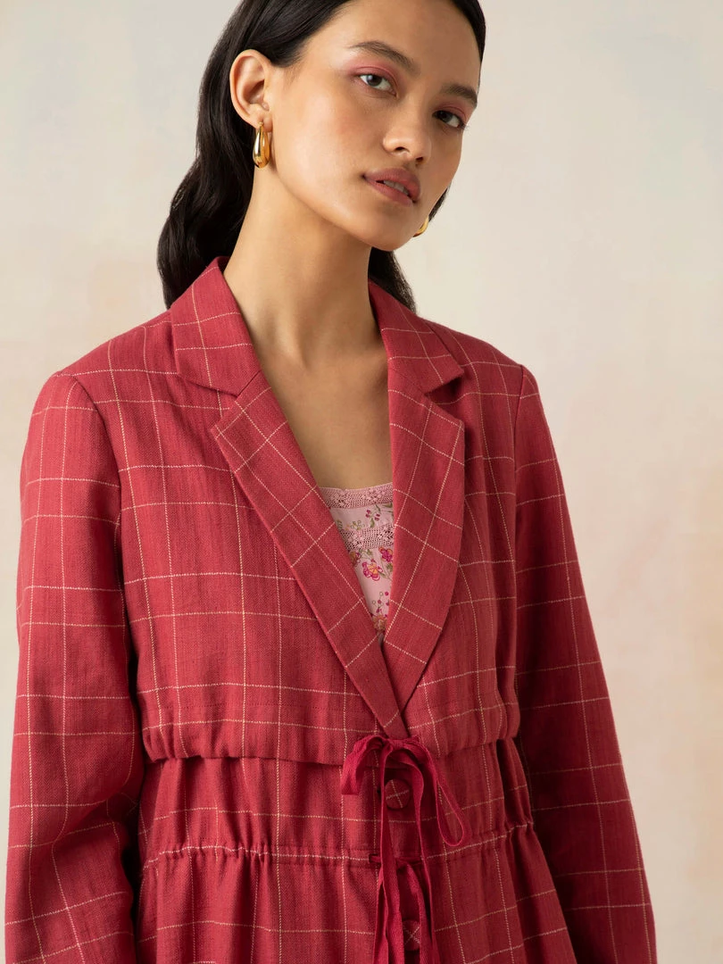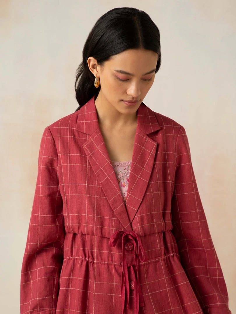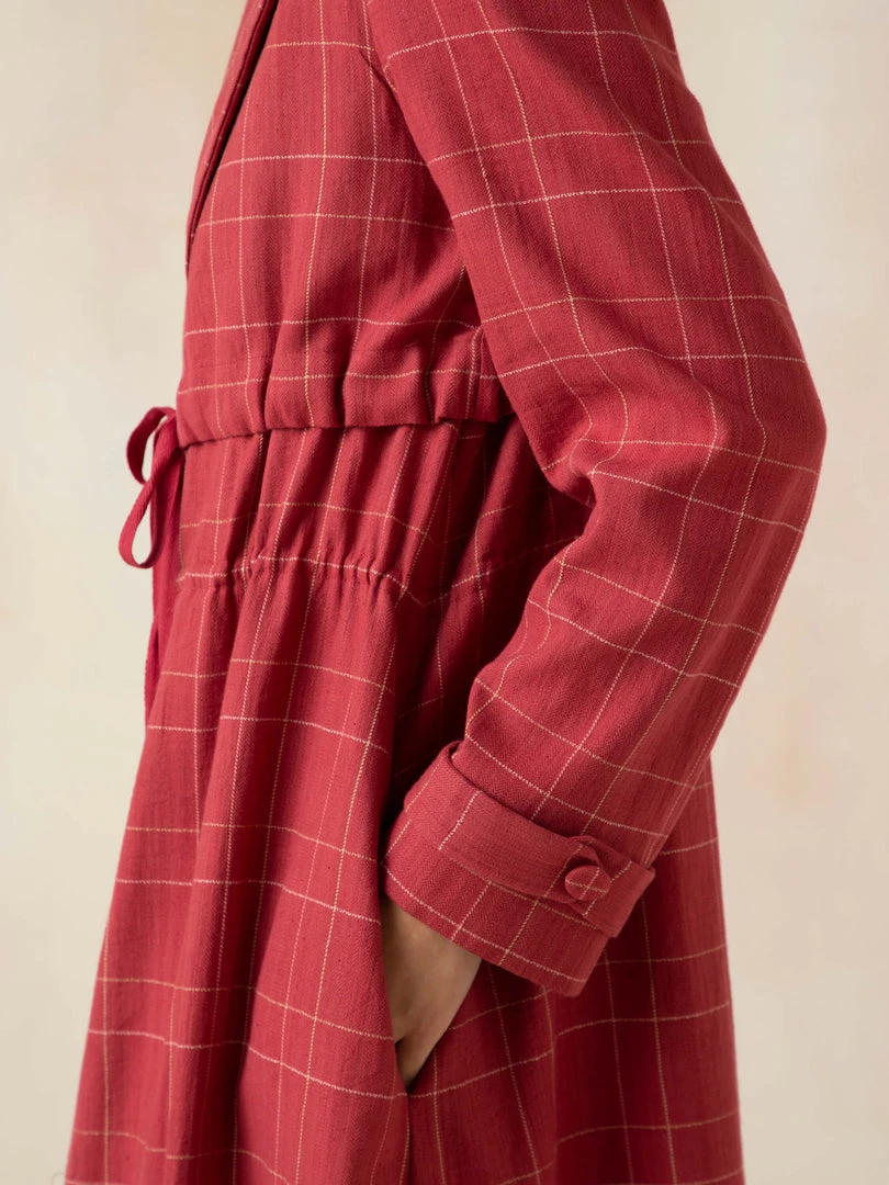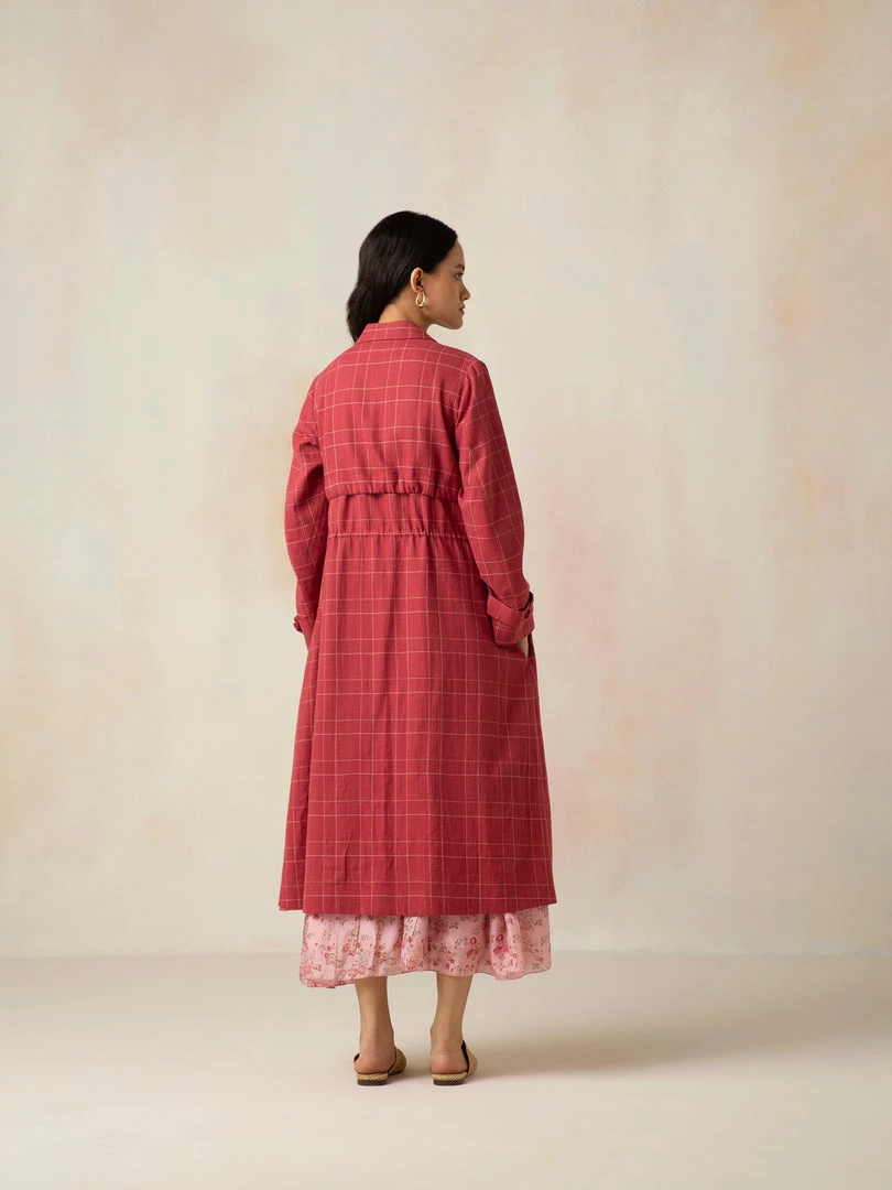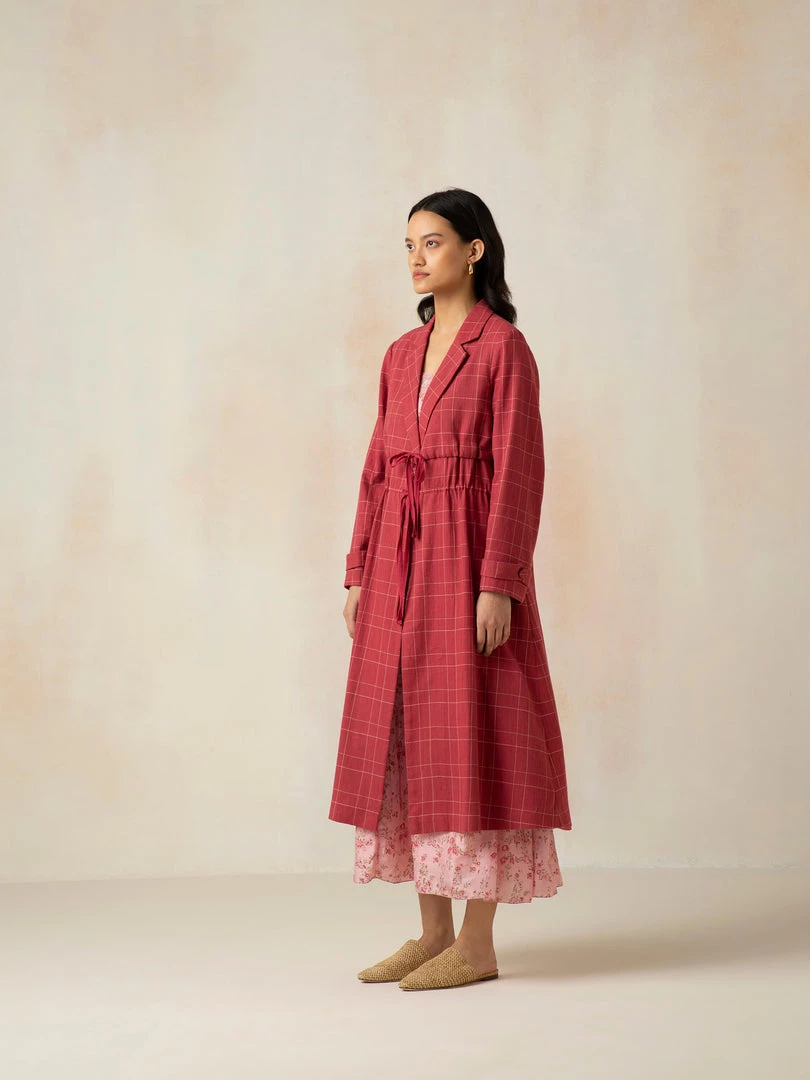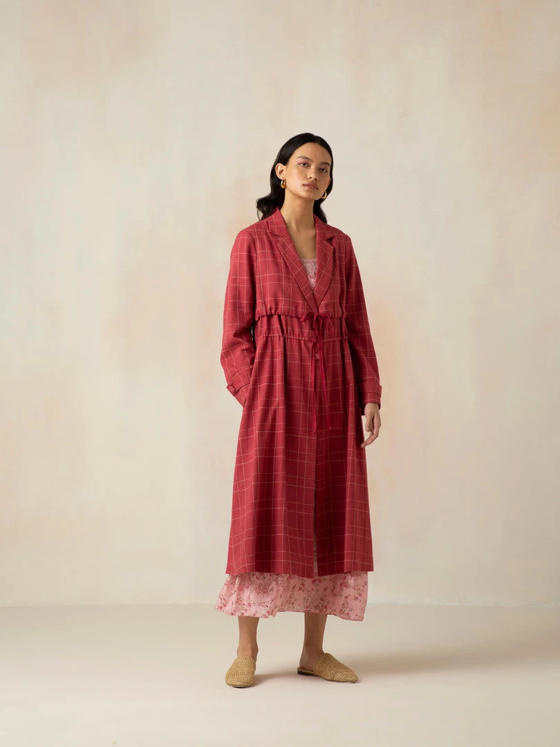Visualize tales of small wooden cottages on a snowy evening, mulled wine, and bonfires, with your favourite playlist playing in the background. This trench coat portrays the palette of festivity and celebrates the changing seasons. Featuring a side slant pocket and adjustable drawstring tie-ups on the waist and flap, it can be clinched in for a fitted look.