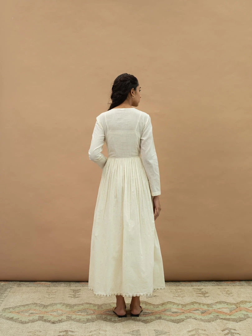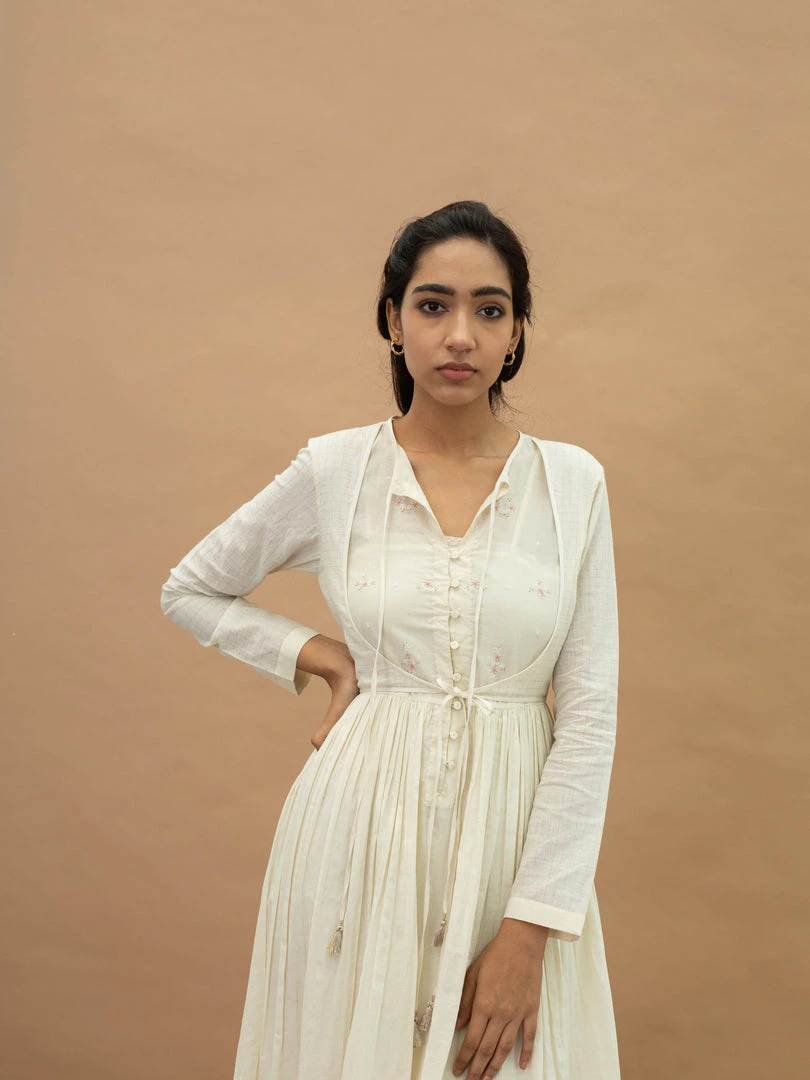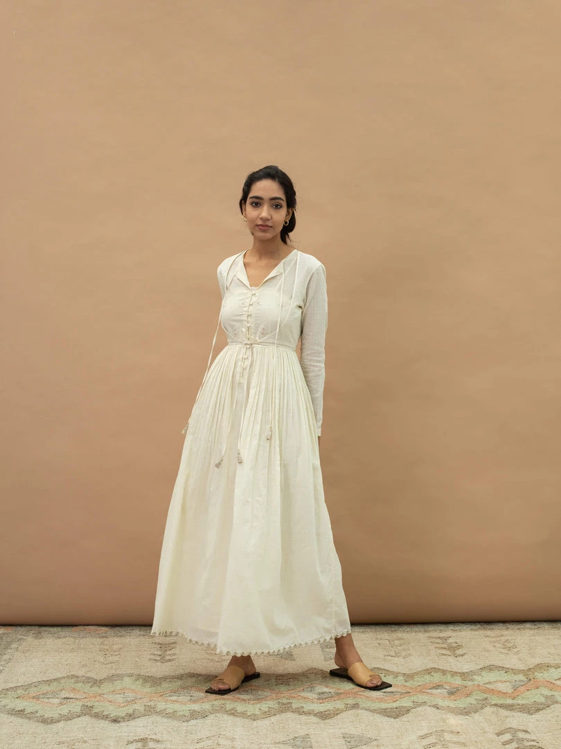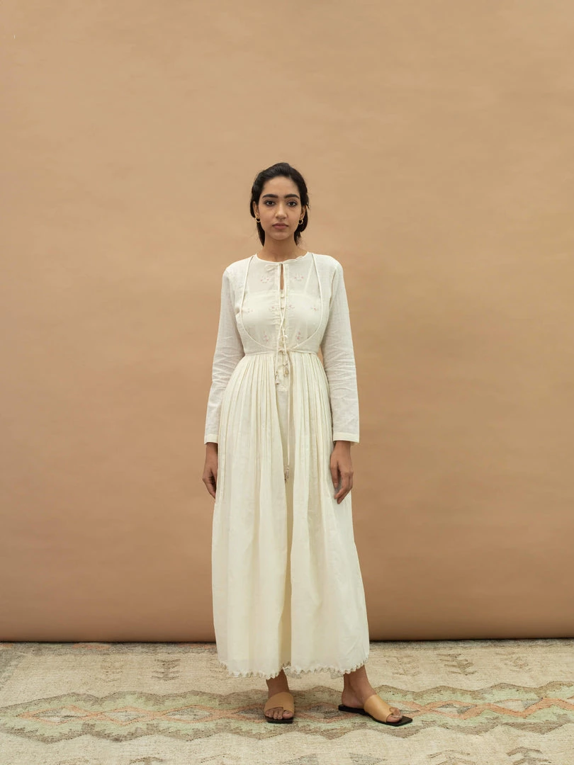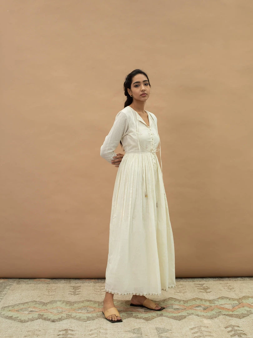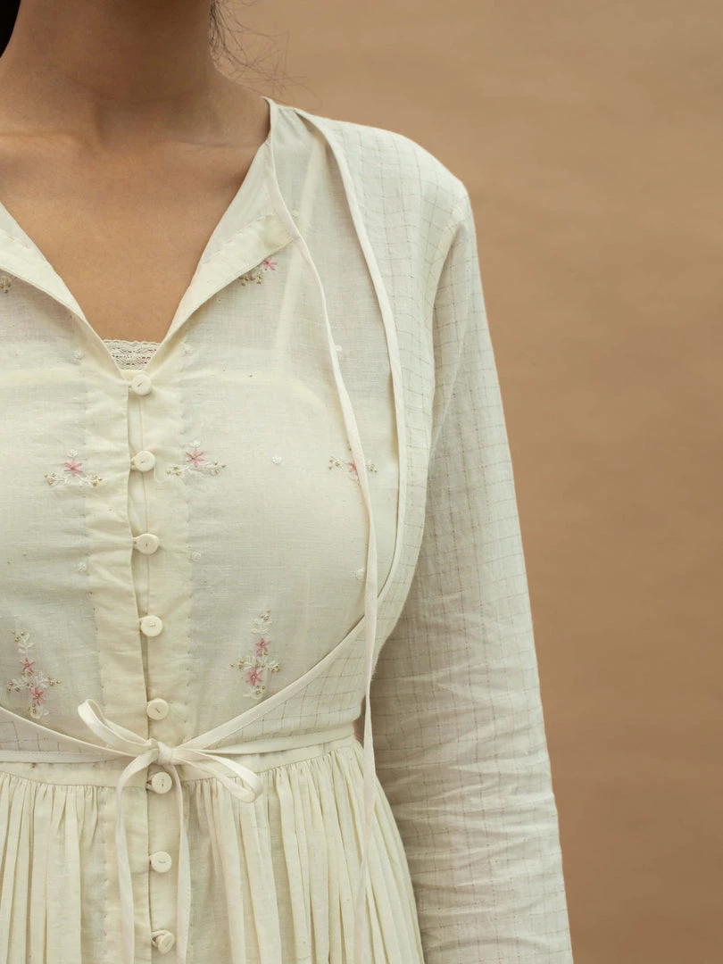 Comfort and elegance come together in our Daisy Tassels Dress made in soft handwoven mulmul cotton. It has a layered yoke with hand embroidered motifs of pink daisies, hanging tassels and a soft gathered waist. The hemline is edged with delicate scallop embroidery.