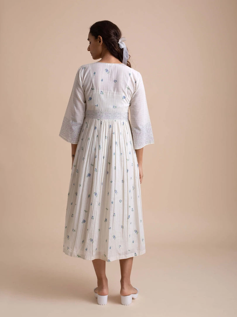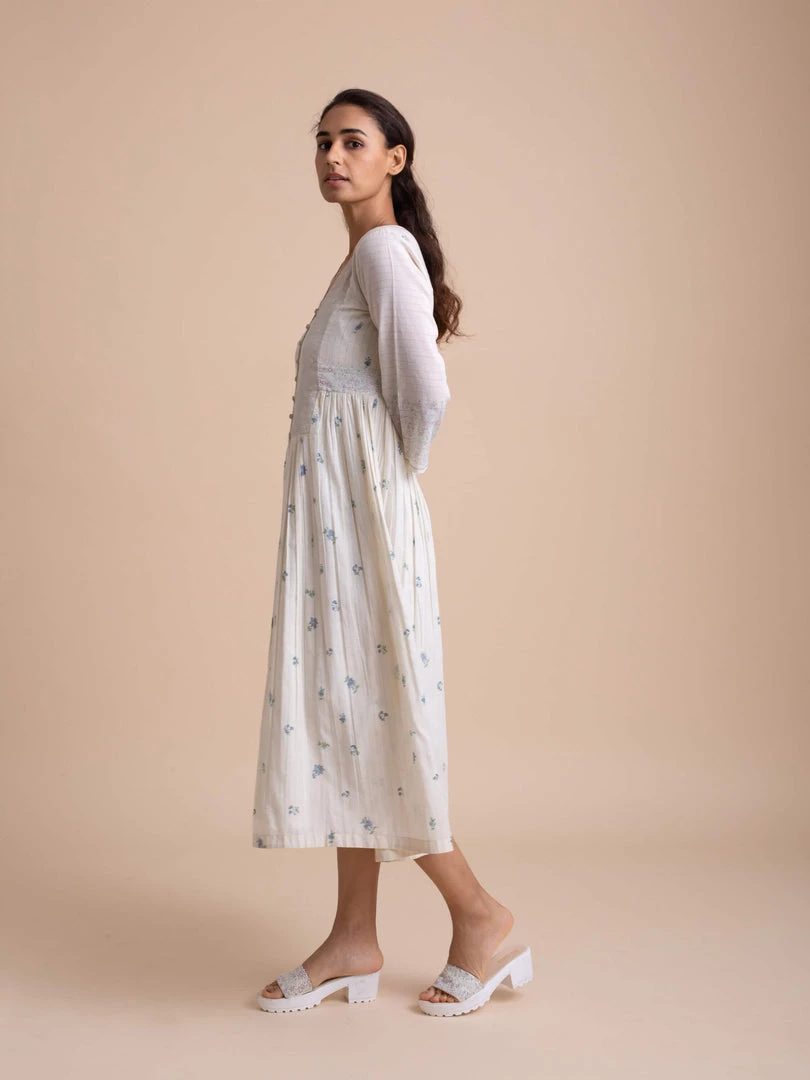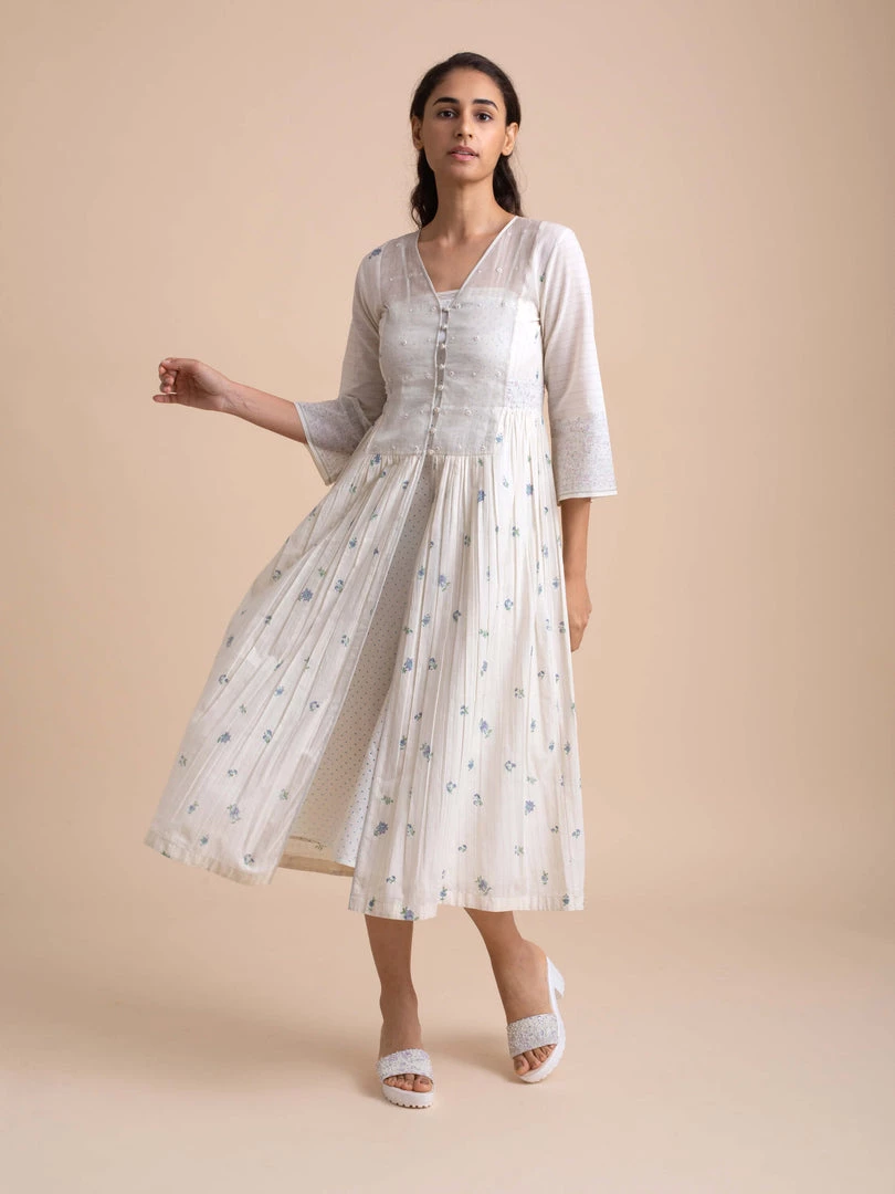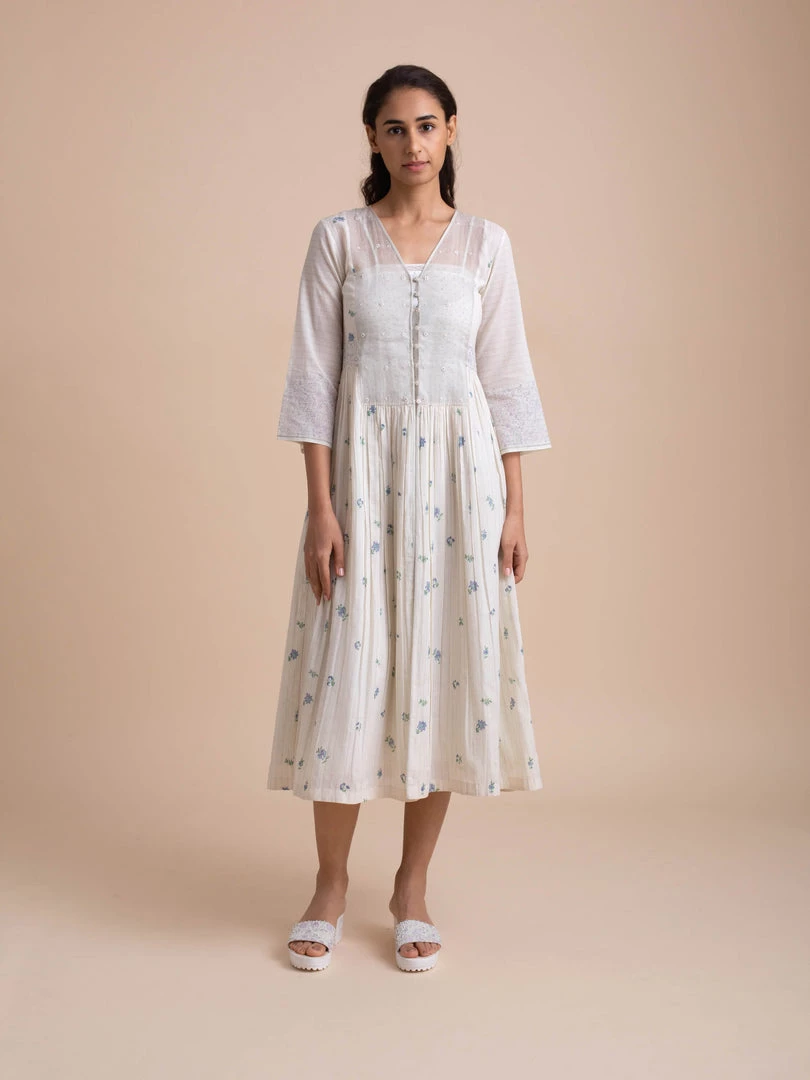 Handcrafted in fine handwoven cotton, this button down front open dress features an organza silk yoke with hand embroidery, bead work and fabric covered buttons. Subtle waist gathers and a v-neck bodice lend it timeless charm. The bodice is hand block printed with dainty floral motifs in purple and green.