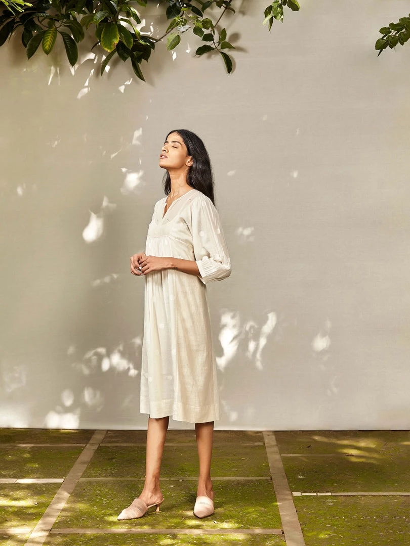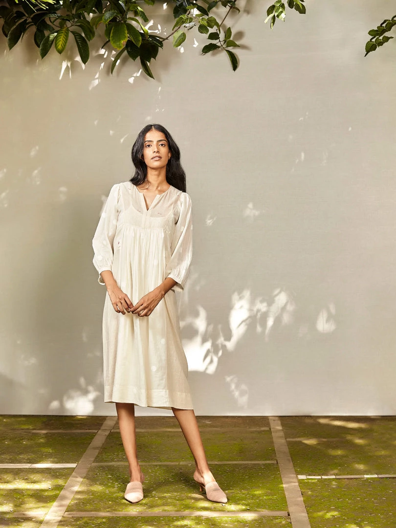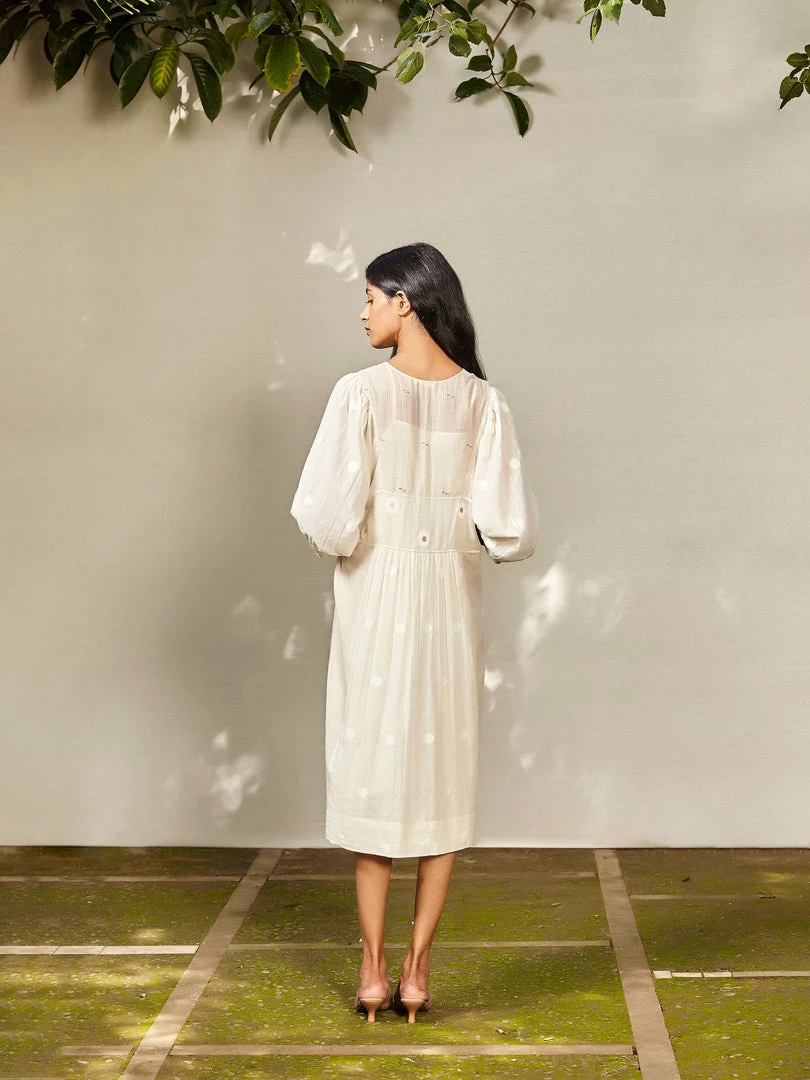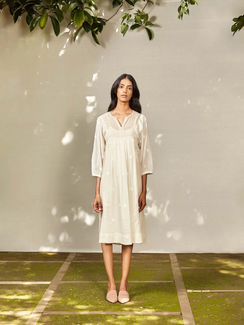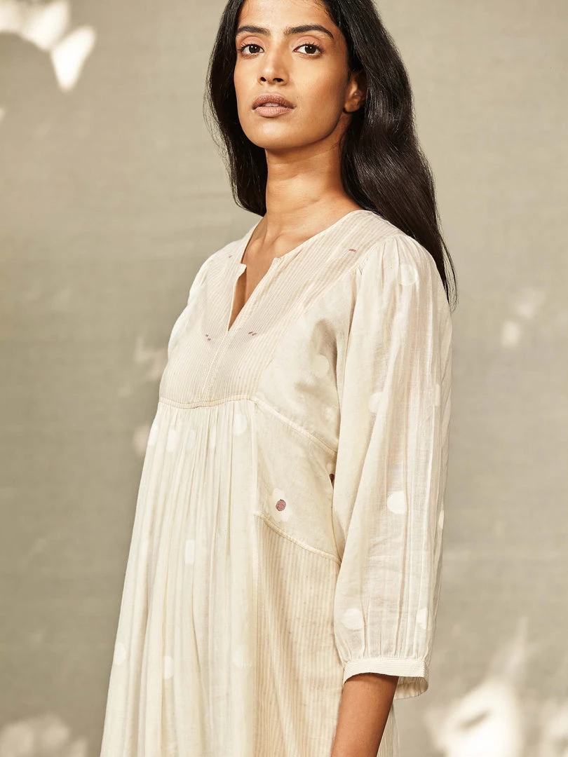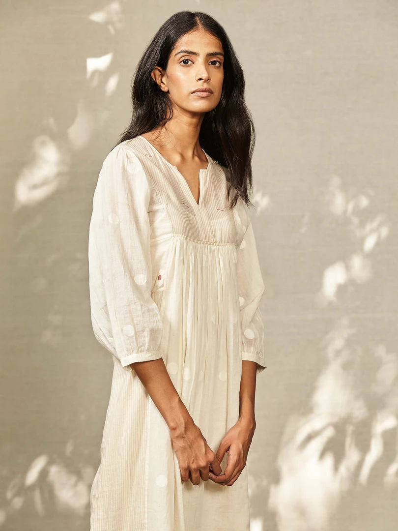 This classic airy silhouette in sublime Jamdani with bold dewdrop motifs comes with details like Zari thread work, fagoting and light gathers. The dewdrop fresh monochrome shade lends it ethereal charm.