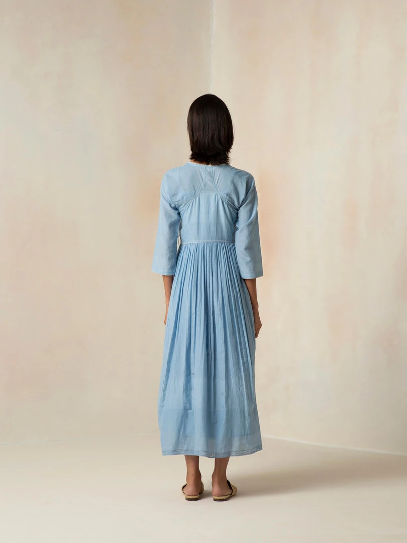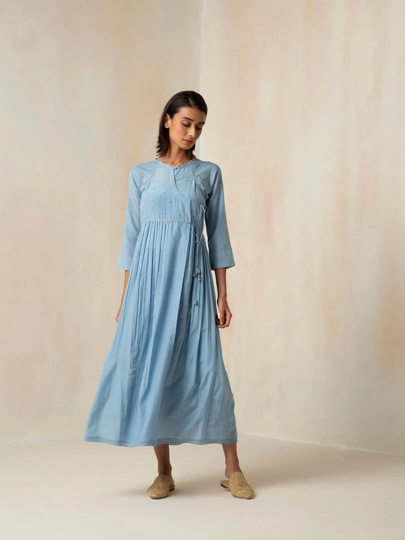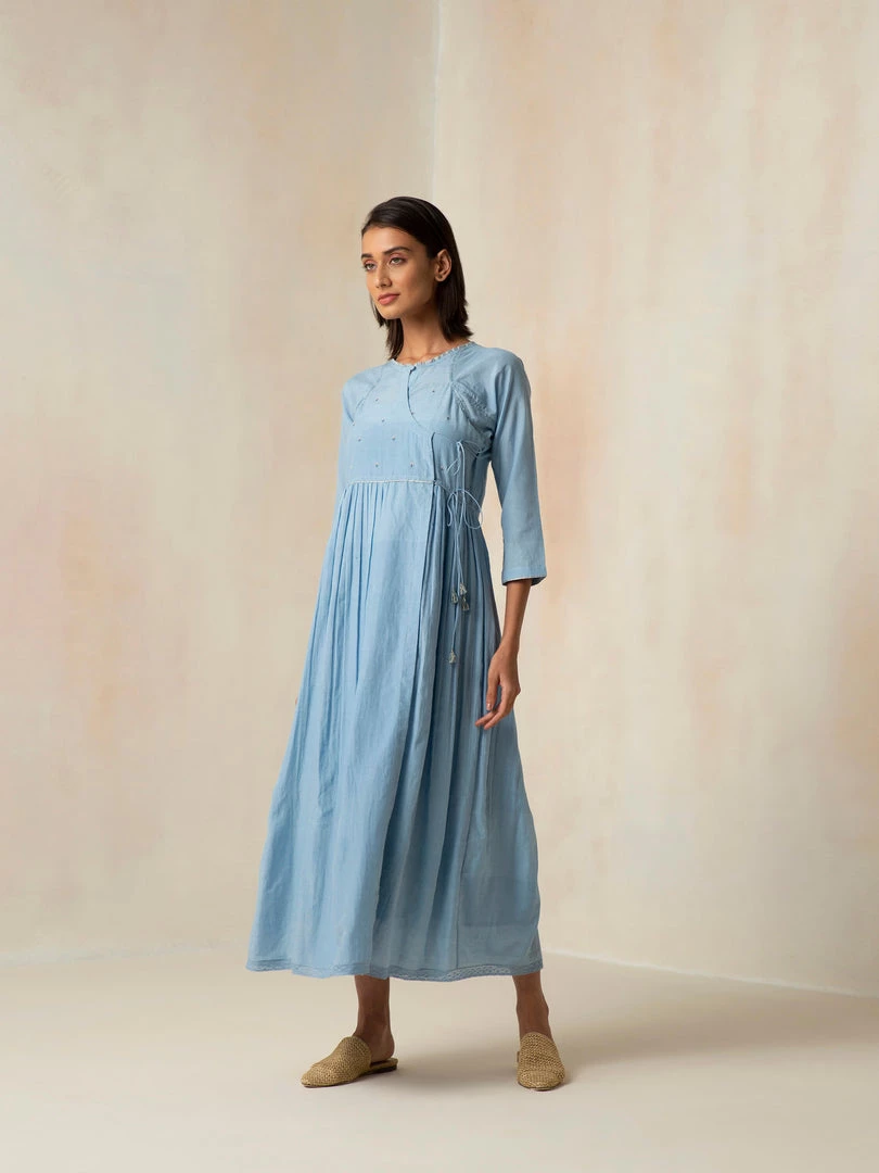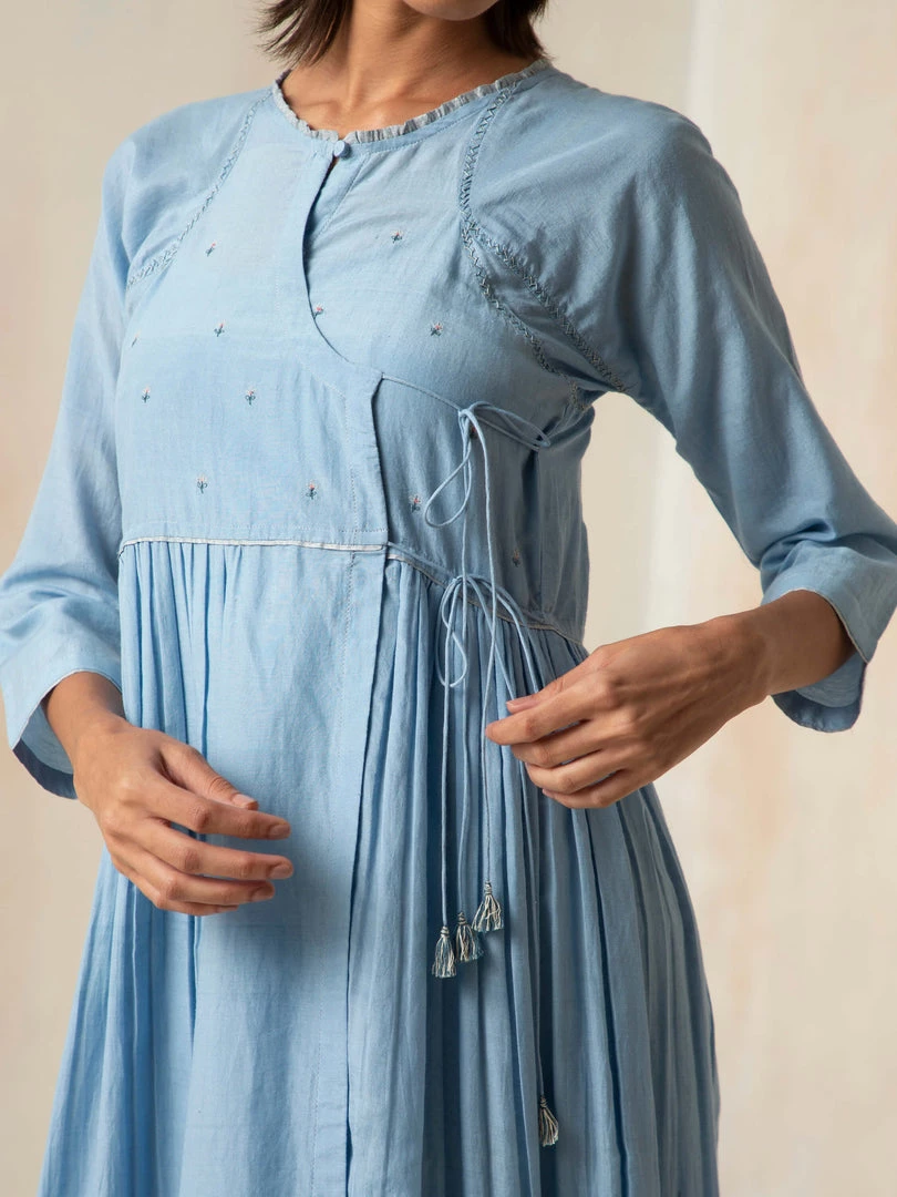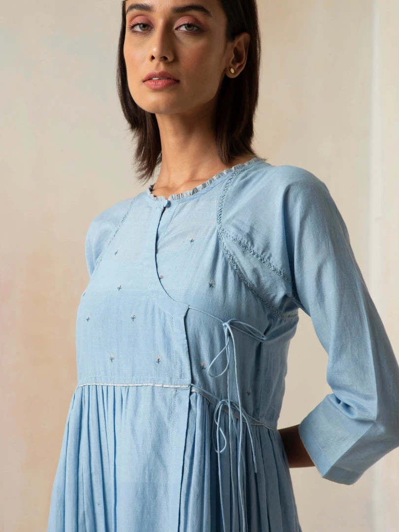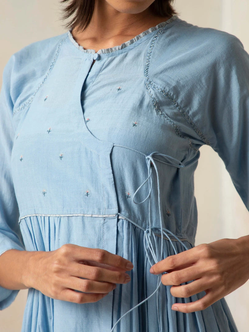 Dream weaves and cloudy skies, a dress that encapsulates both. It features an Angarakha silhouette and tie-ups. The dress is accentuated with mini floral embroidery.