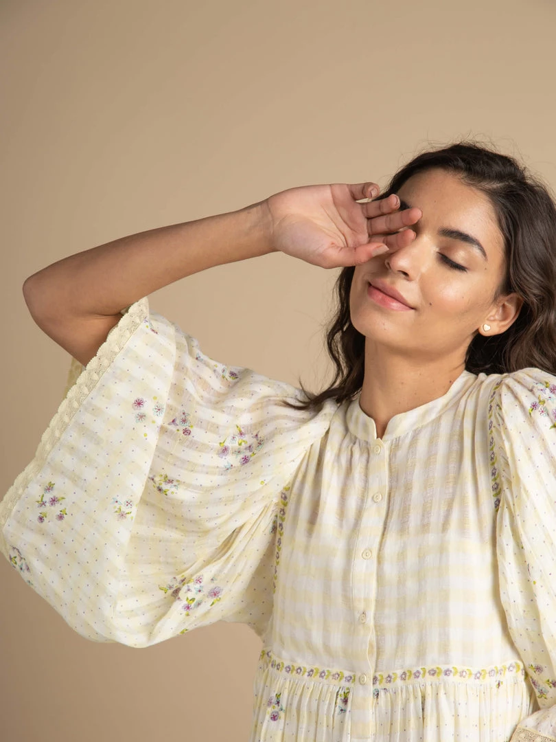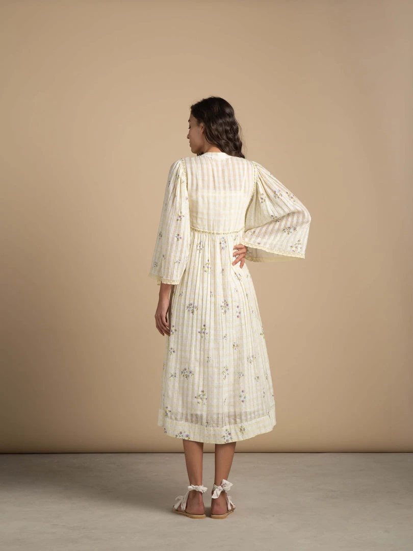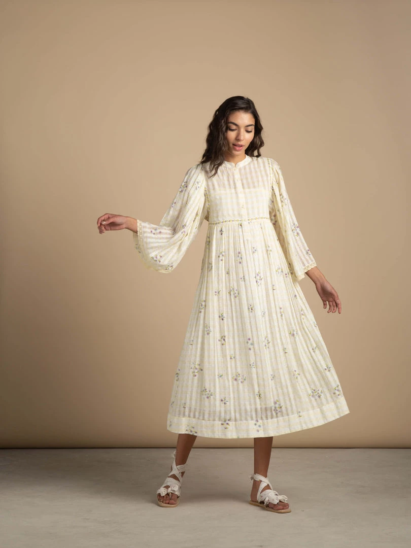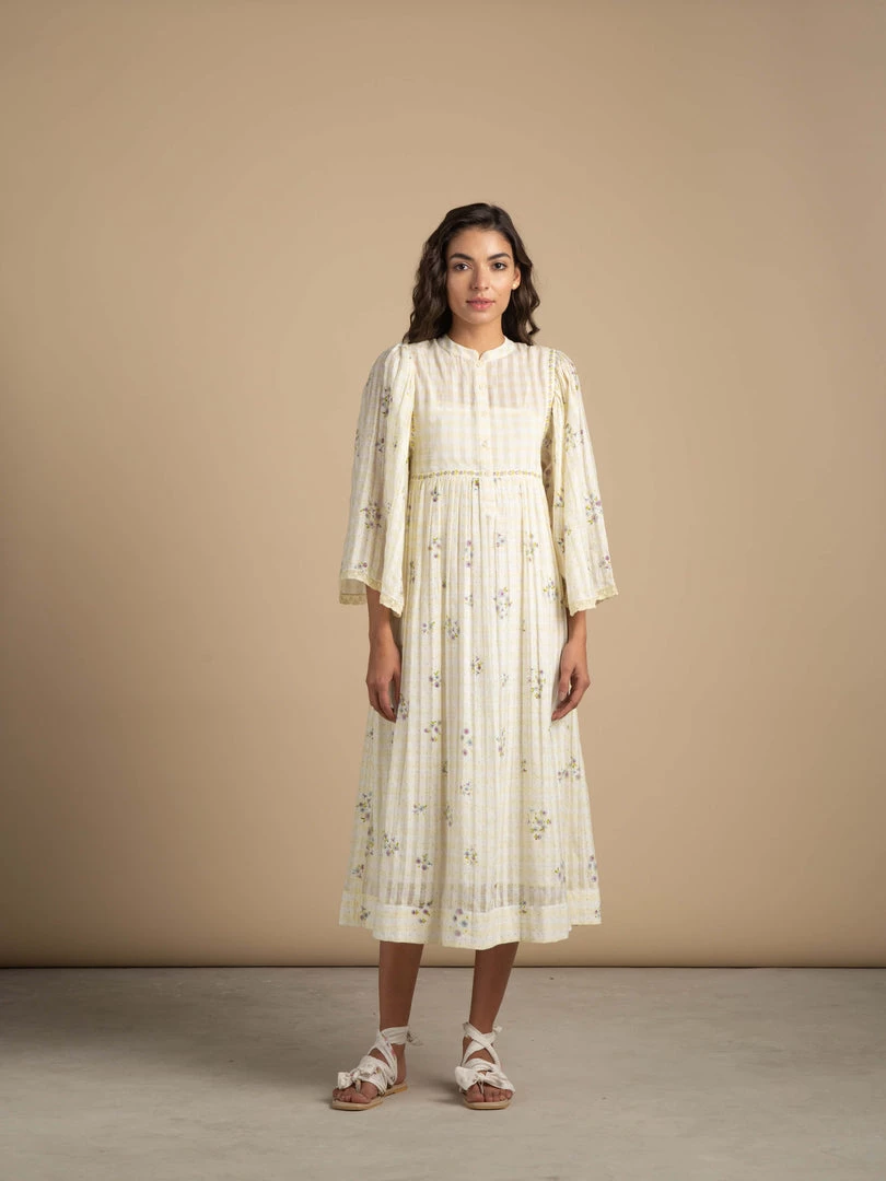 Our most loved silhouette with pastel lemon hues comes with pleated angel sleeves and mandarin collar which flows into a floral midi hem. Crafted from light and airy cotton check gauze fabric with trailing florals on the empire line and armhole lend it an alluring romantic vibe.