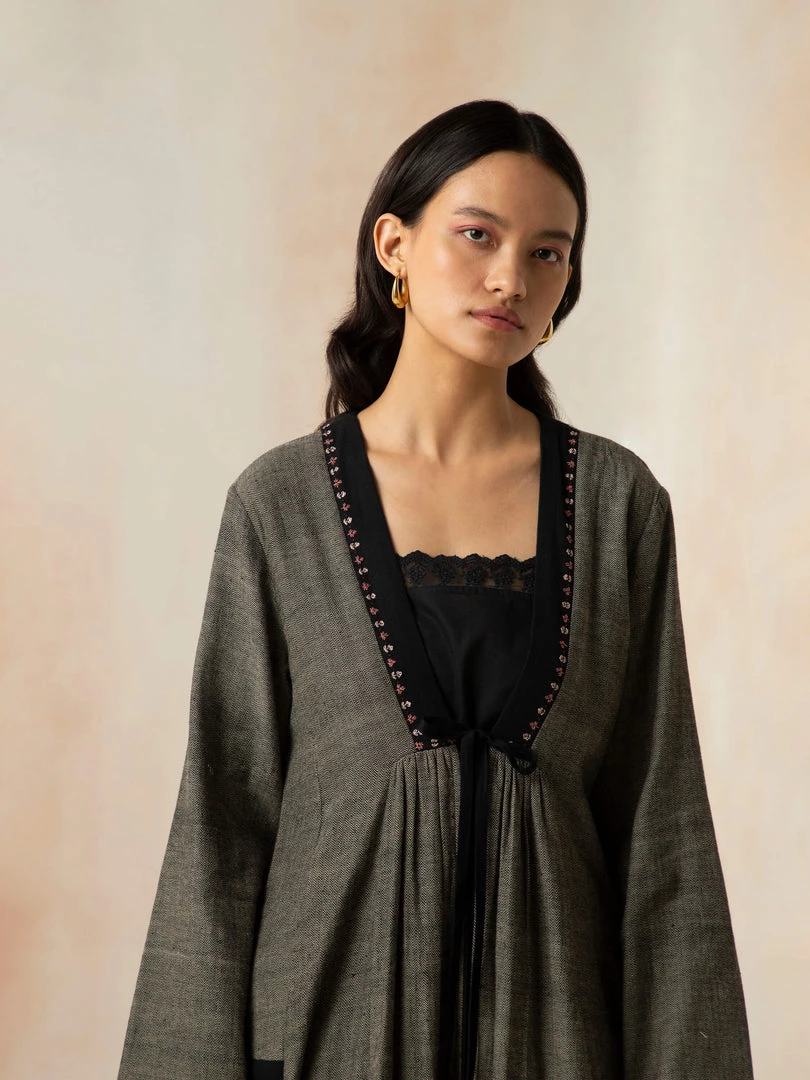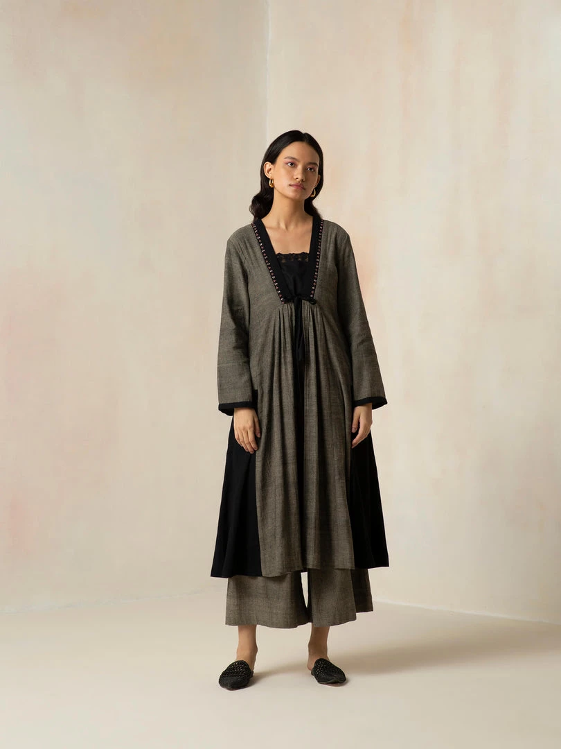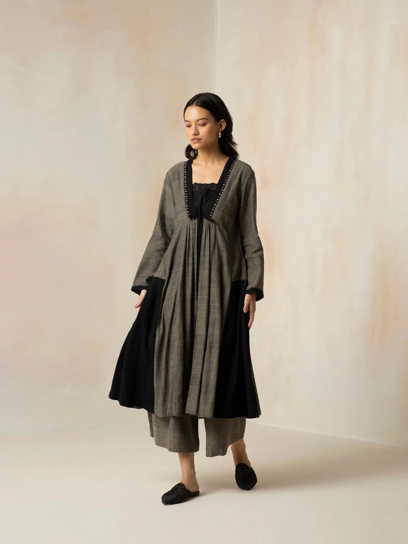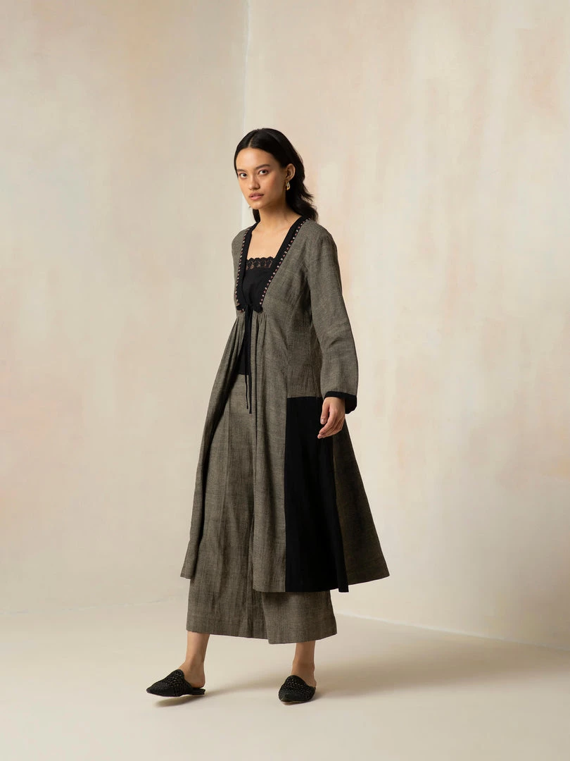 Music does not need language of words for it has movements of dance to do its translation. We waltz into this season with this versatile color blocked overlay jacket that features delicate hand embroidery and generous pockets.