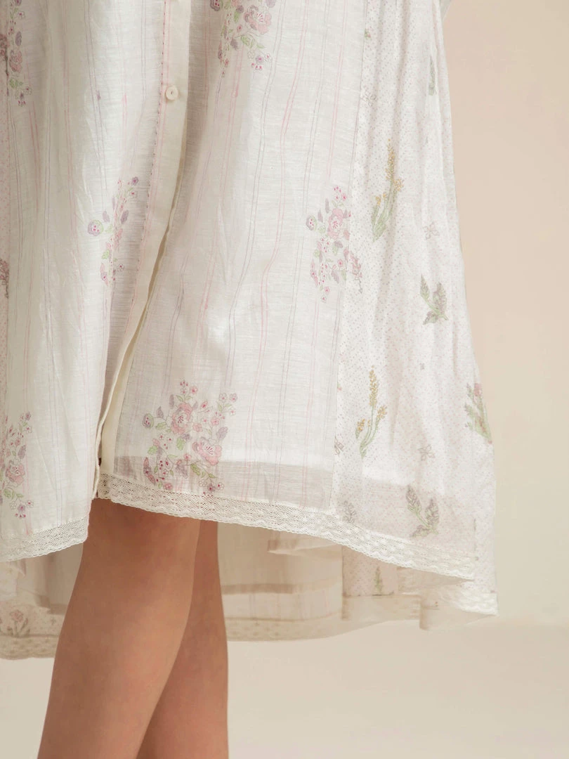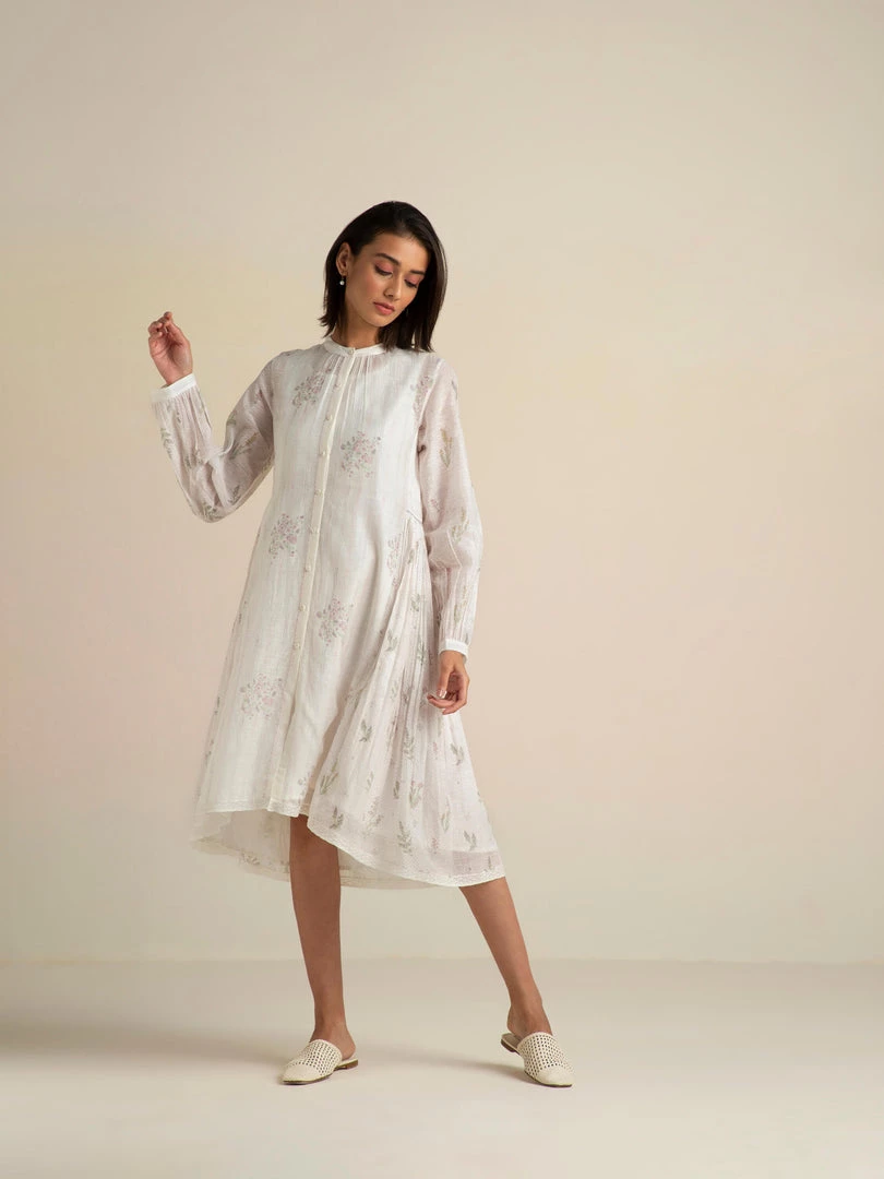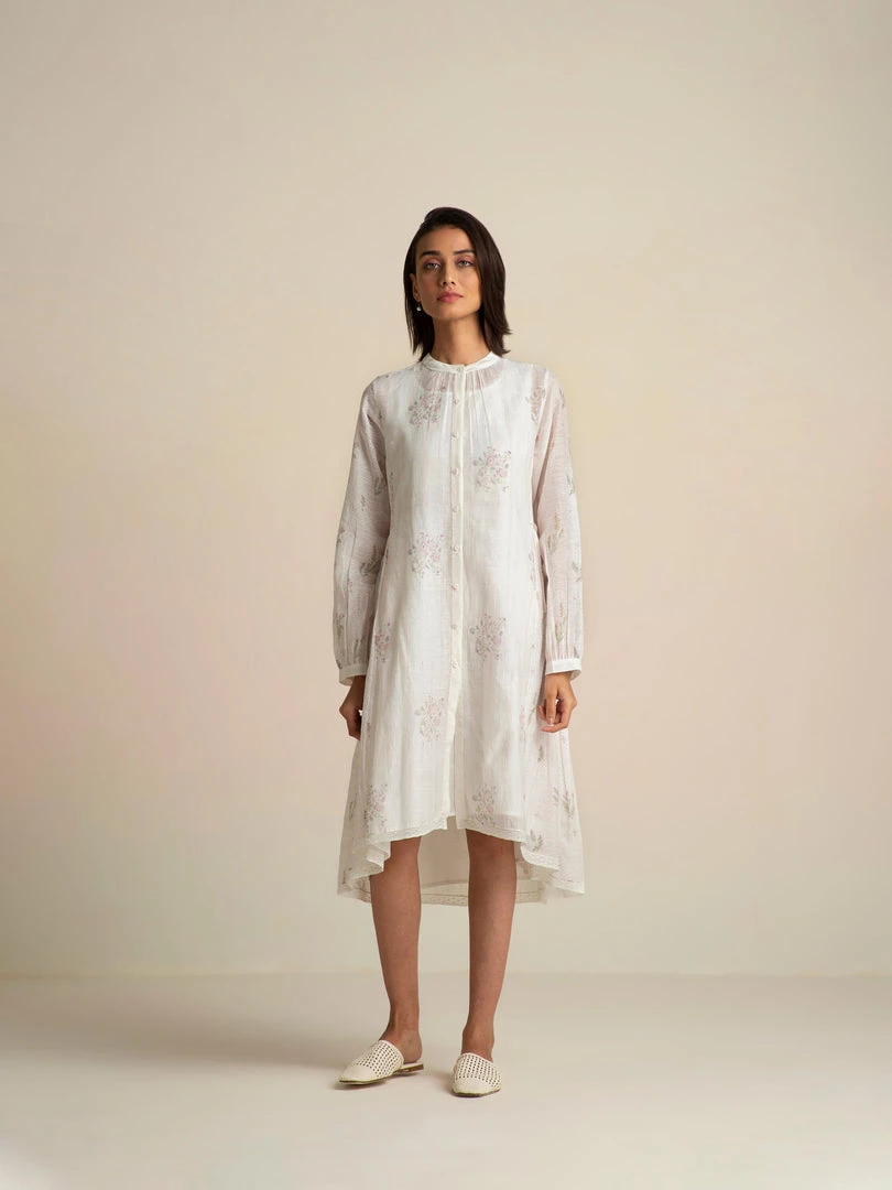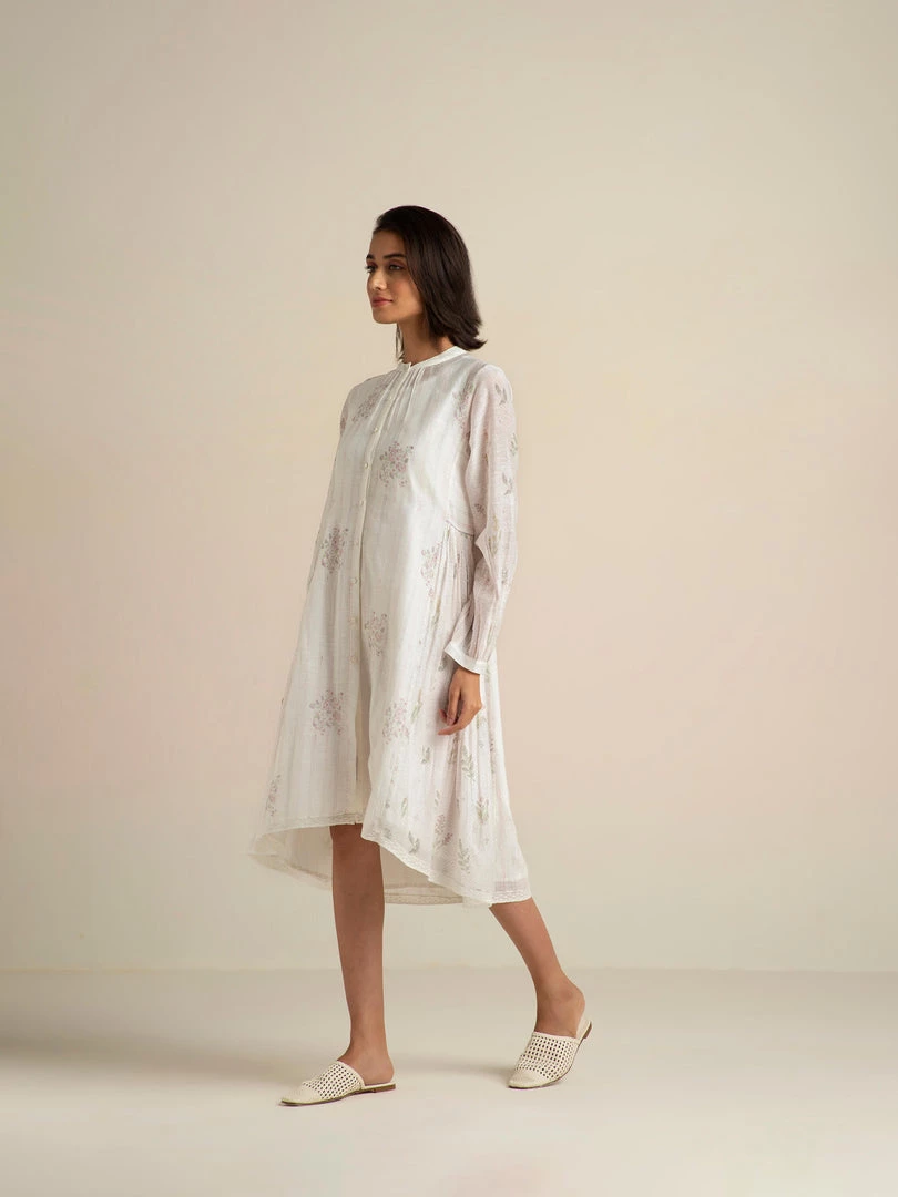 Our Fading Violets High Low Dress comes with an asymmetrical hemline, delicate lace edgings and a flattering front open collar design with hand embroidered buttons. This relaxed fit roomy shirt dress is made from handmade cotton silk fabric that gently drapes the body and comes with a slip dress.