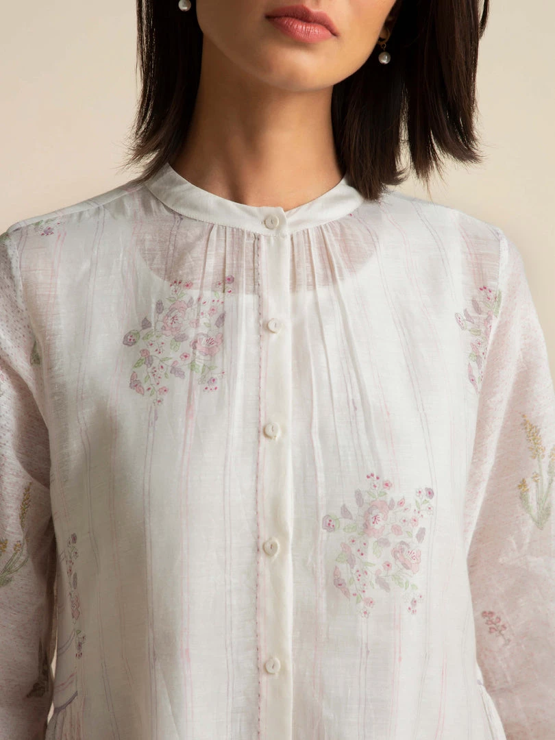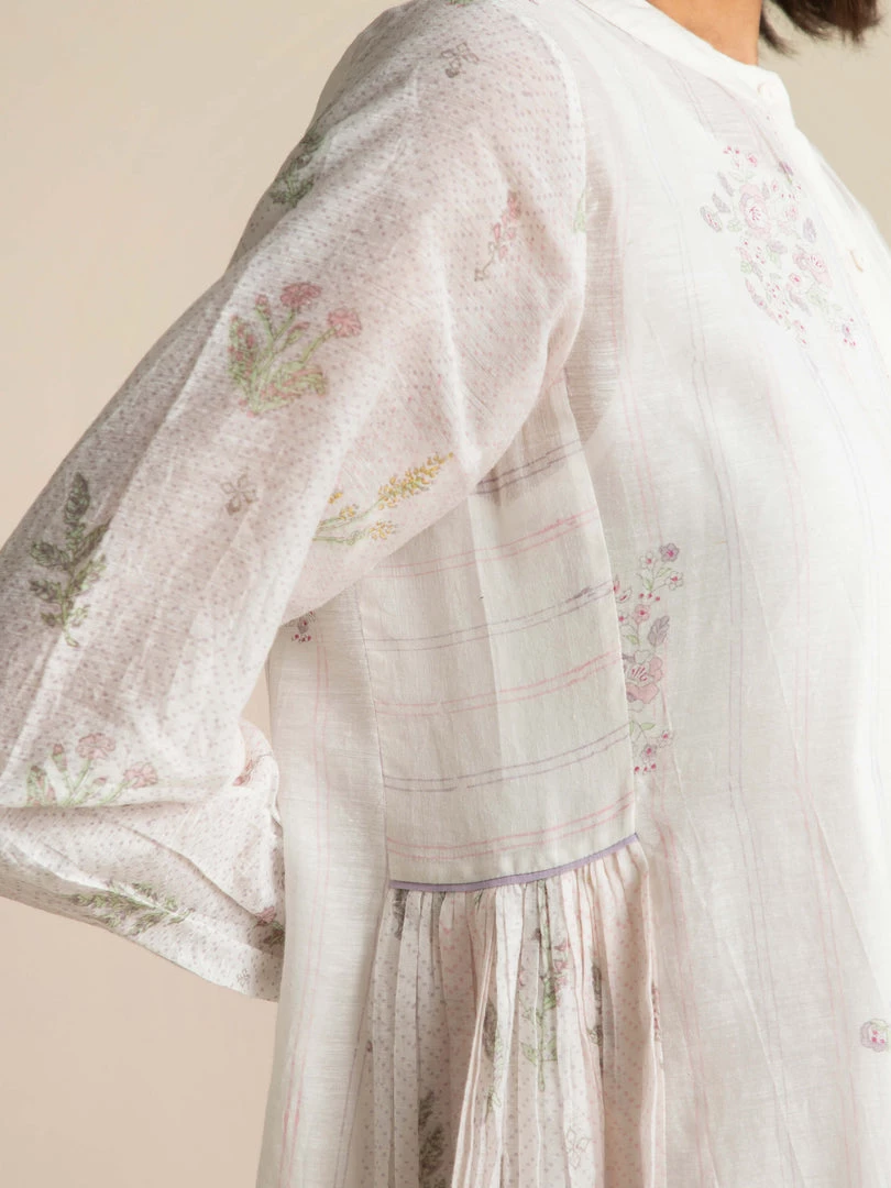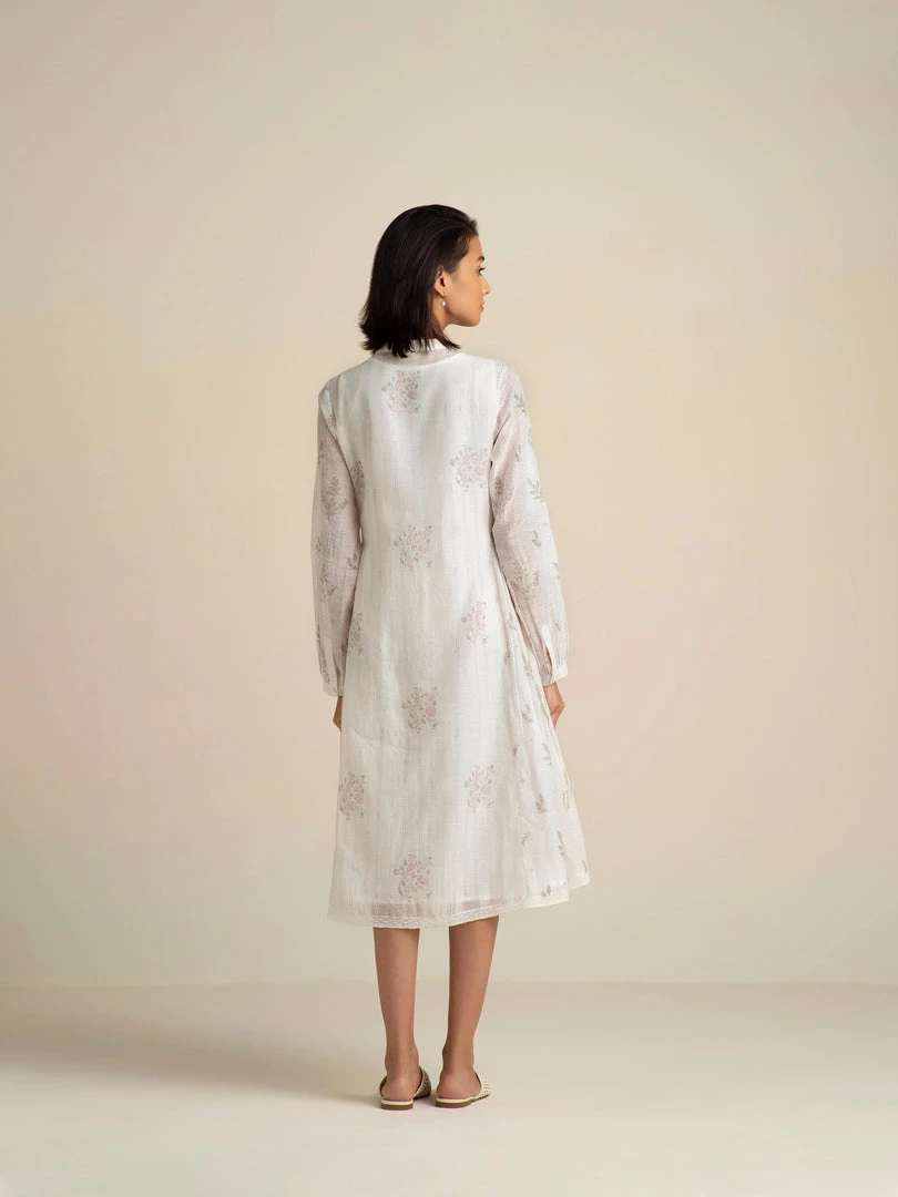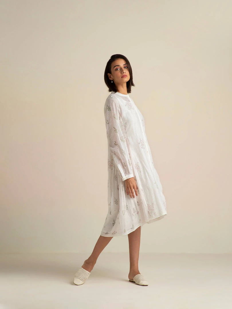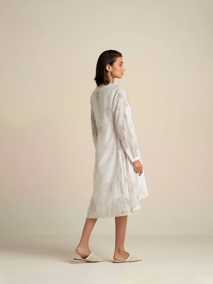 Our Fading Violets High Low Dress comes with an asymmetrical hemline, delicate lace edgings and a flattering front open collar design with hand embroidered buttons. This relaxed fit roomy shirt dress is made from handmade cotton silk fabric that gently drapes the body and comes with a slip dress.