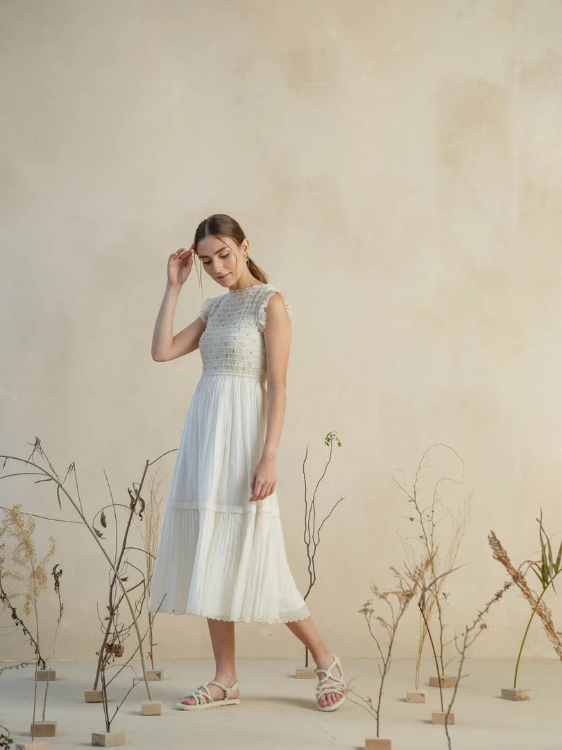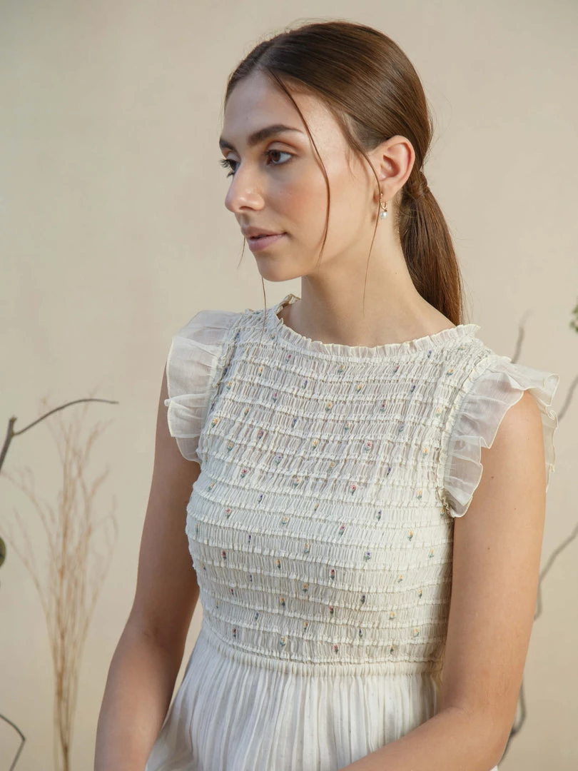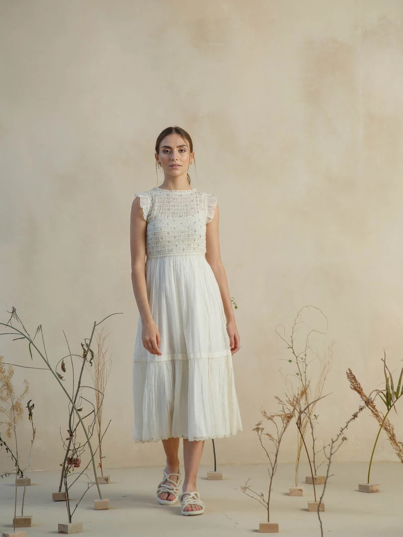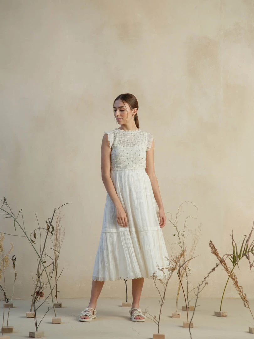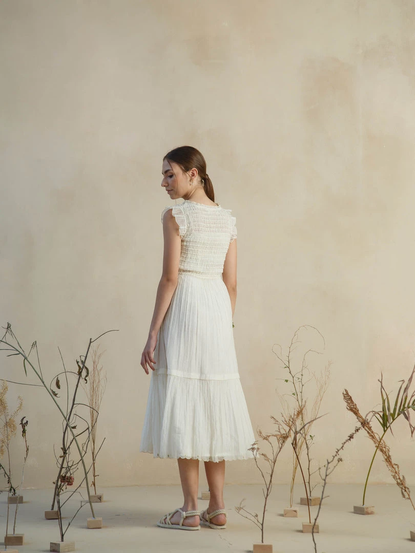 This softly smocked dress features flutter sleeves falling into a floaty tiered hemline finished with scallop embroidery. Lightweight and in the purest shade of white, this dress is a wardrobe go-to-companion through the high summer.