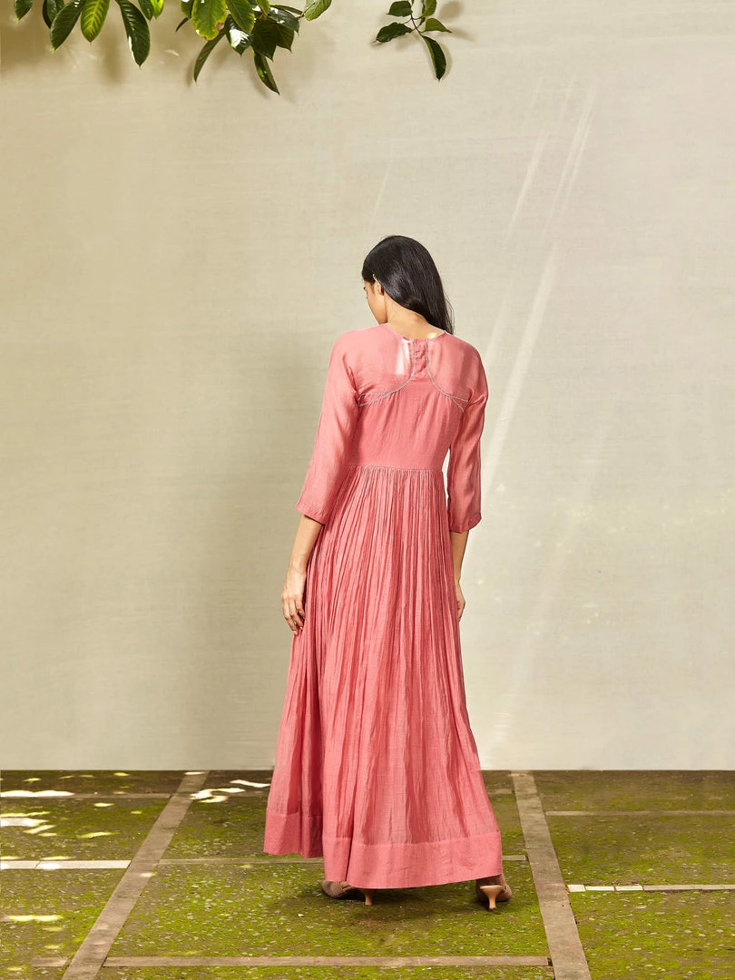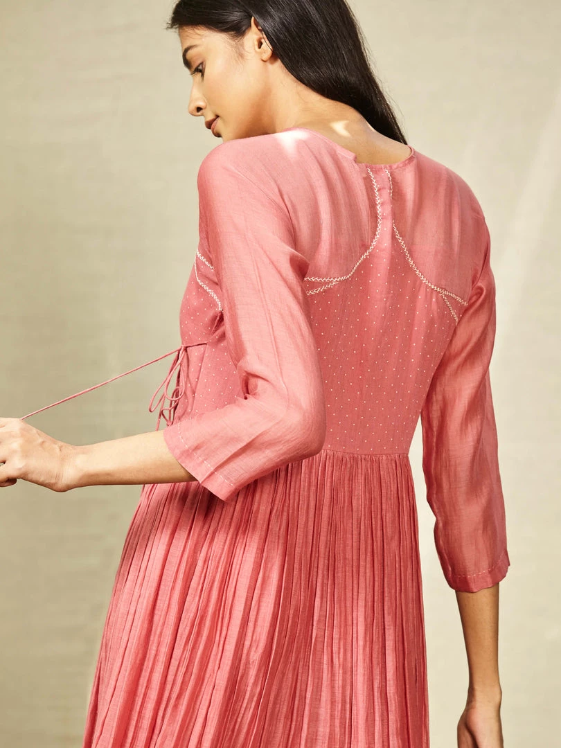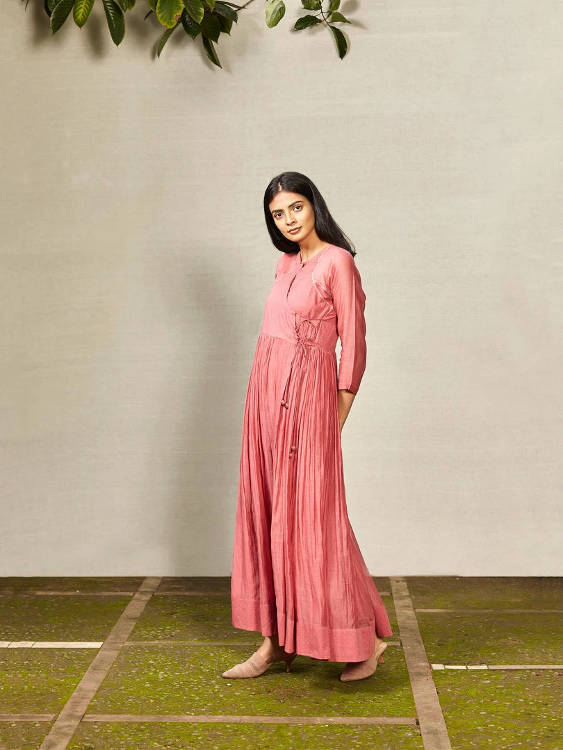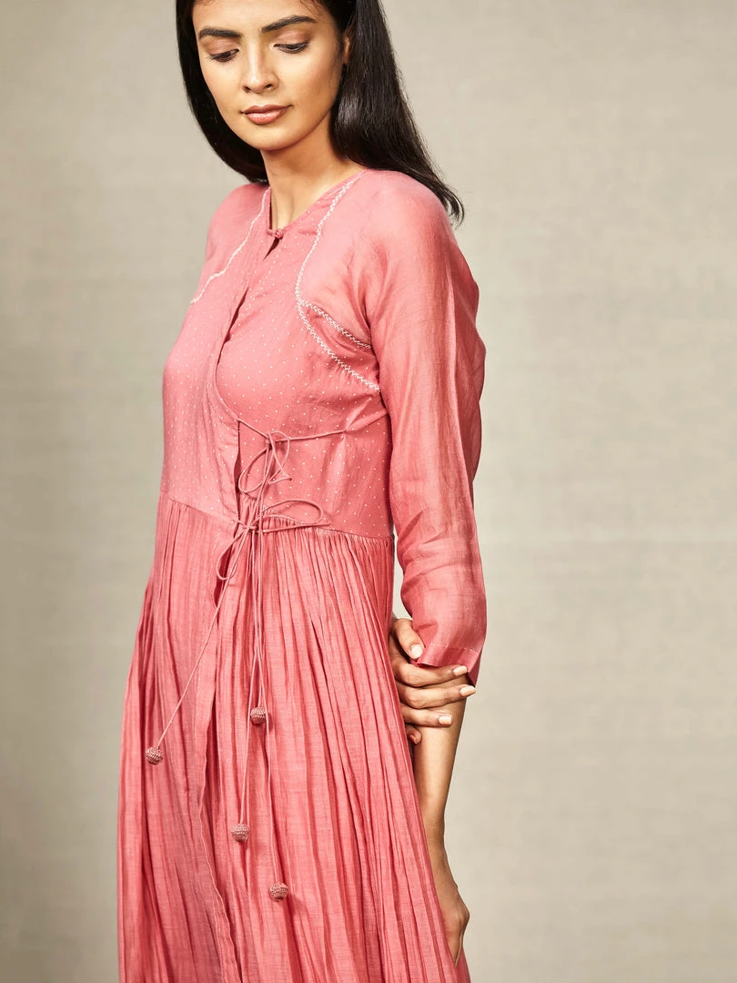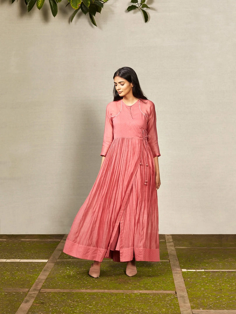 Ideal for formal as well as casual occasions, this flattering wrap dress comes with very delicate handwork and crochet pom-pom tie-ups. Abundant gathers below the waist line lend it timeless charm. It is made in natural Chanderi fabric and comes with a slip dress inside.