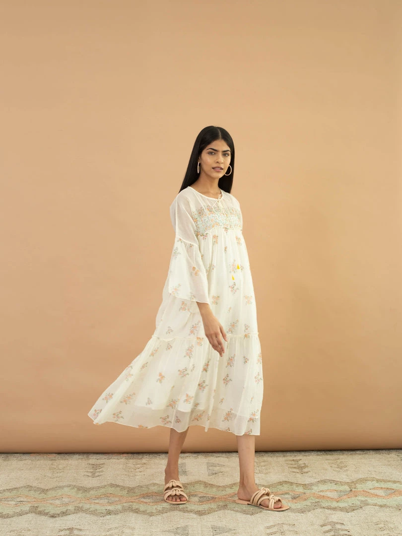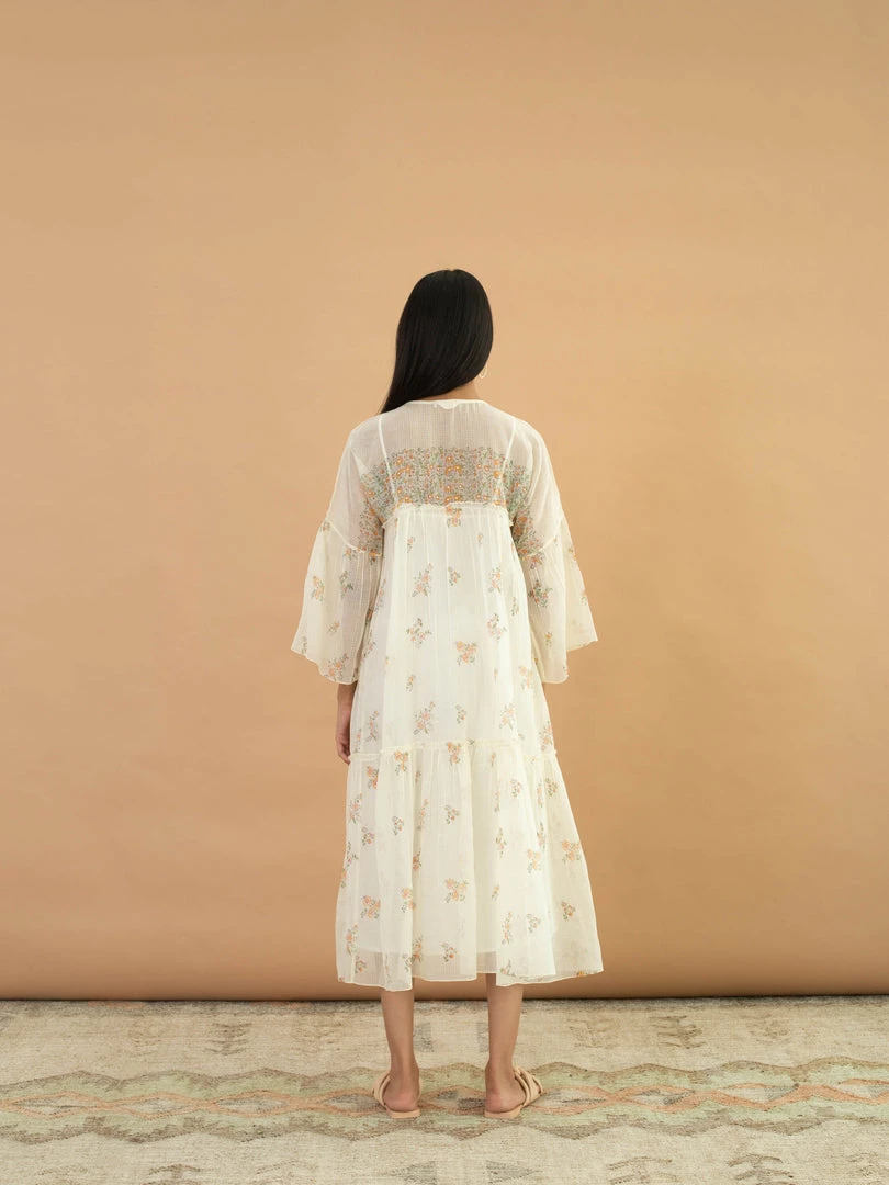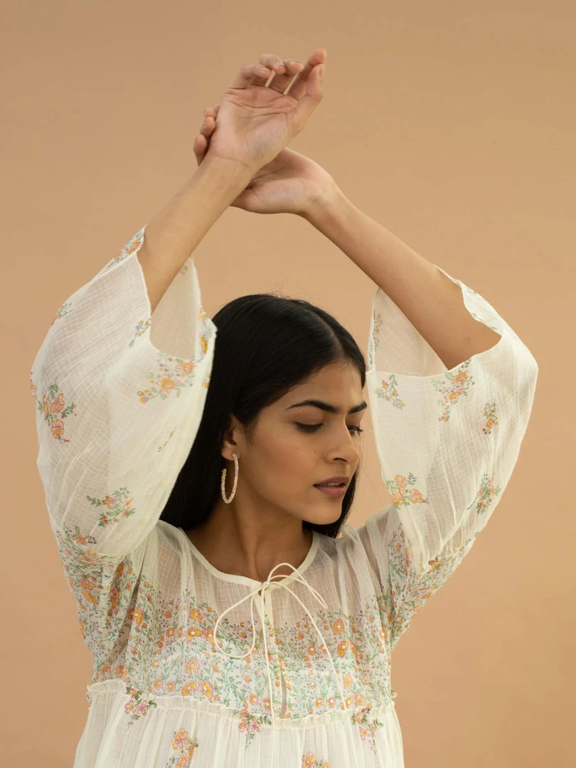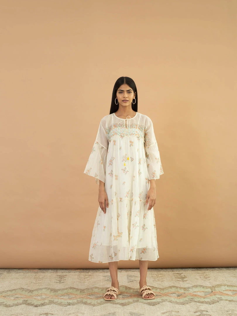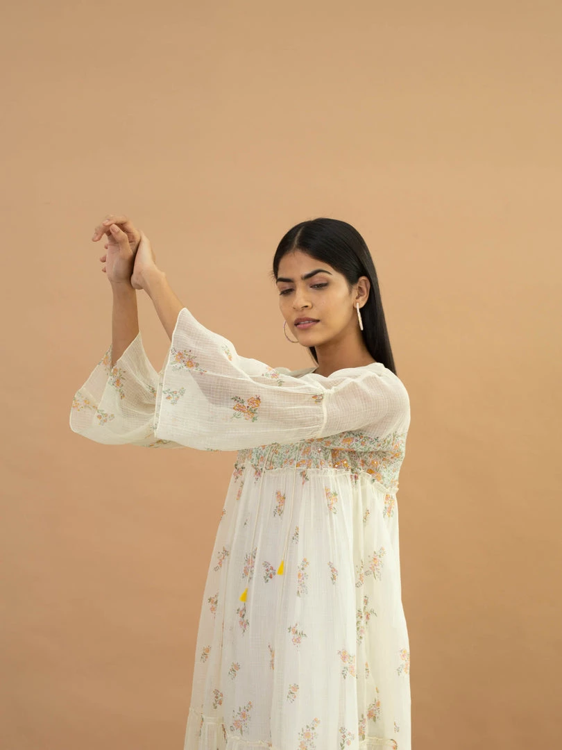 Handcrafted in beautiful kota doria textile of India in a luxurious shade of ivory, this dress is strewn with tender floral prints. Â