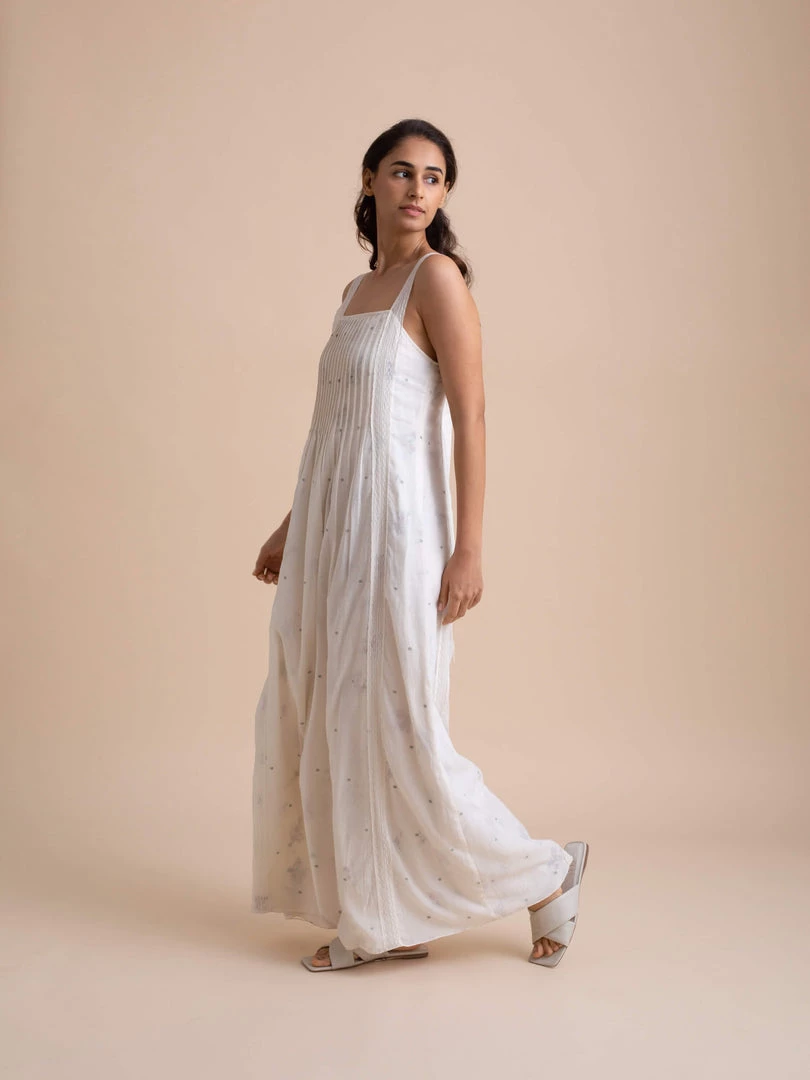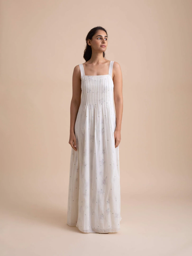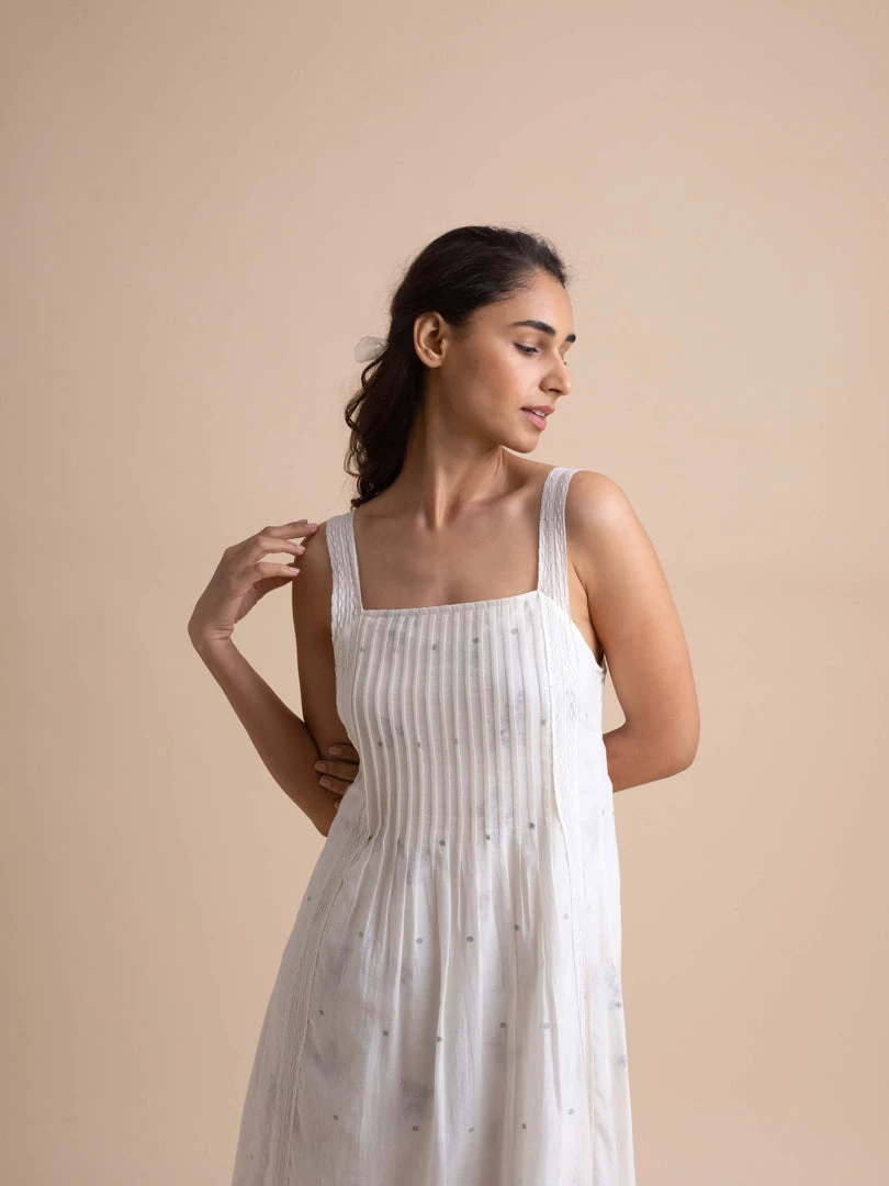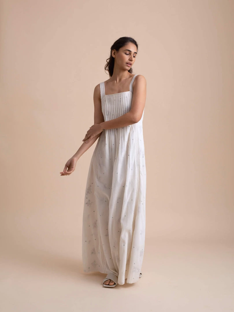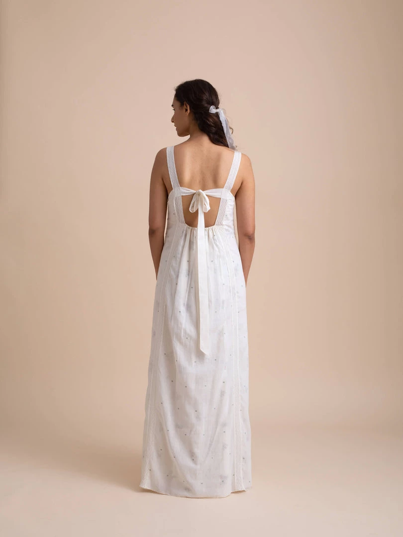 Our flowing and flirty maxi dress features lace inserts and exposed back bow details. Made in Jamdani fabric with woven dots, pin-tuck pleats and a floral block printed lining inside, it has all the right summer vibes. The florals peep through the ultra light weight cotton. The back has a bow tie-up and is elasticated for comfort and fit.