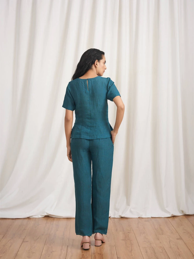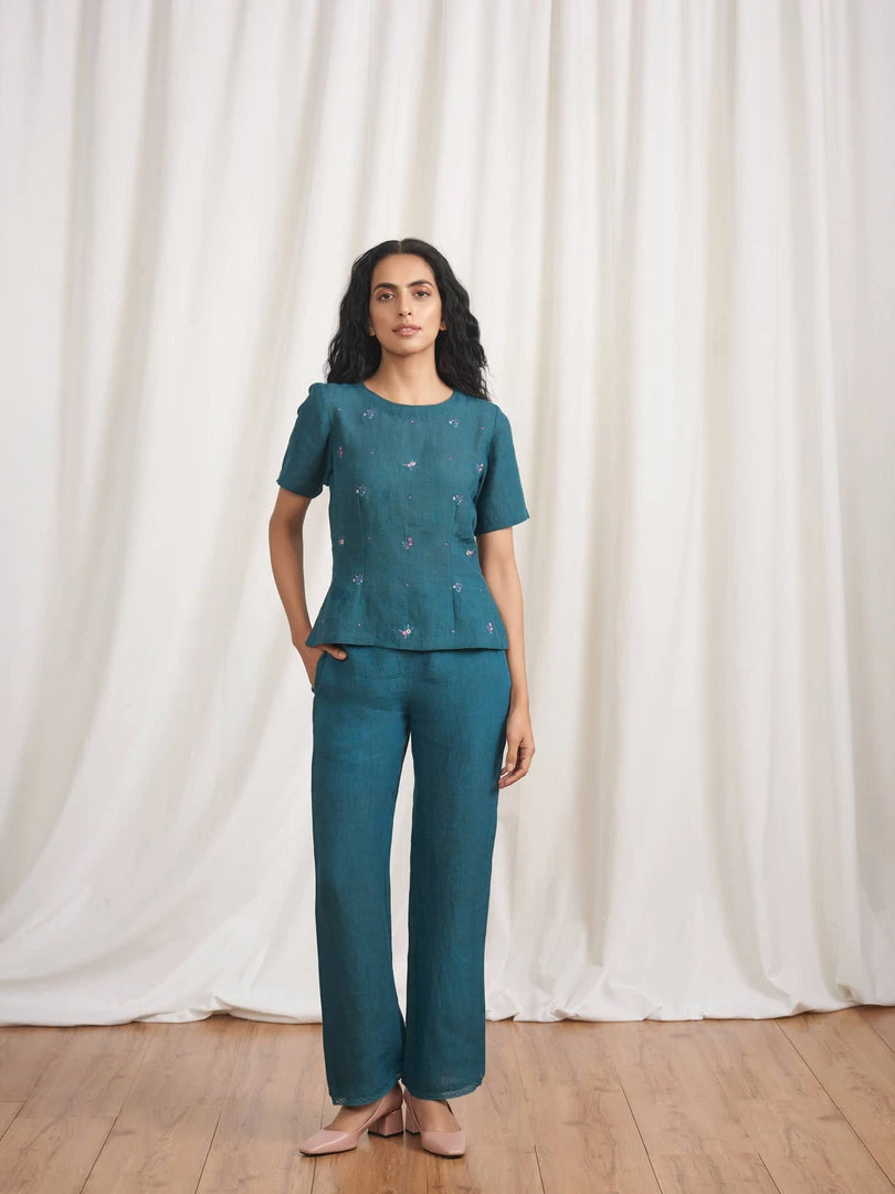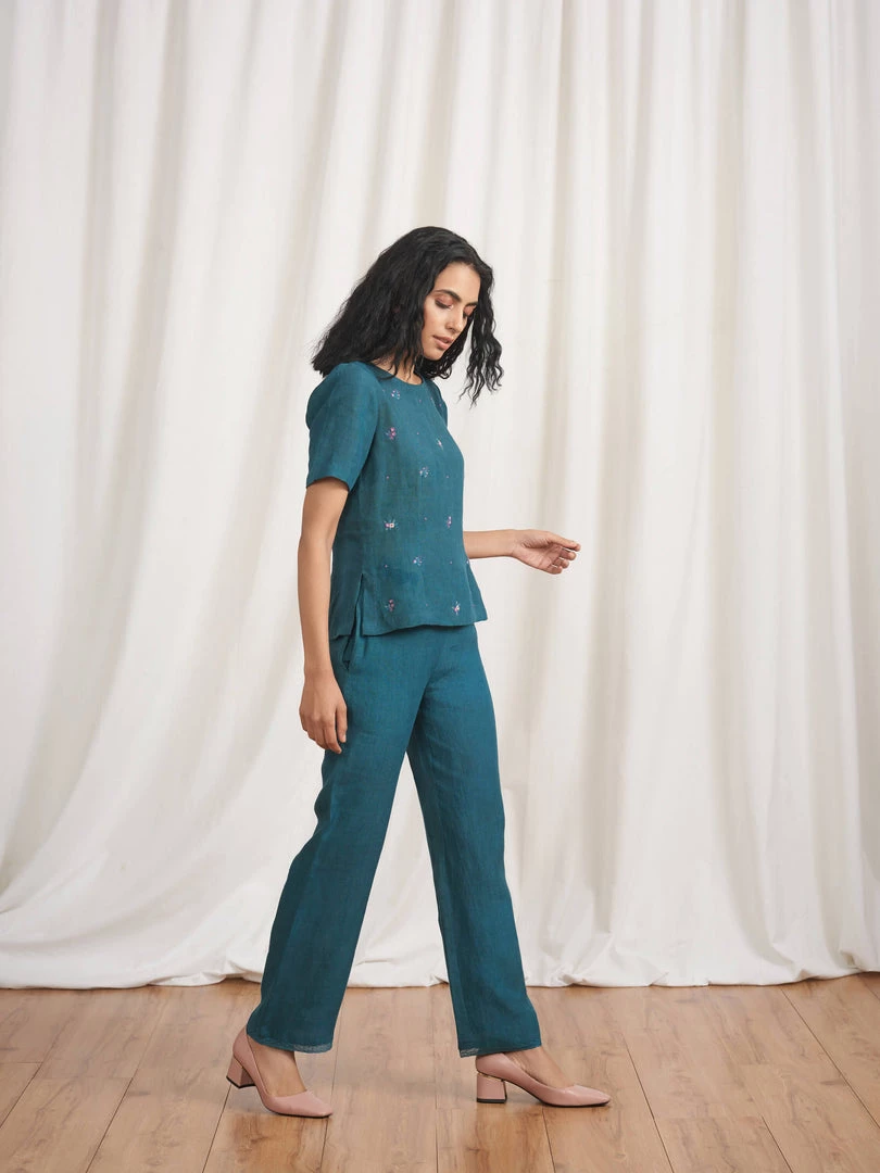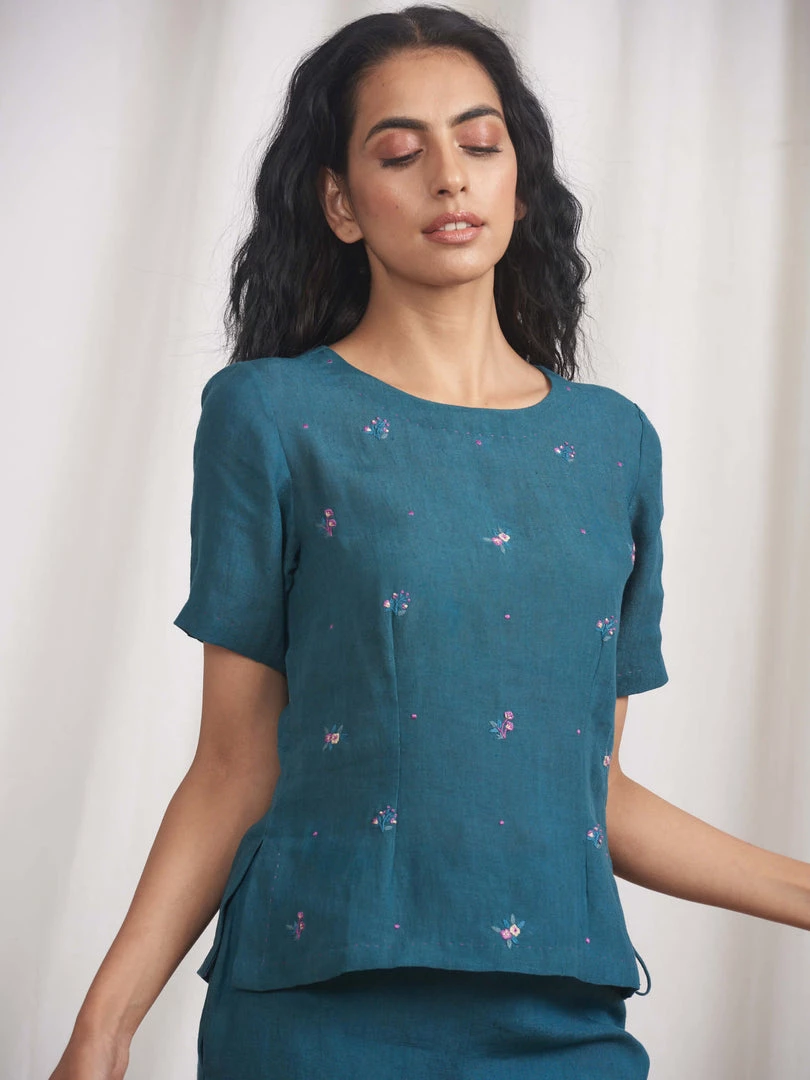 Our round neck top in deep emerald green with dainty floral embroidery is a wardrobe staple for this season. Made in 100% handwoven linen fabric, this top has details like small slits, button closures on neckline and contrast colour hemming stitches. It ideally pairs with our linen pants (K15).