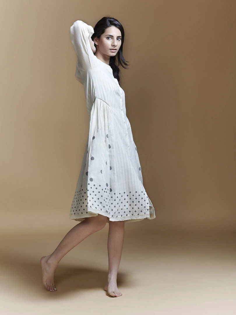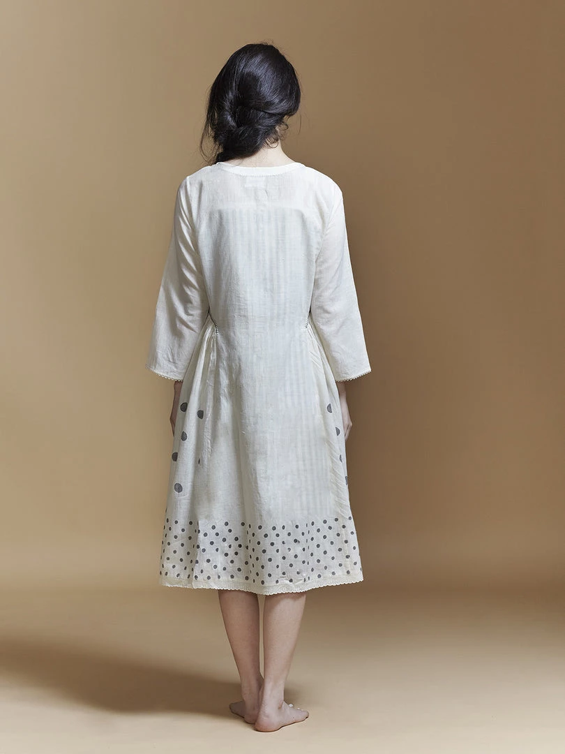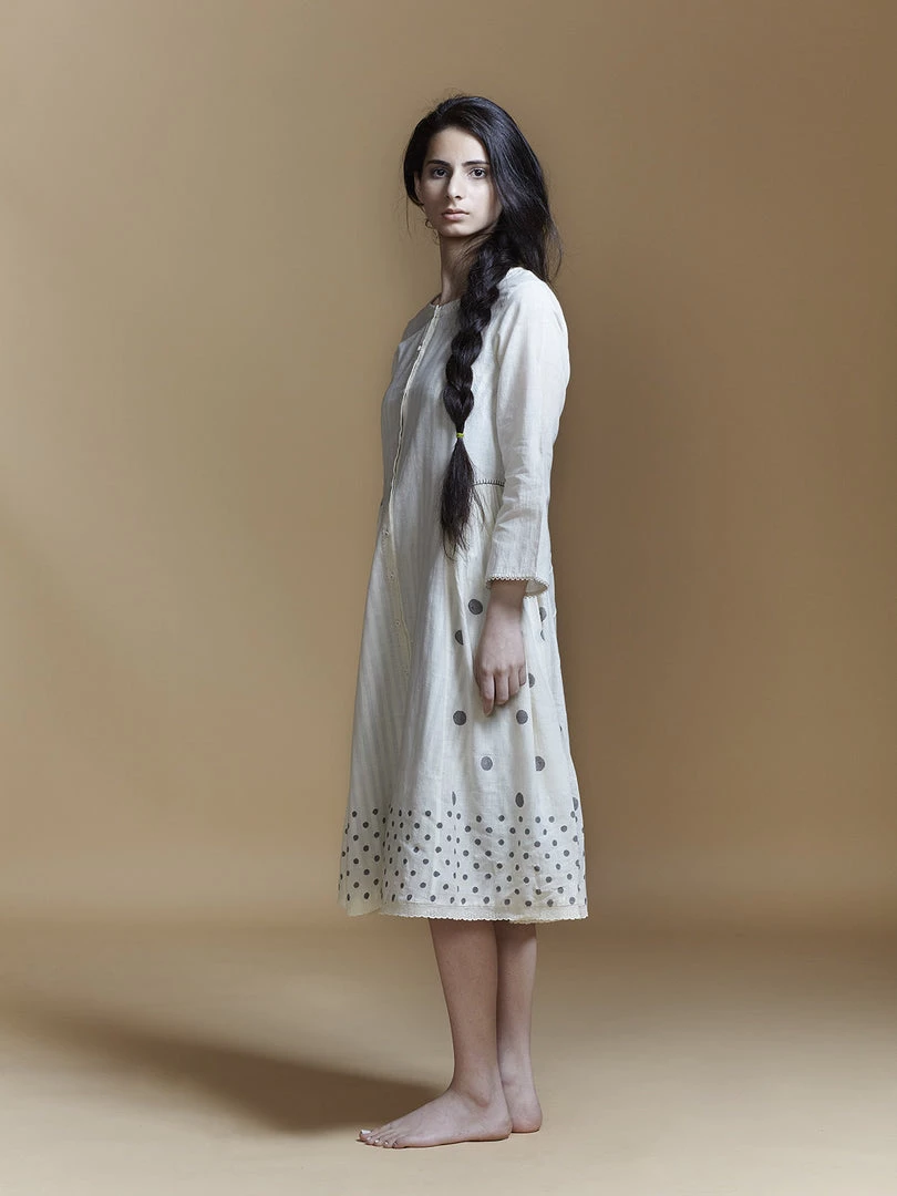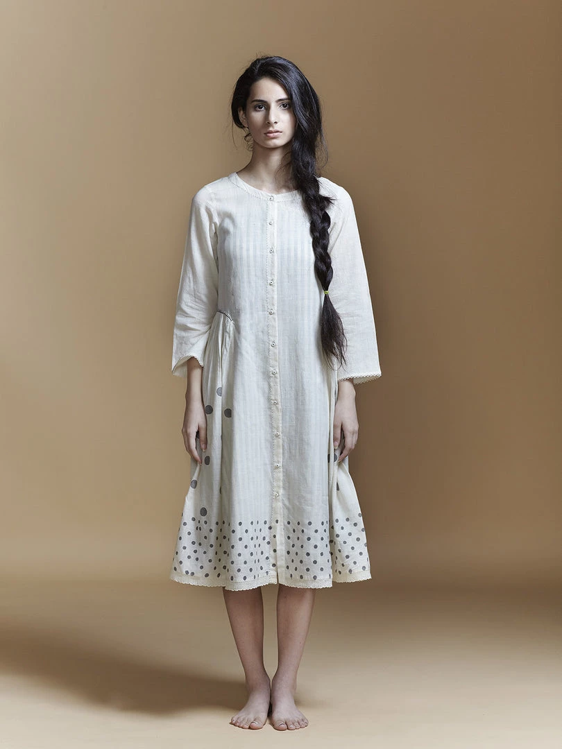 This front open handwoven dress with polka dots and grey striped lace-slip is easy day wear. It can be worn buttoned up or like a light open overlayer. It’s breathable, earthy and fun.Â