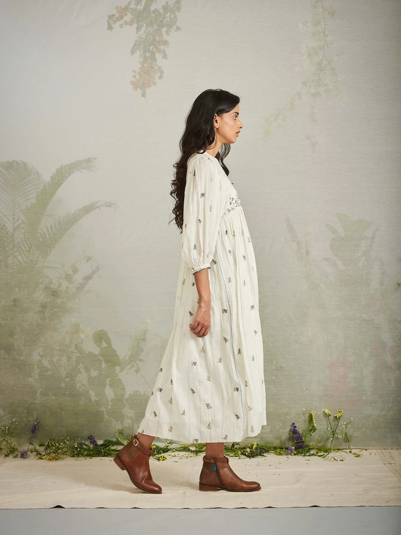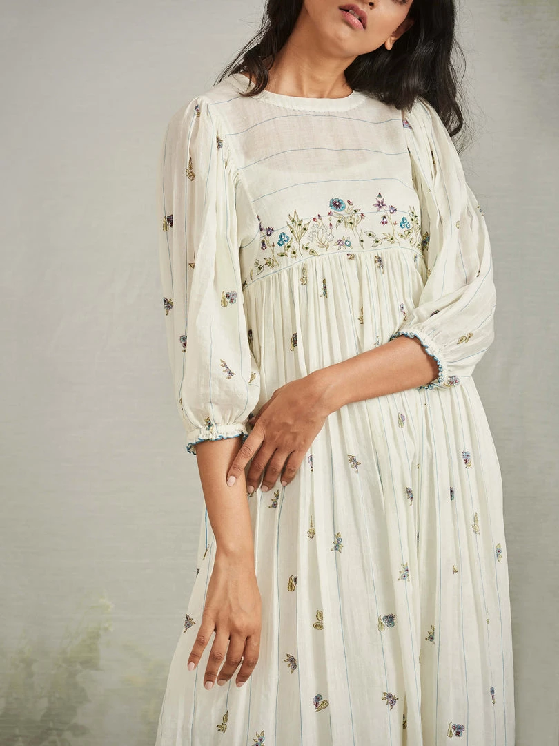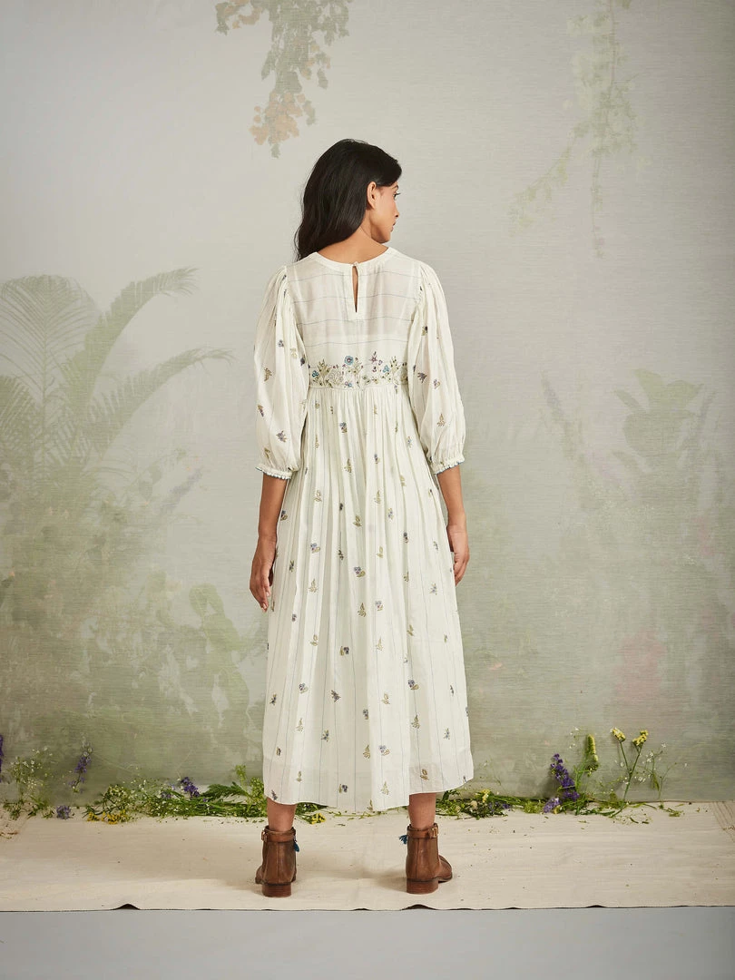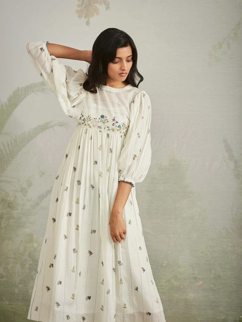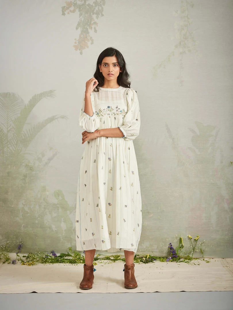 A midi dress that makes for a picture-perfect choice for solo picnic days featuring a round neckline. A bed of gentle, hand block printed florals lay strewn at the empire waistline adorned with tiny beads and French knots. Flowy bishop sleeves with elasticated cuffs and gentle gathers allow the dress to double up as a natural answer for days of toil.