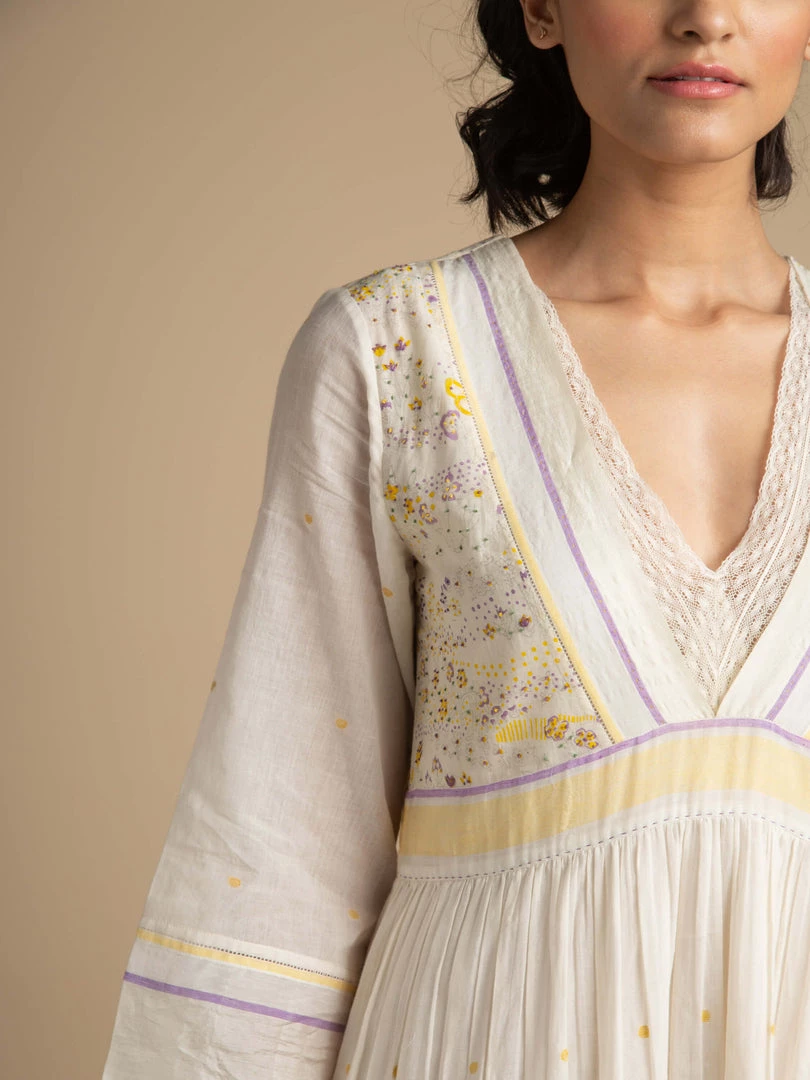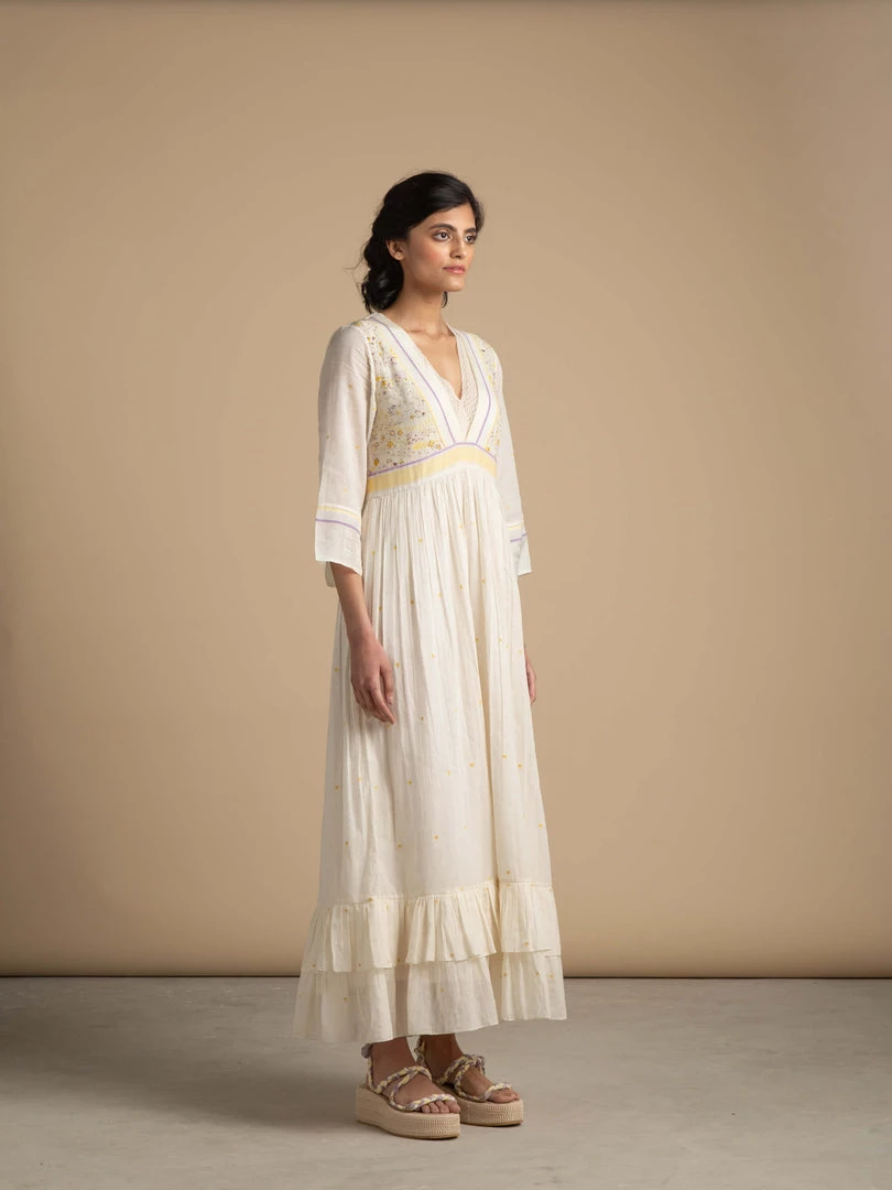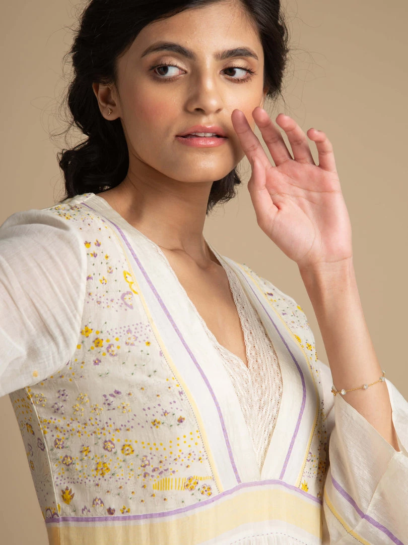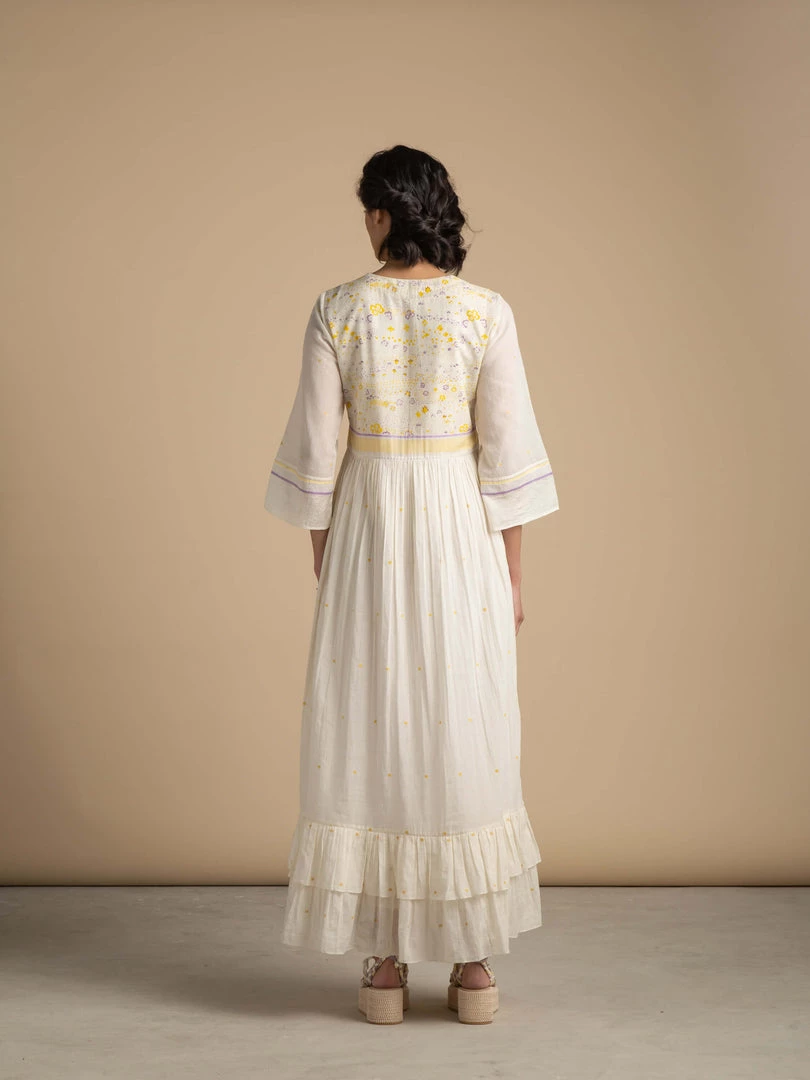 Create a poetic impression with our light weight and airy lace maxi dress. The hand embellished floral print, striped empire waist and bell sleeves add a perfect touch of romanticism for the day time.