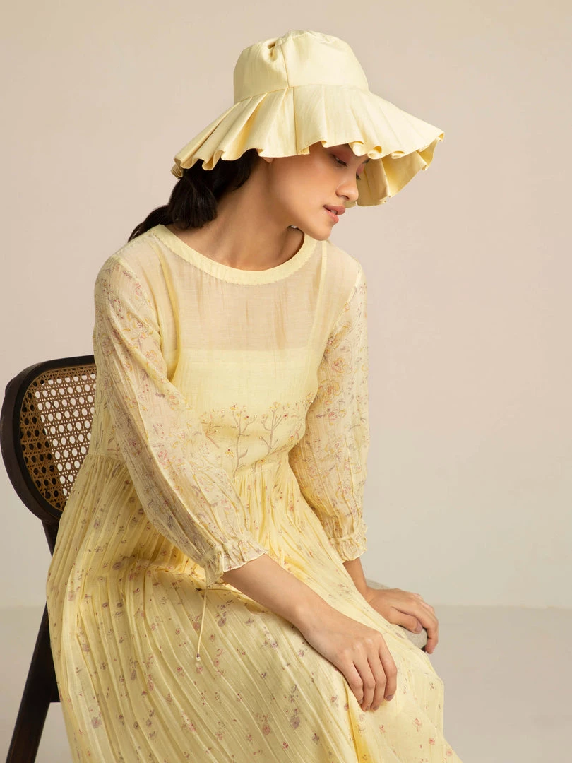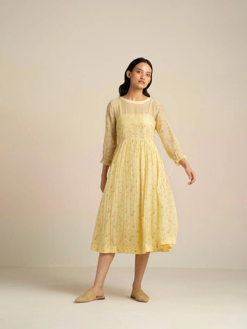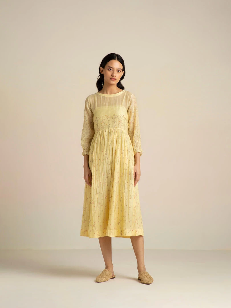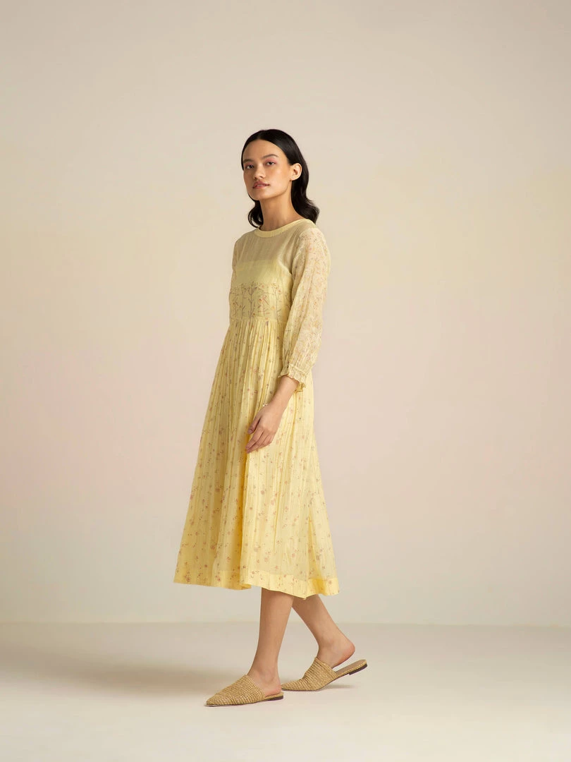 Handcrafted in gossamer cotton silk in a pastel yellow, this dress is strewn with delicate floral prints. The yoke is accentuated with bud twigs placement prints adding subtle drama to the form.Â