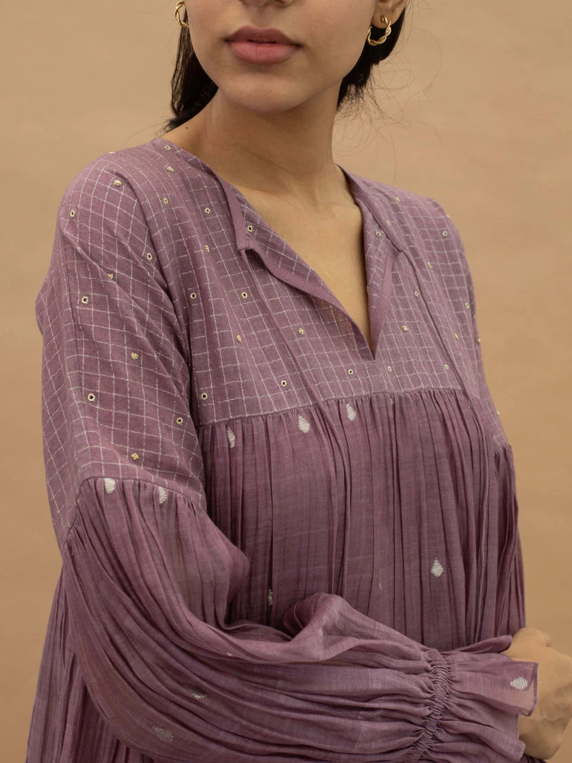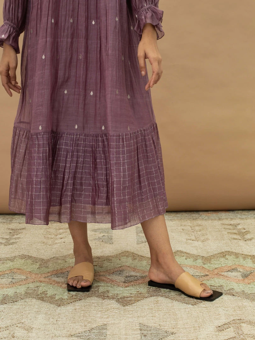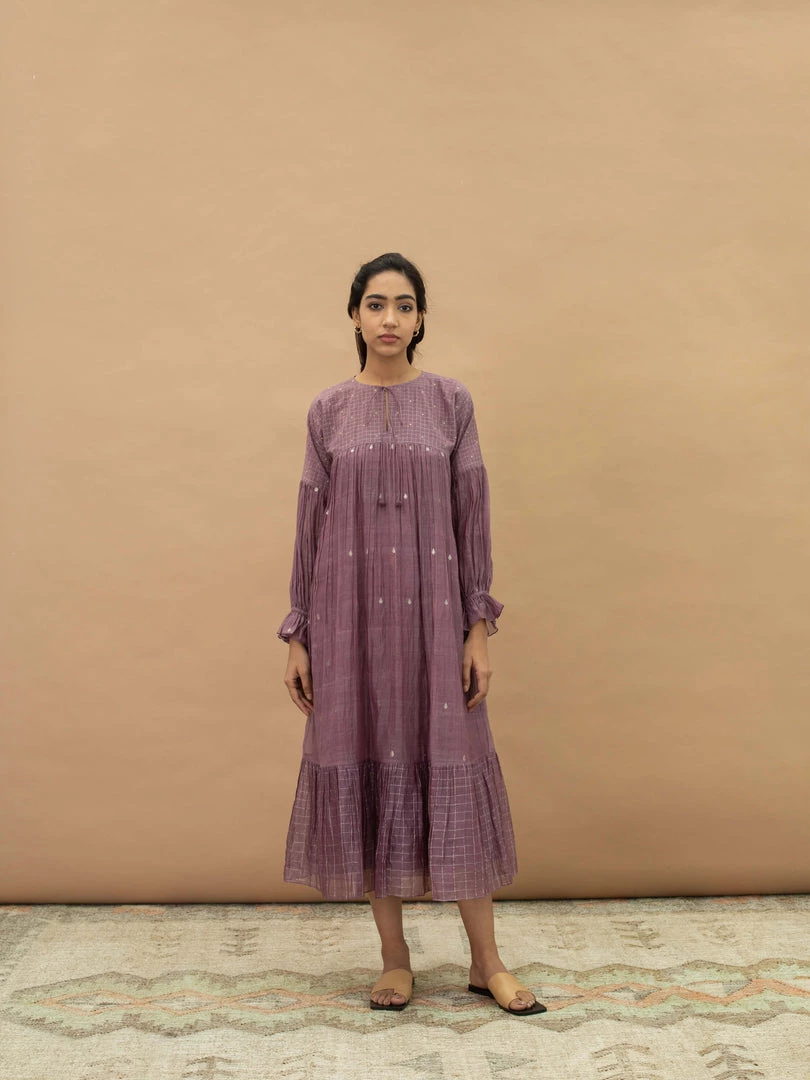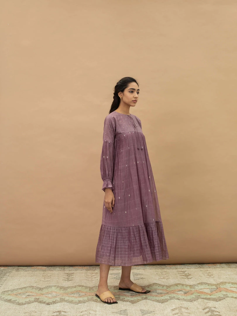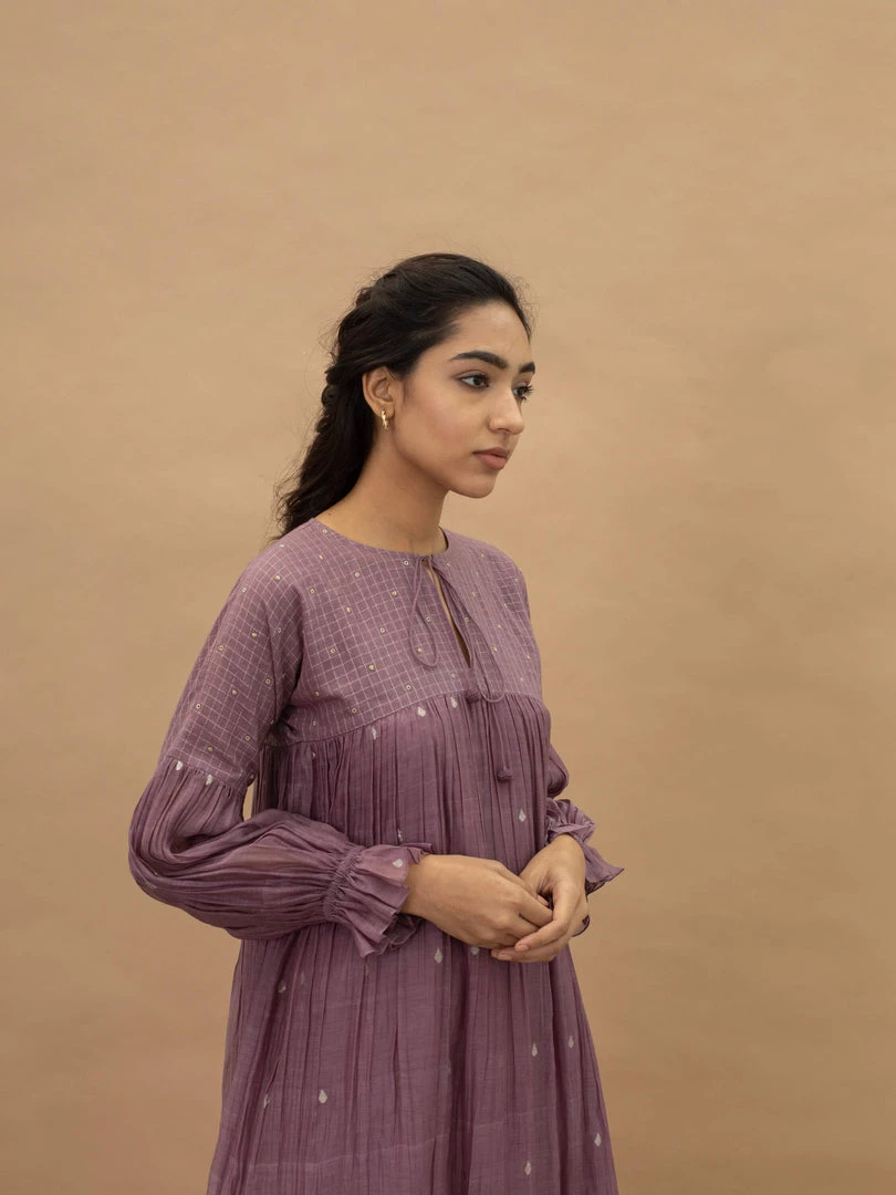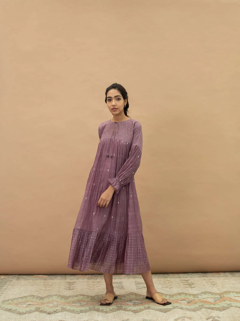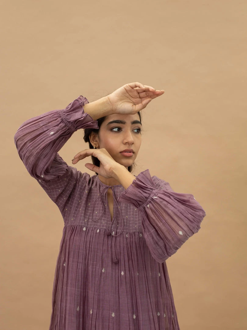 This romantic midi dress in a rich shade of plum features a round neck line with self-ties, flounced cuffs and a swirly hem. The yoke is hand embroidered with delicate eyelets and French knots. Wear it to evenings out or festivities with family.