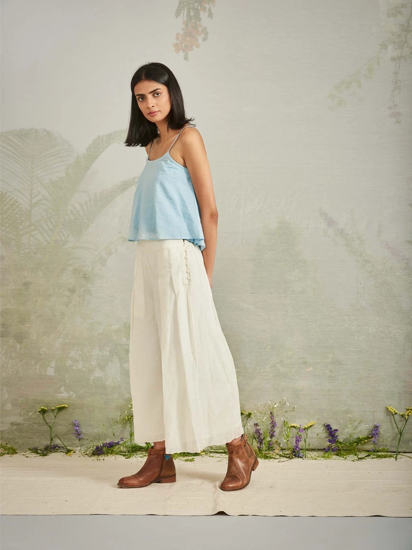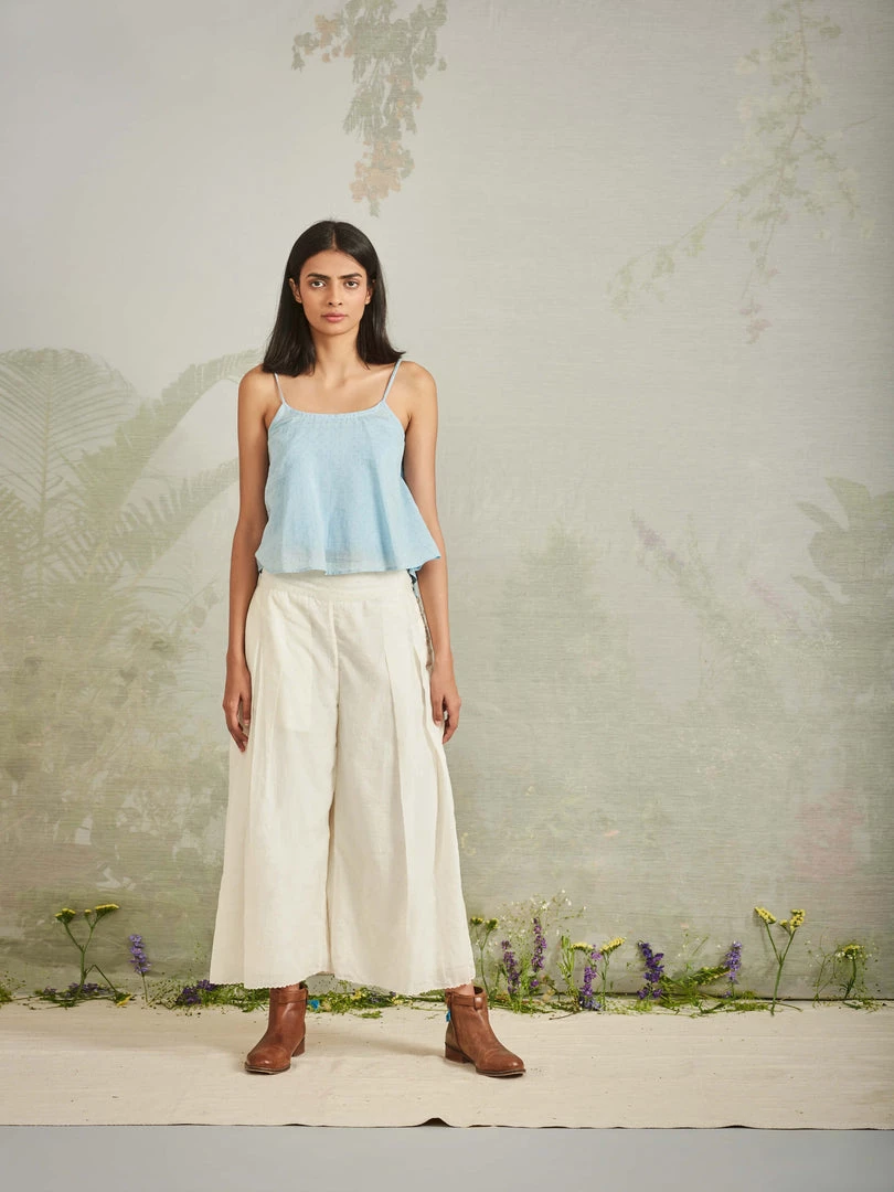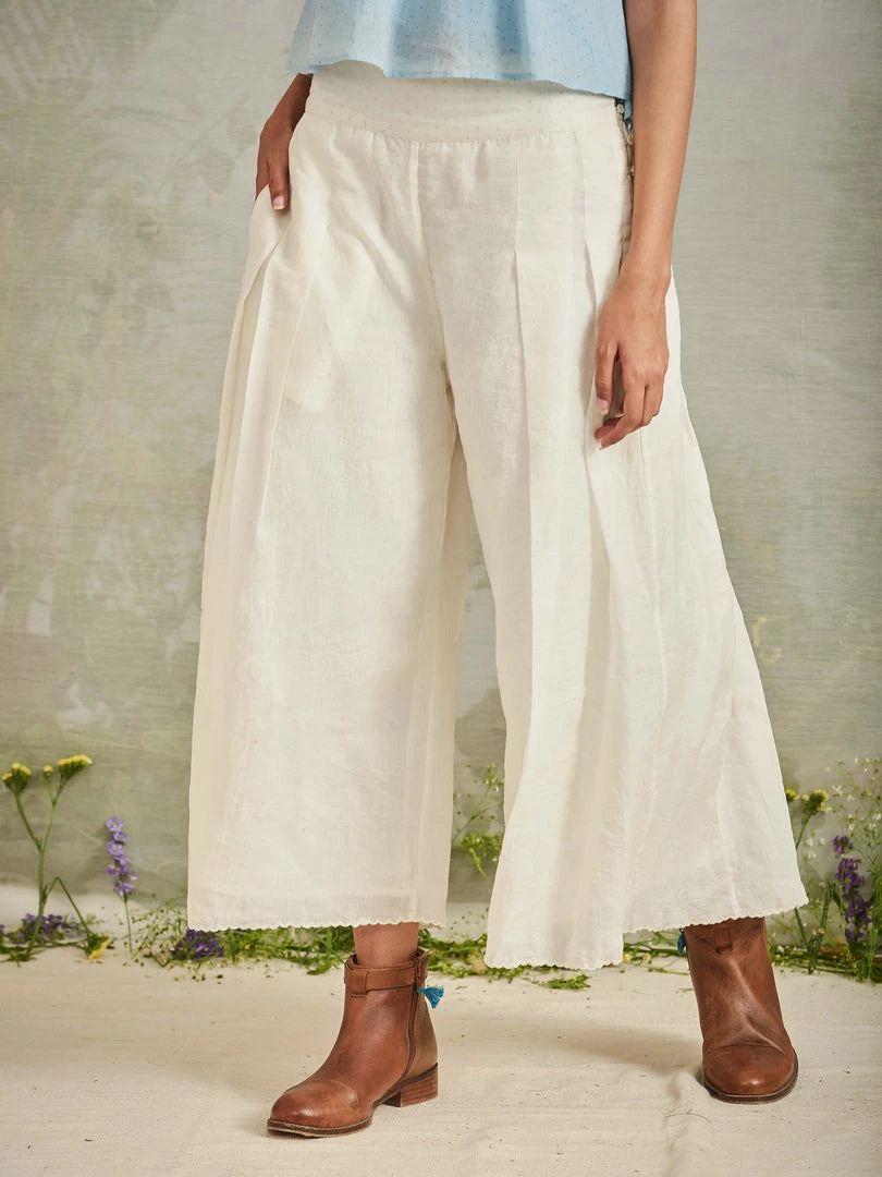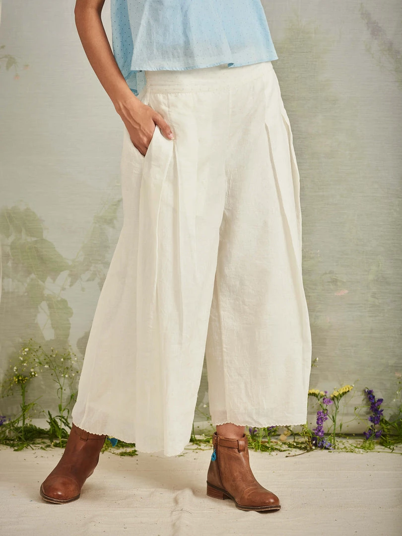 A pair of ivory, pants in a billowing silhouette with pleats and a scalloped hemline. A breezy outfit for demanding days spent spinning gold.Â
