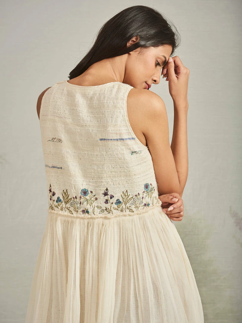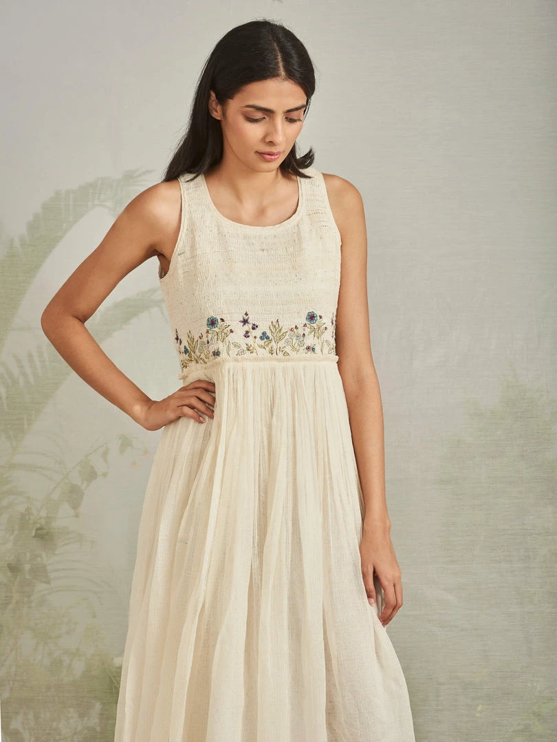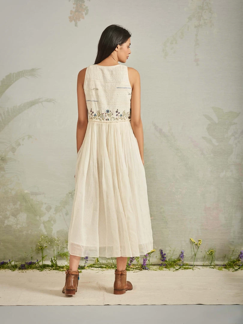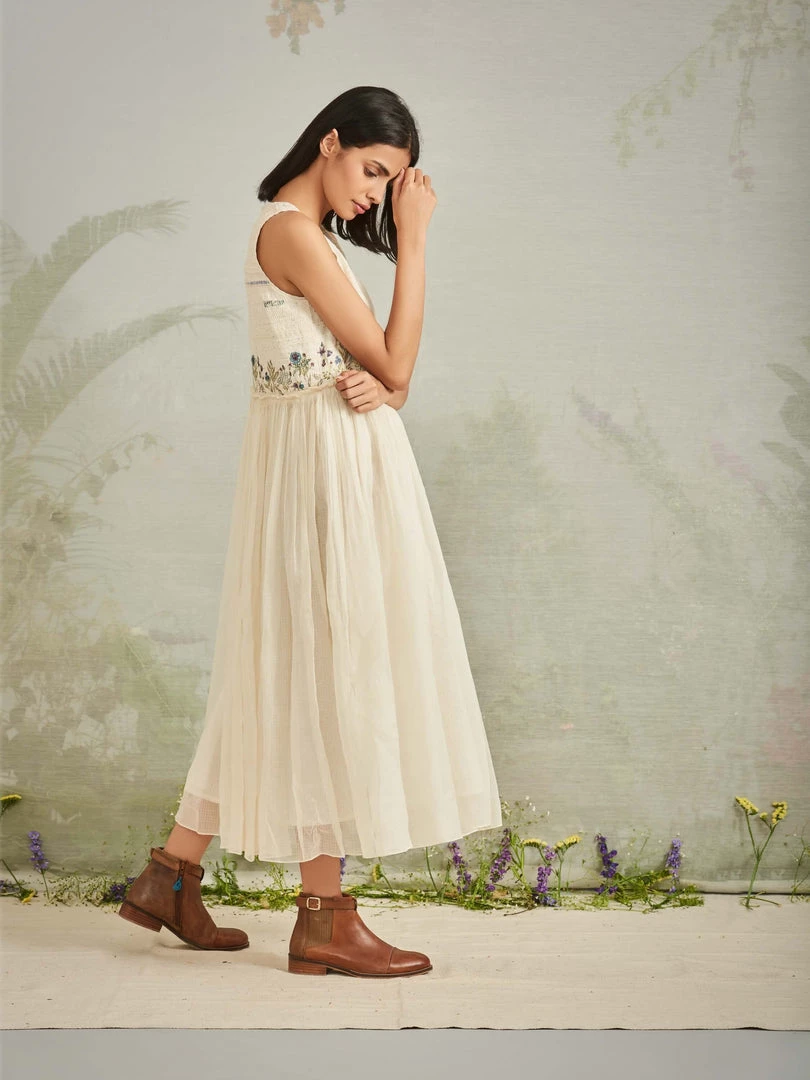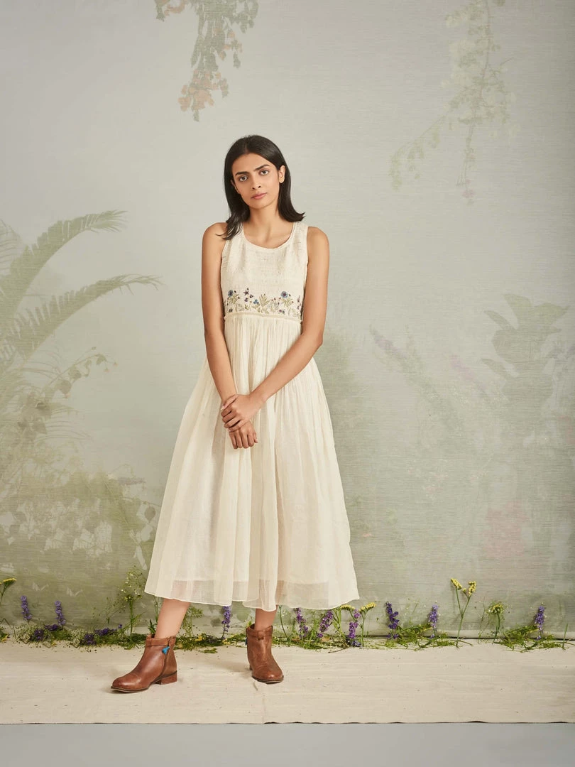 This ivory, sleeveless midi dress features a relaxed silhouette and gentle gathers at the waist. Hand block printed floral motifs murmur sweet nothings at the natural waistline in the playful nature of kindred spirits. A dress to wear when your soul is seeking flowers to keep close at heart.Â