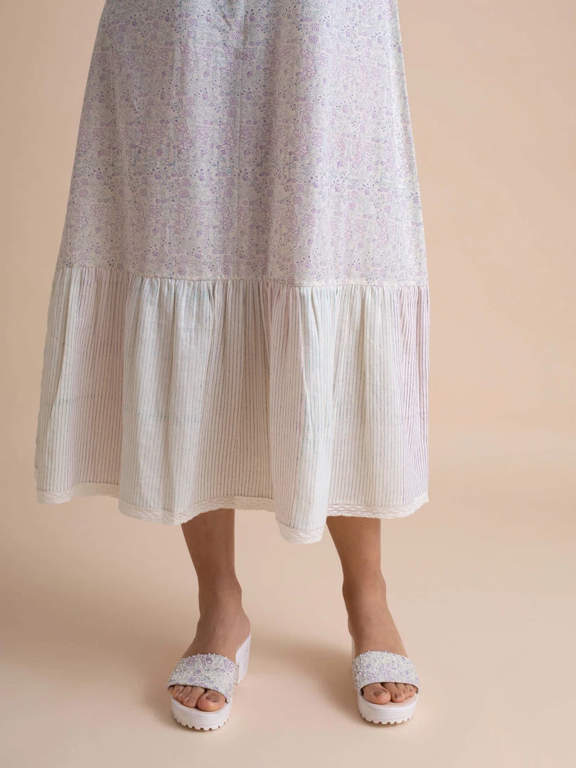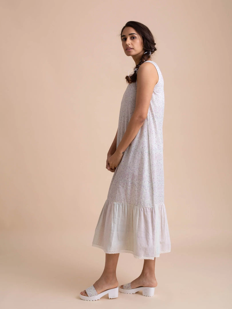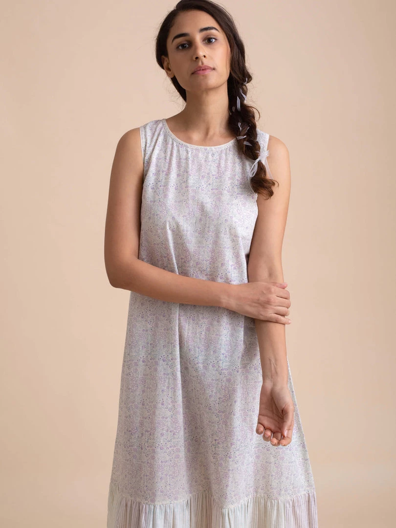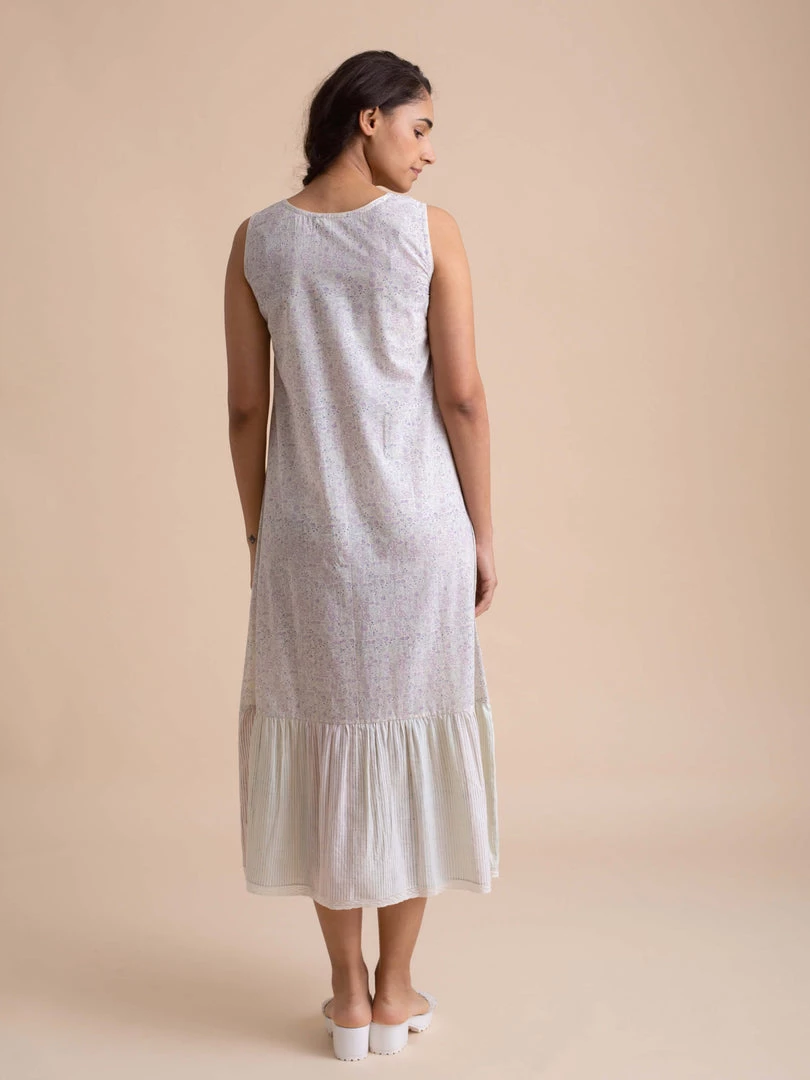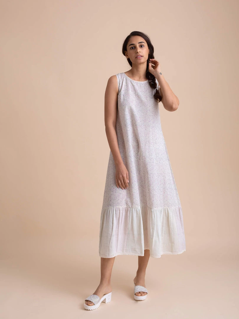 Handcrafted in fine handwoven cotton, this dress is strewn with all over minute flora block prints. Subtle gathers on hemline lend it fun.Â