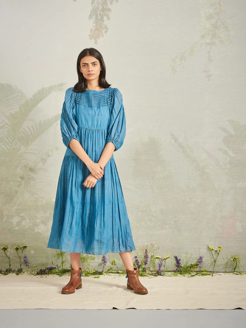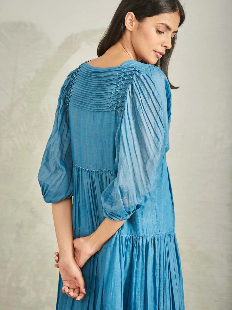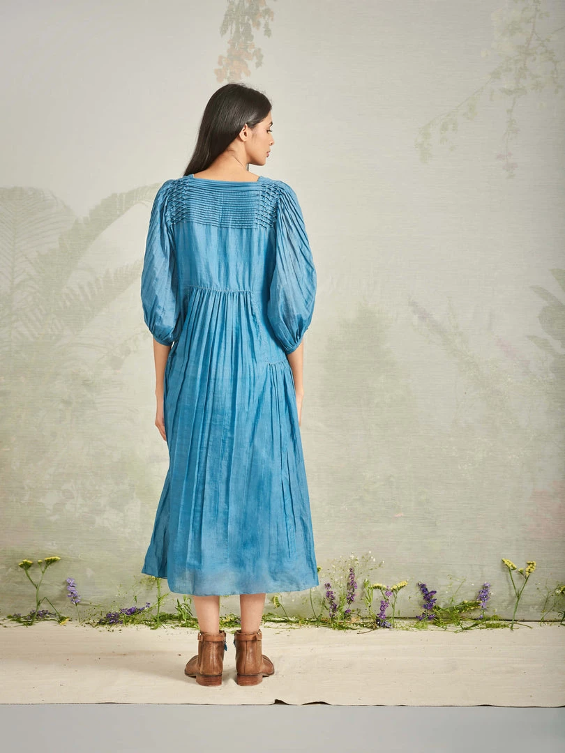 A billowy silhouette with hand smocking on the yoke and delicate gathers on sleeve made in luxurious handwoven cotton silk. Our Homecoming dress is elegant and flamboyant and a perfect companion for evening outs and formal gatherings.