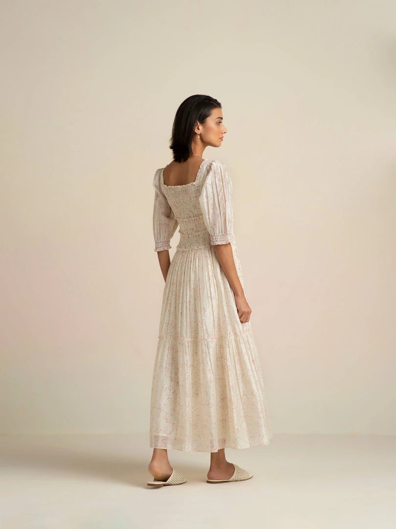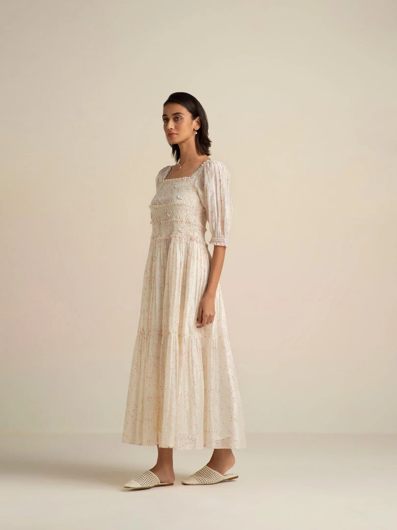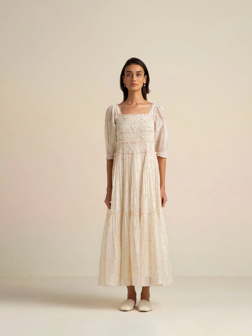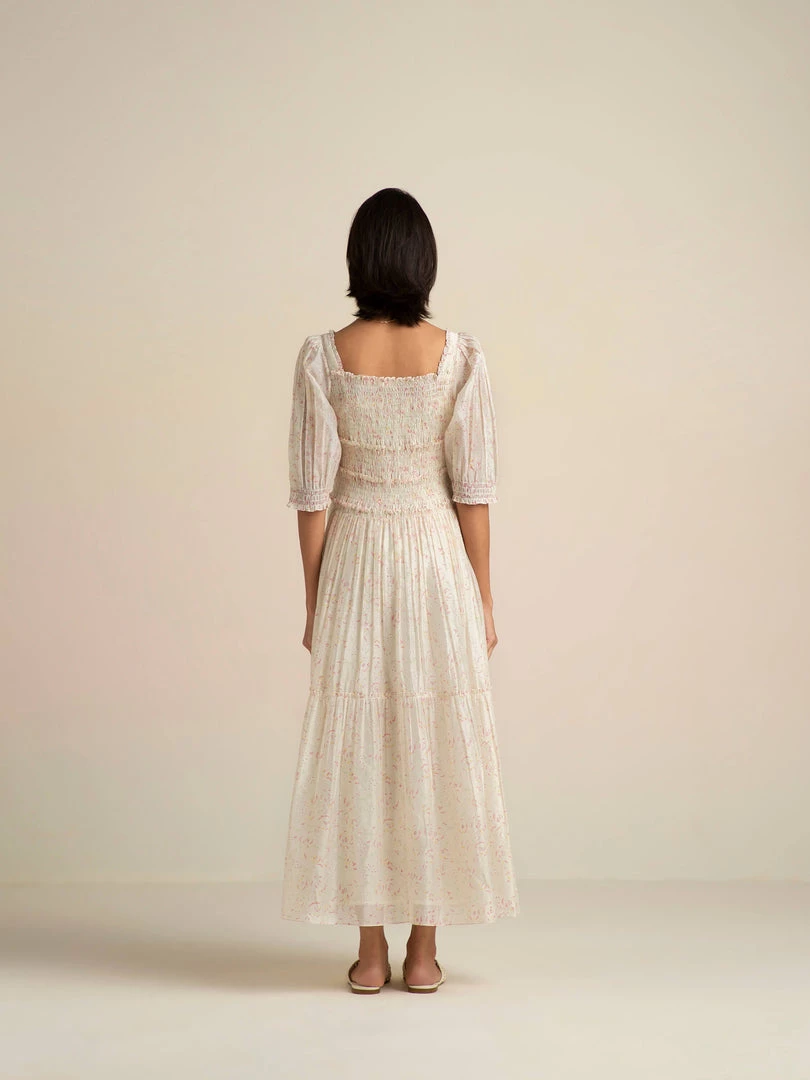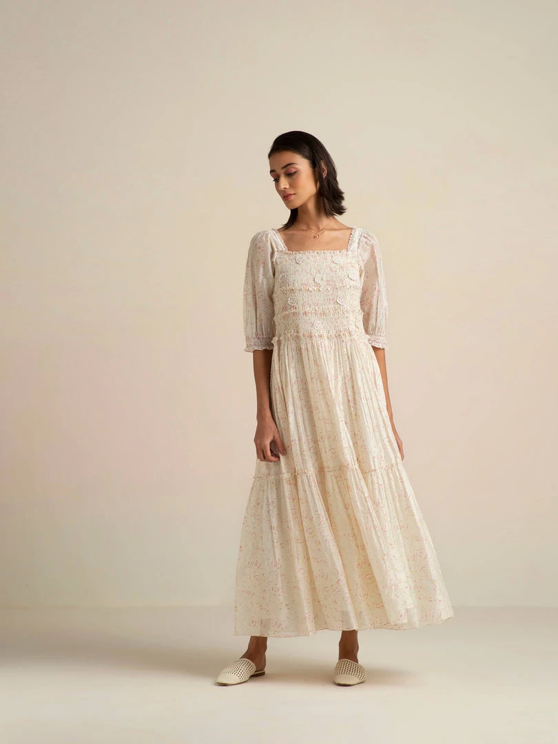 A gem in ivory, our vintage inspired Honeysuckle Smock Dress comes in a timeless tiered silhouette featuring a square neckline and short puffed sleeves.  It has a smocked elasticated bodice with patched florals and elasticated sleeve openings. Romantic and dreamy, this dress is a versatile spring staple for all occasions.