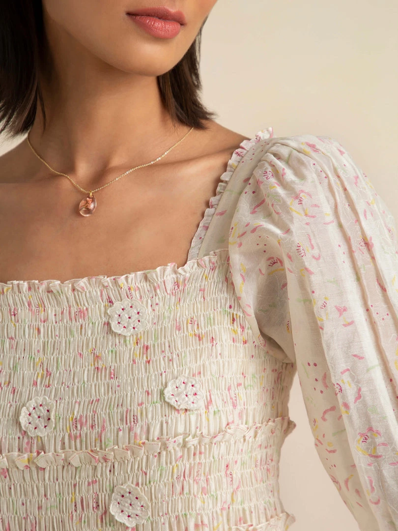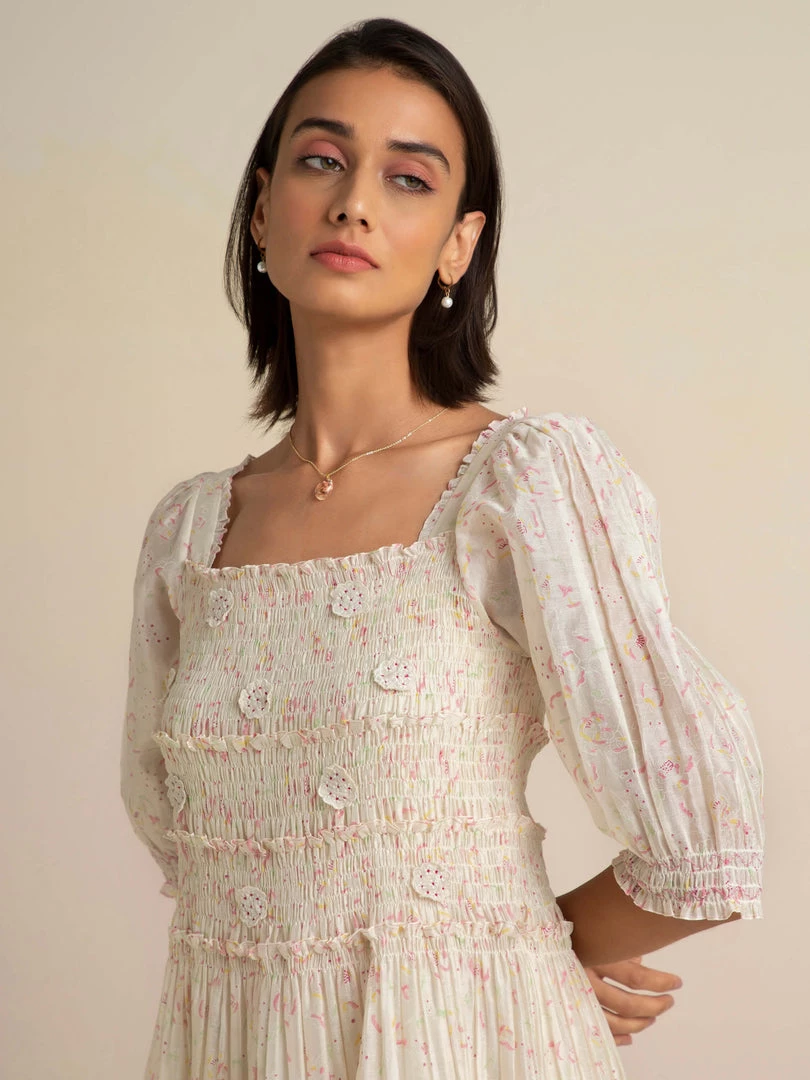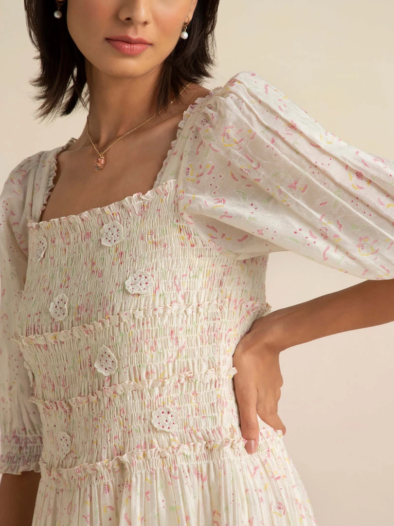 - Multi-tier smocked bodice with ditsy floral embroidery patches