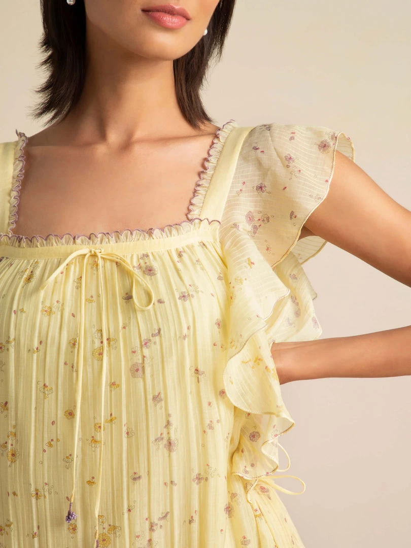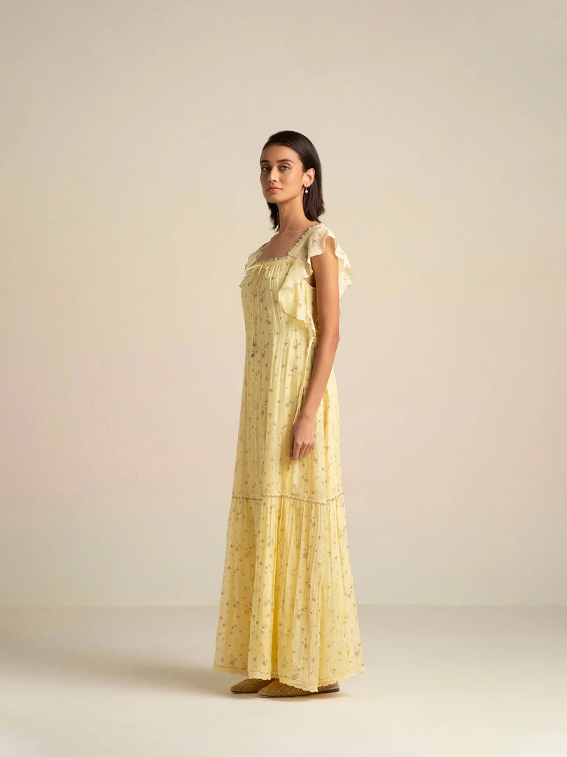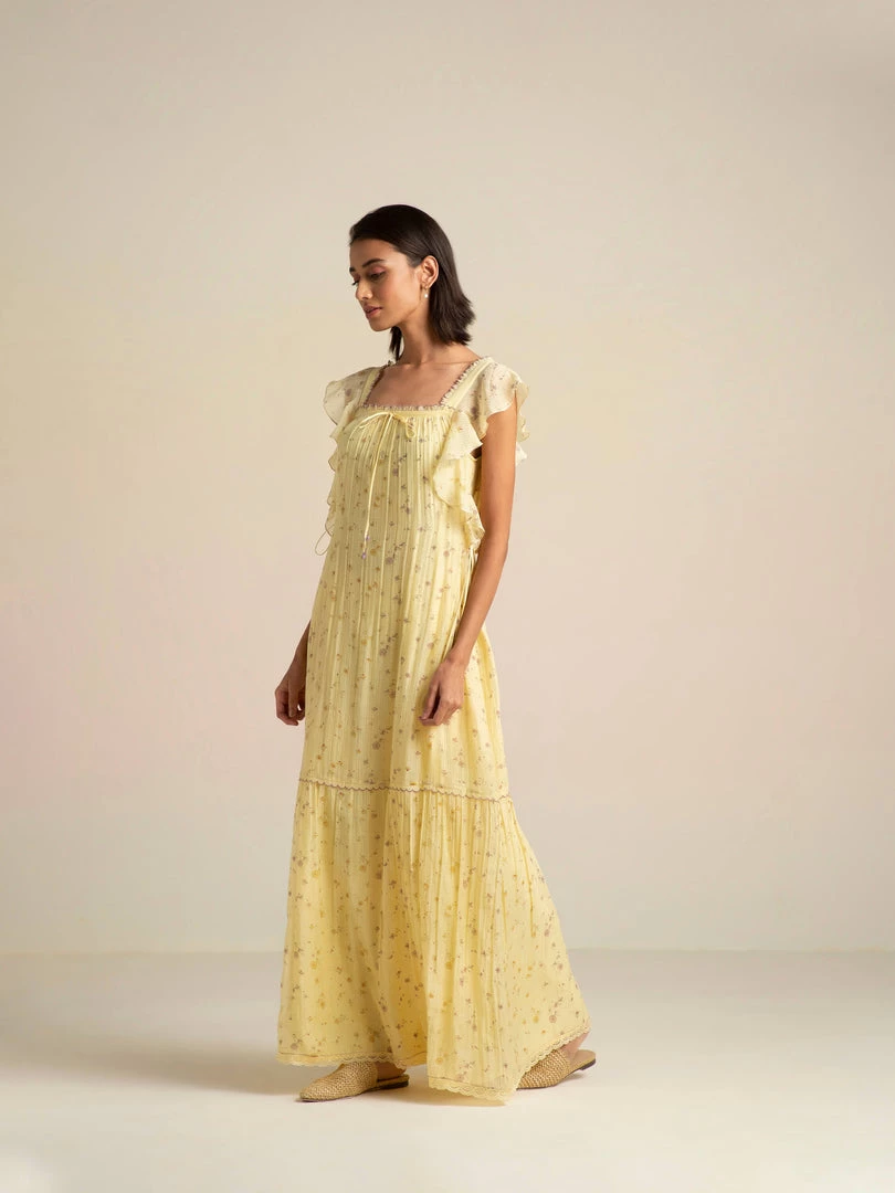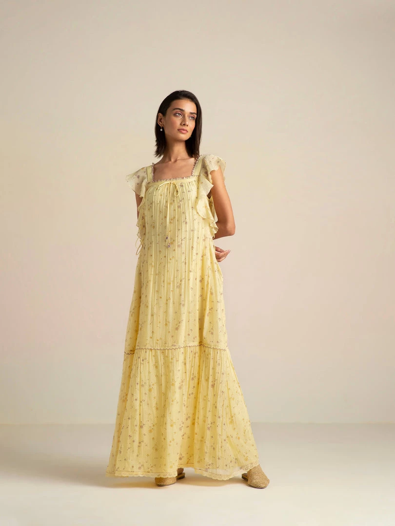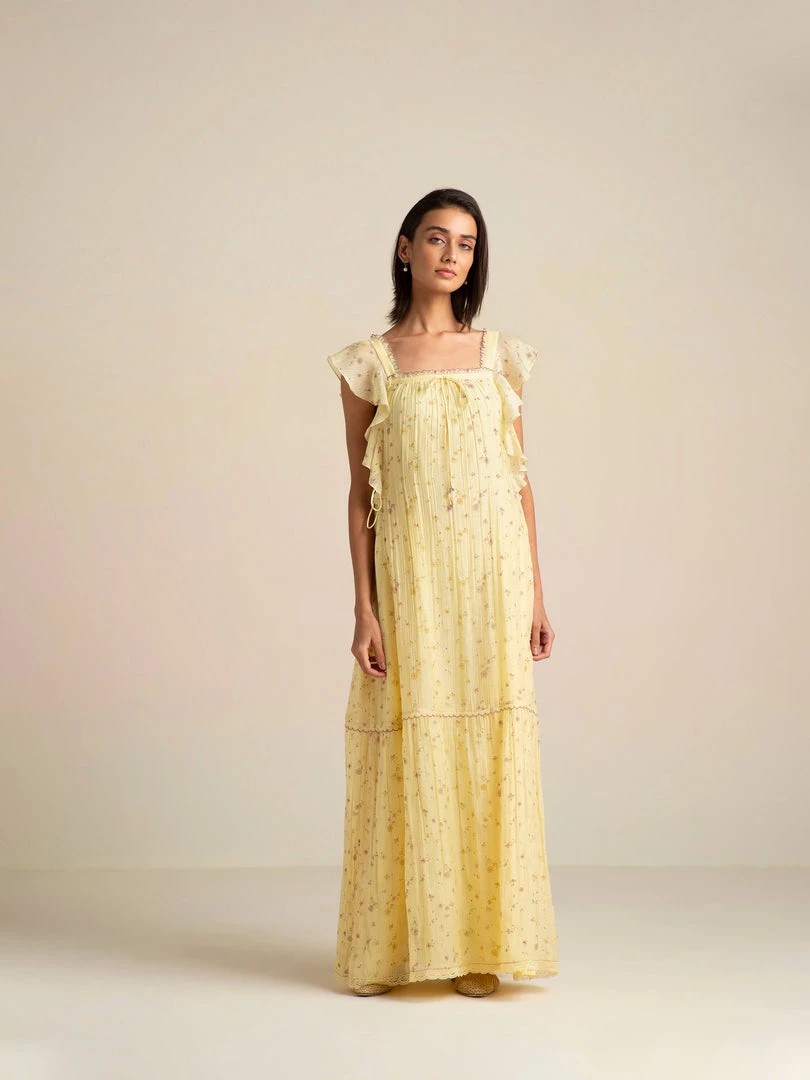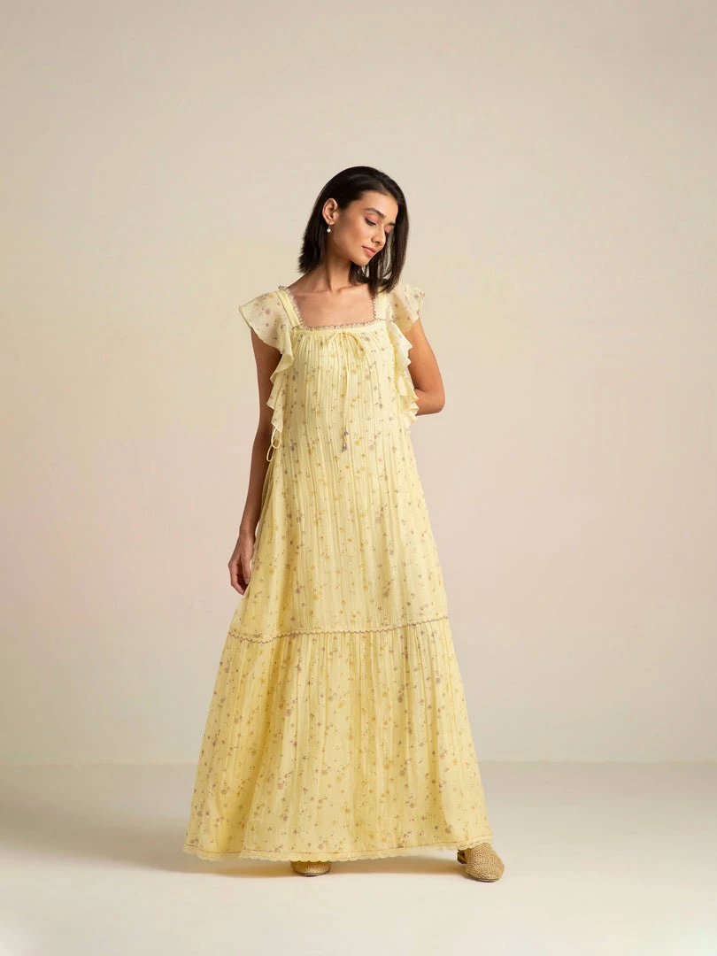 We bring you our sunlit holiday romance with the Honeywild Maxi Dress decorated with small wildflowers. This dreamy maxi is designed with a flattering square neckline and cascading ruffles falling into a tiered hemline. The tie-ups on the sides cinches the waist adding definition to the A- line silhouette.Â