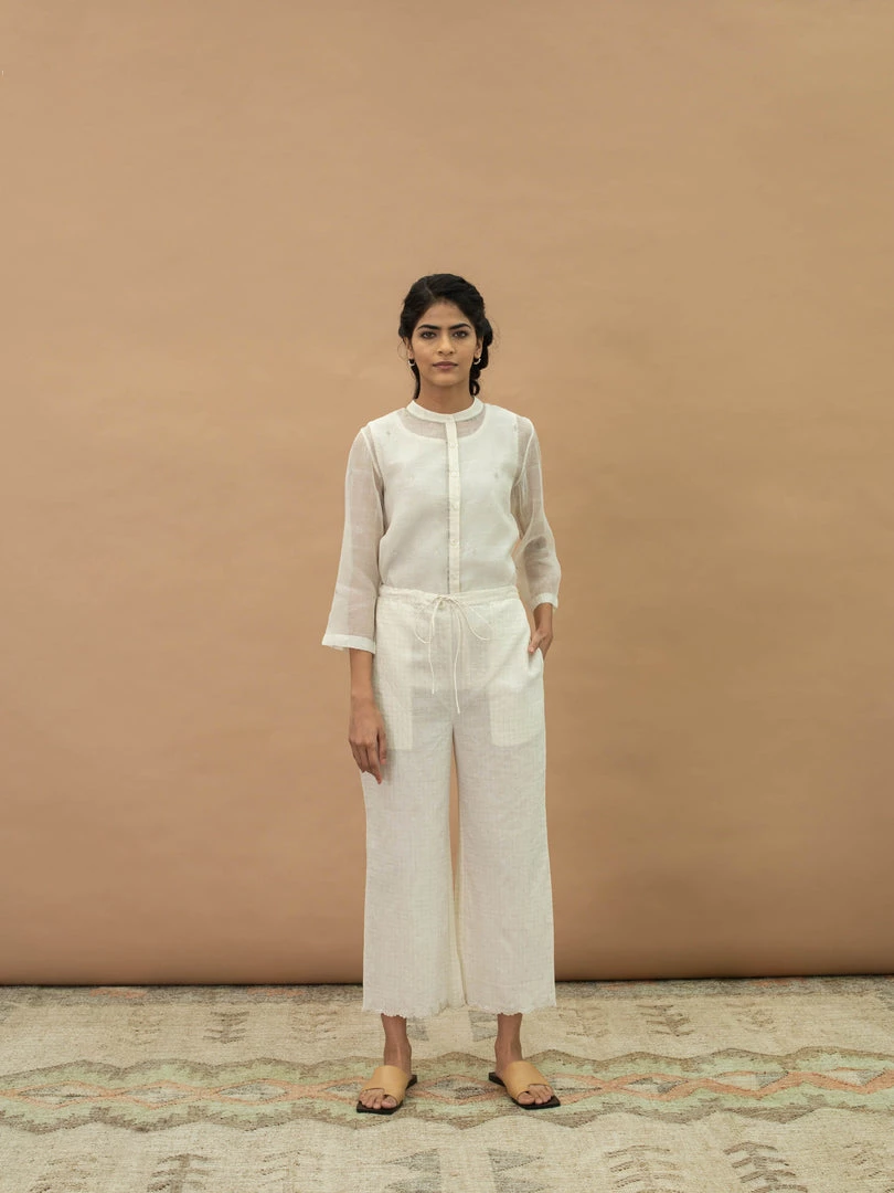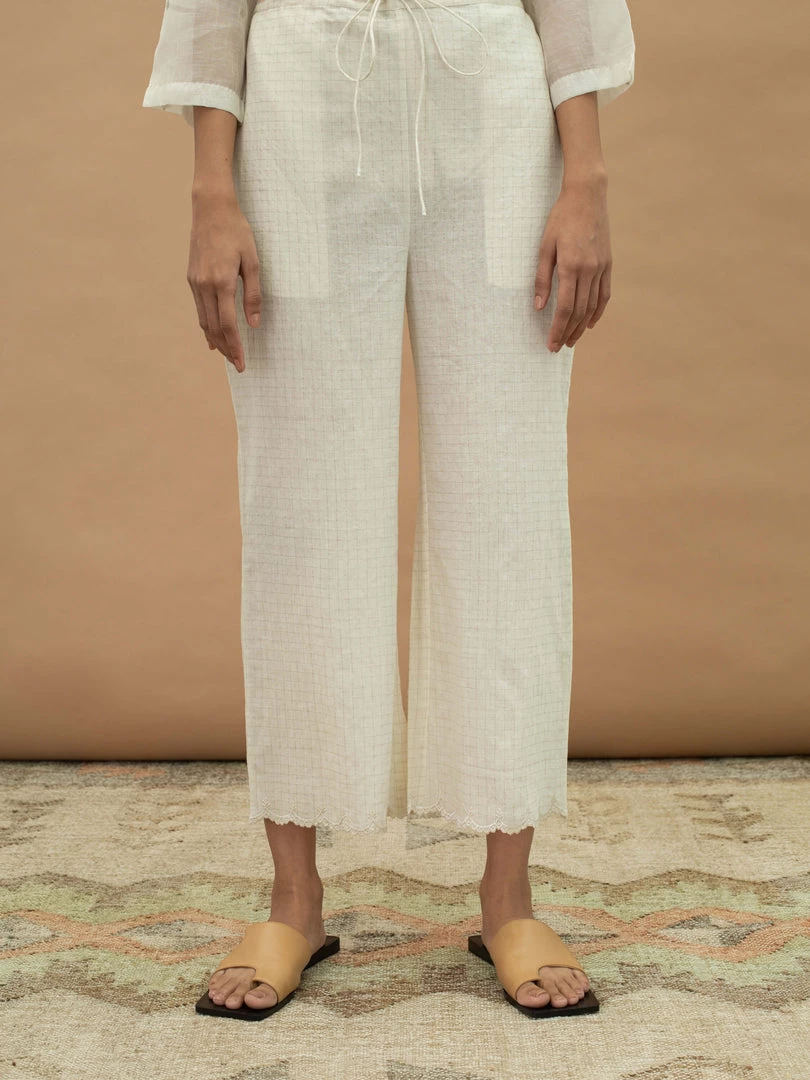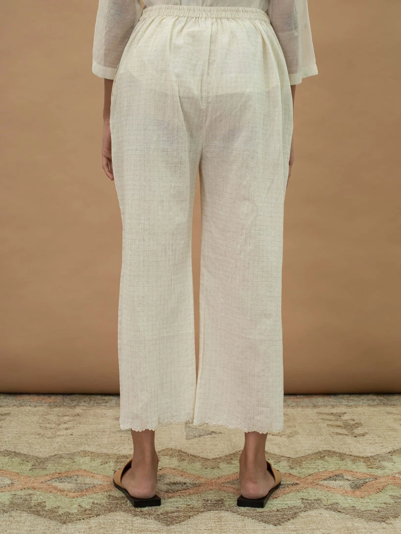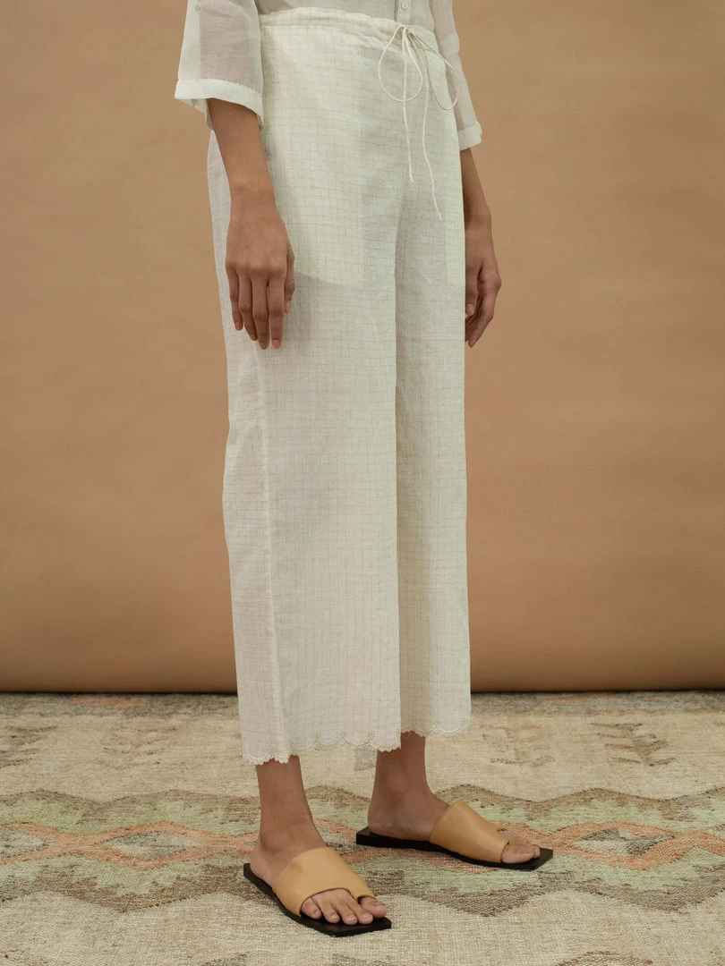 Made in handwoven cotton muslin with zari check inlay, these easy fit pants are great everyday wear. It comes with scallop embroidery on hemline. Pair it with any of our Midi dresses or kurtas.