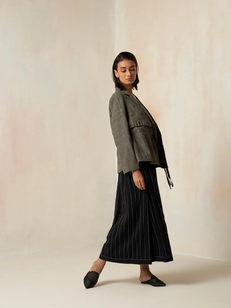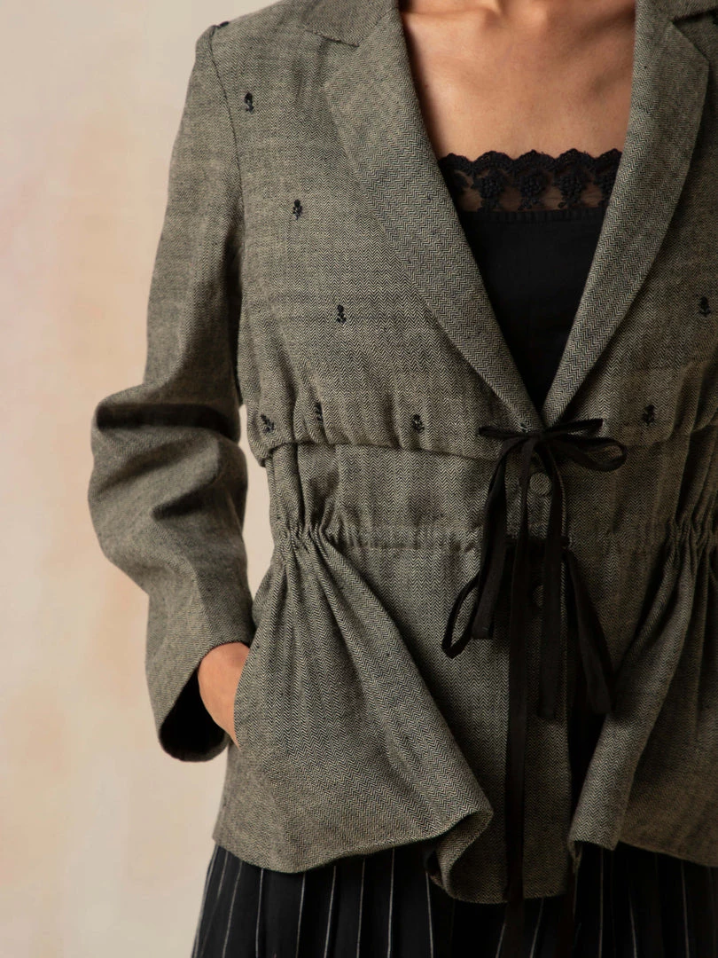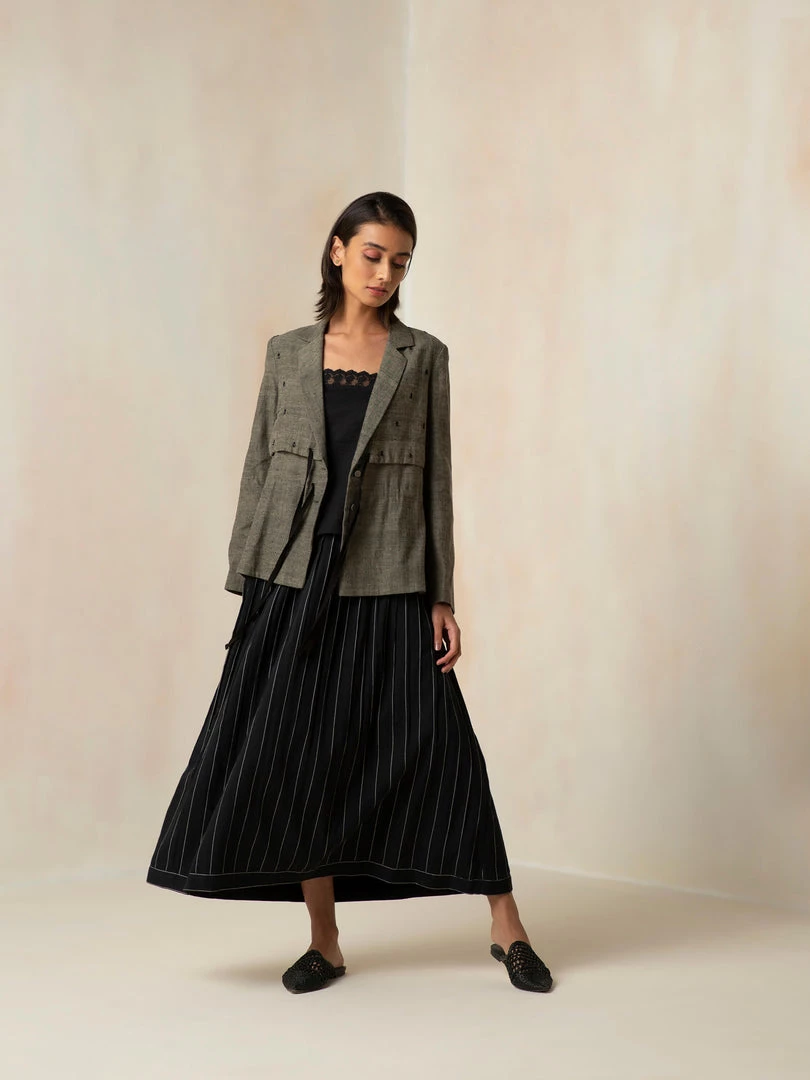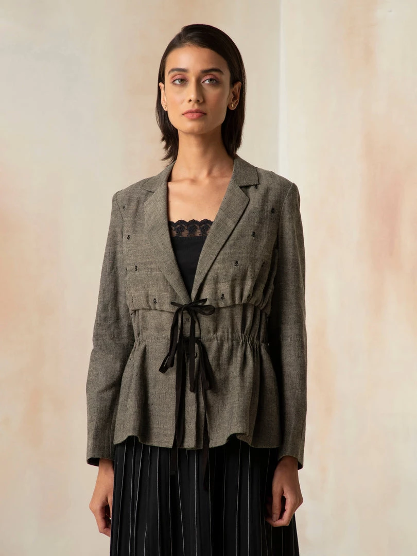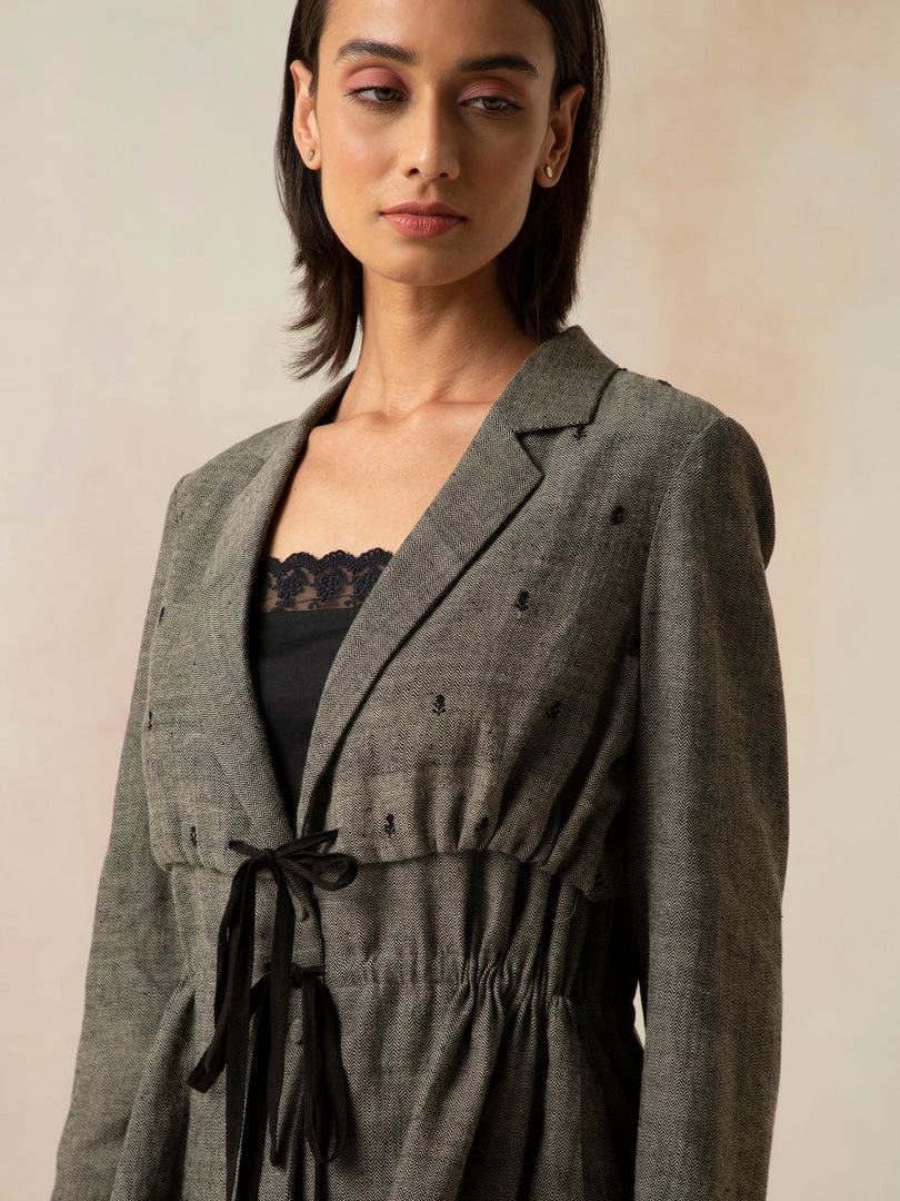 This classic short trench coat made in herringbone handloom cotton fabric allows it to transcend seasonal change. The adjustable waist and drawstring flaps add dramatic structure to the boxy silhouette.Â
