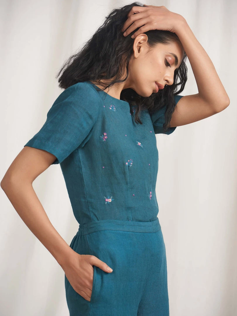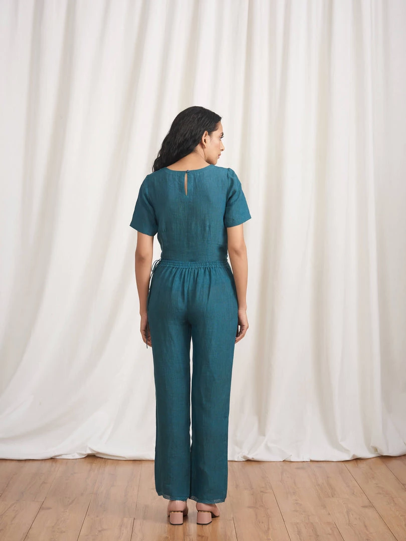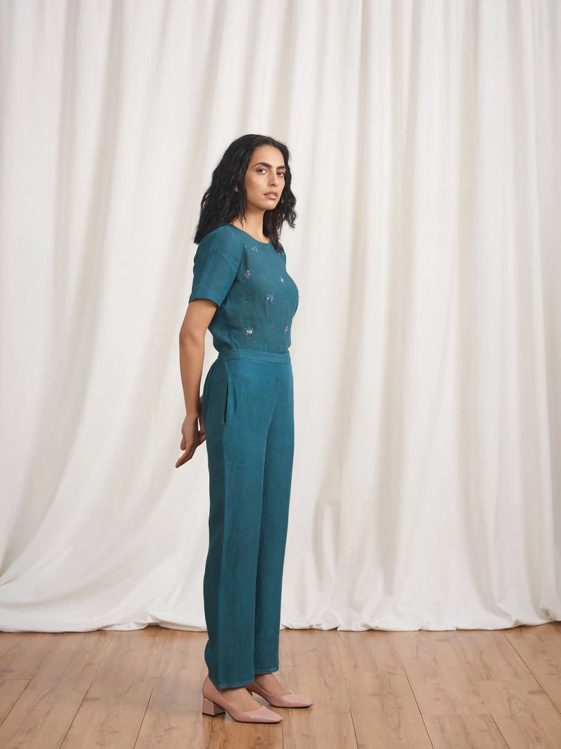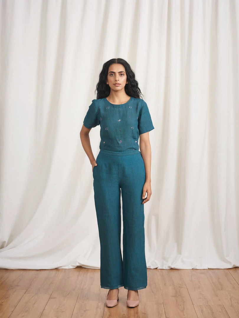 Our linen pants in deep emerald green with lace edgings are an ideal pick for on-the-go days. Pair them up with any of our cotton silk dresses or tops.
