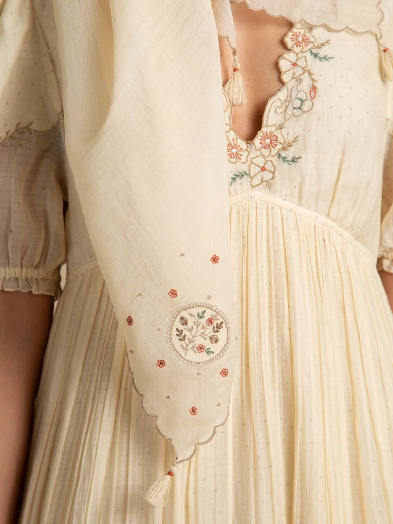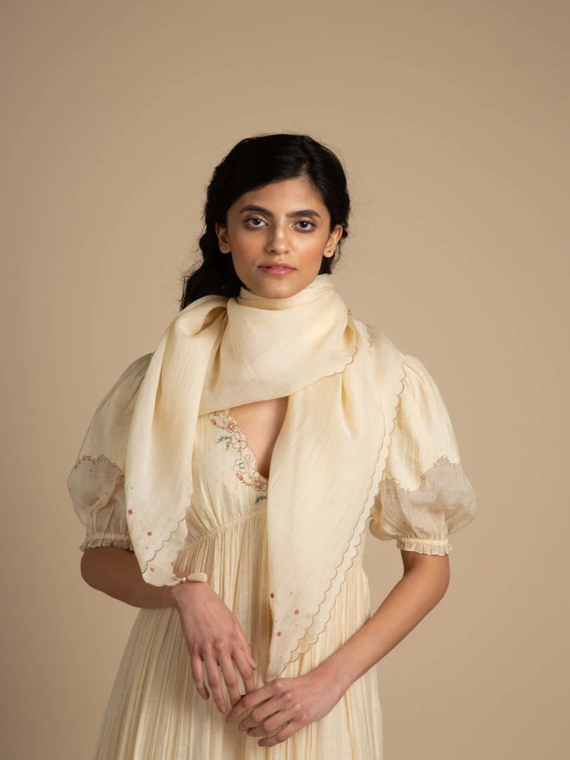 With its elongated diamond shape, this delicately embroidered scarf can be styled in endless ways. It’s been crafted in airy cotton Chanderi fabric and delicately scalloped and tasseled at edges.Â