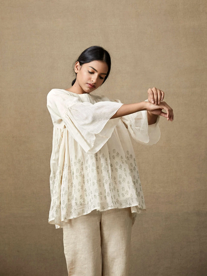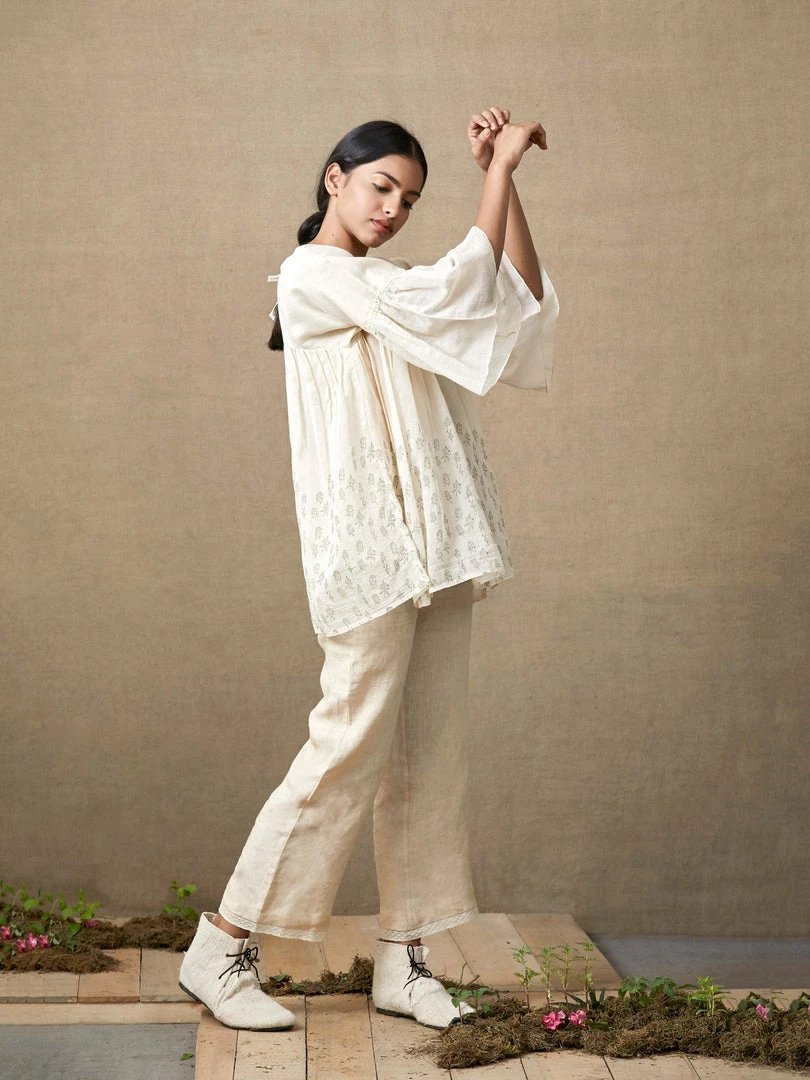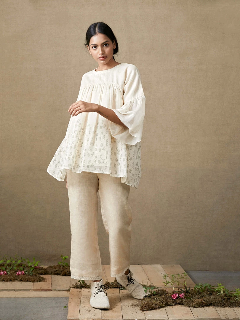 Delicate leafage block prints adorn the fall of this versatile top. Angel sleeves and free falling gathers underline its free spirit. A dotted slip adds subtle interest. Pair it with our ecru pants (E21) made in handwoven linen.