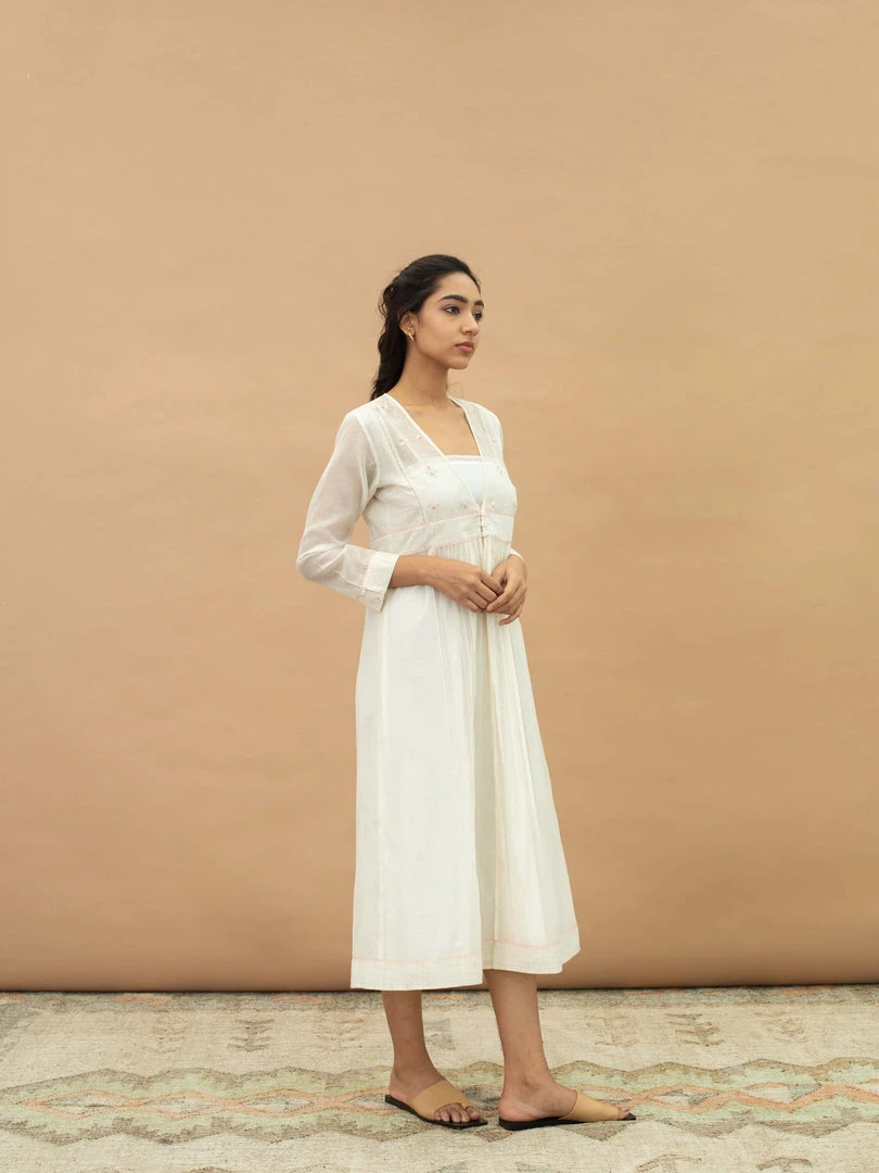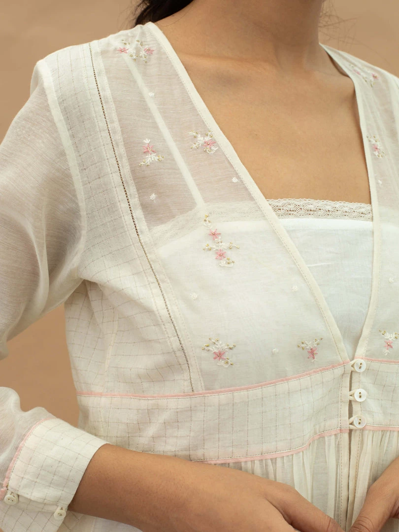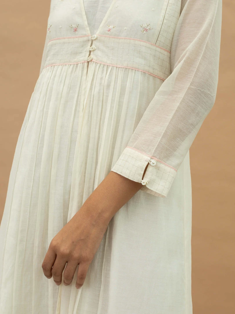 This front open chanderi dress comes with delicate floral hand embroidery on yoke and light gathers under the empire line. This dress can be paired with any straight pants or worn as is with the slip underneath.