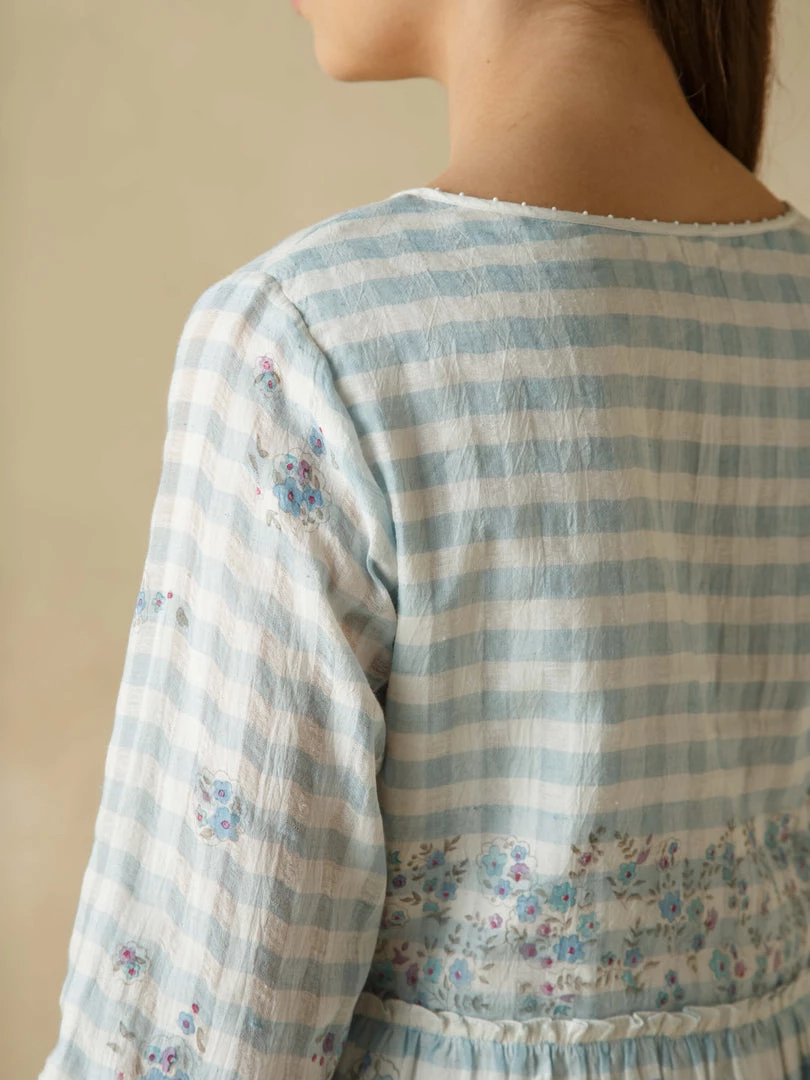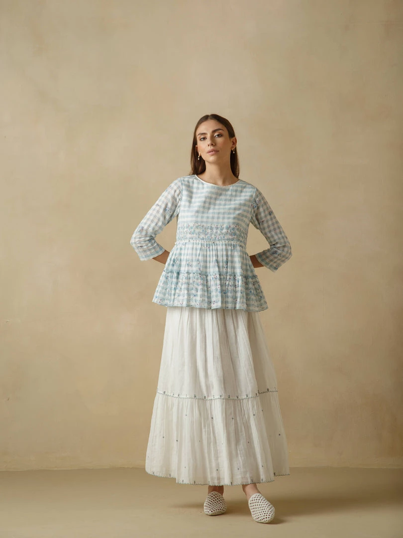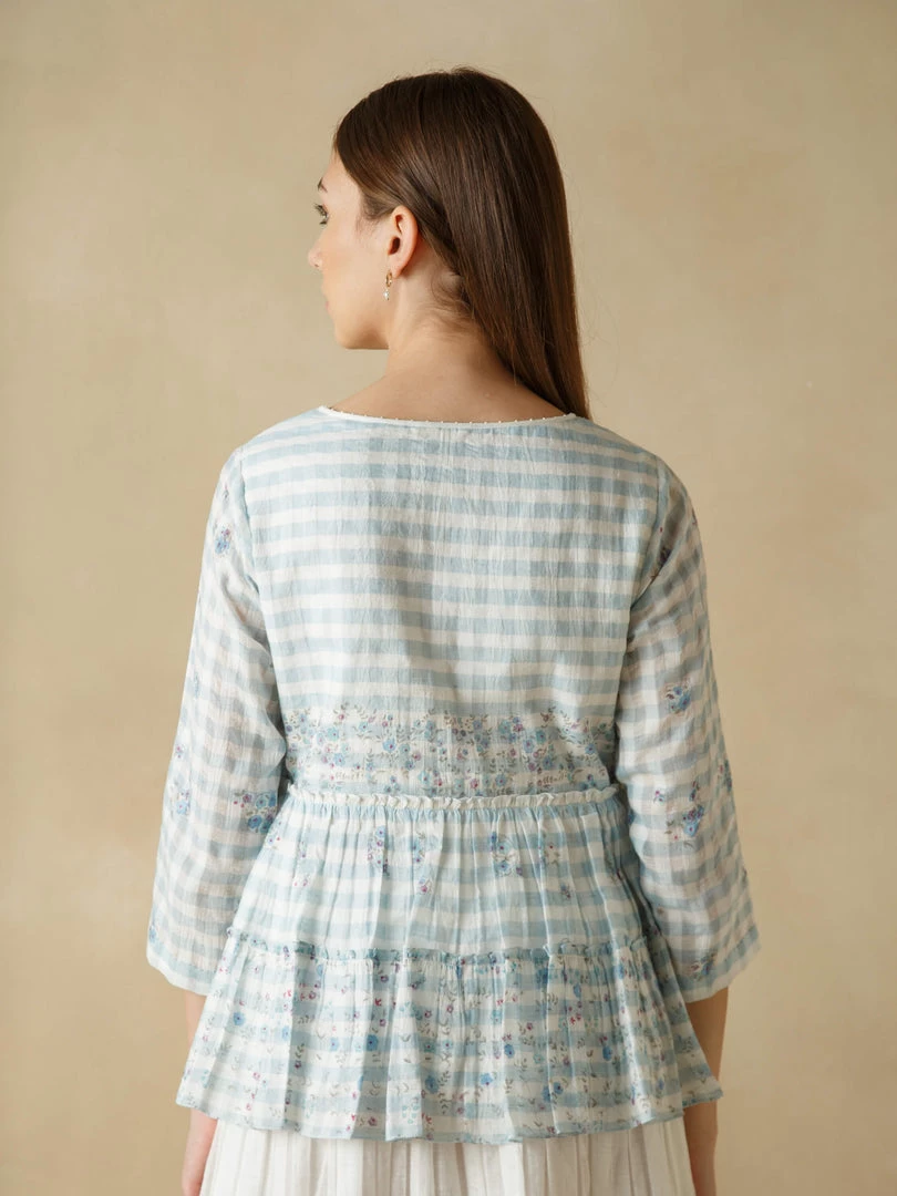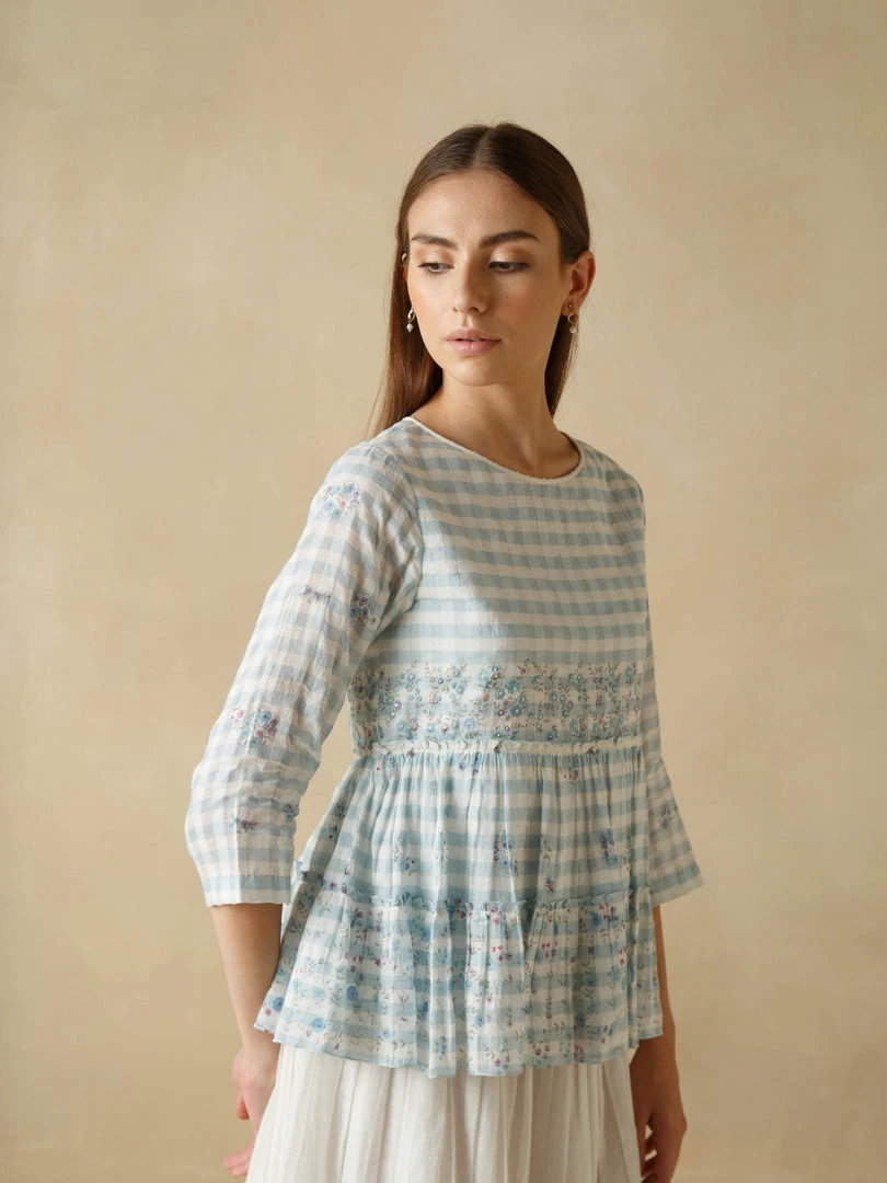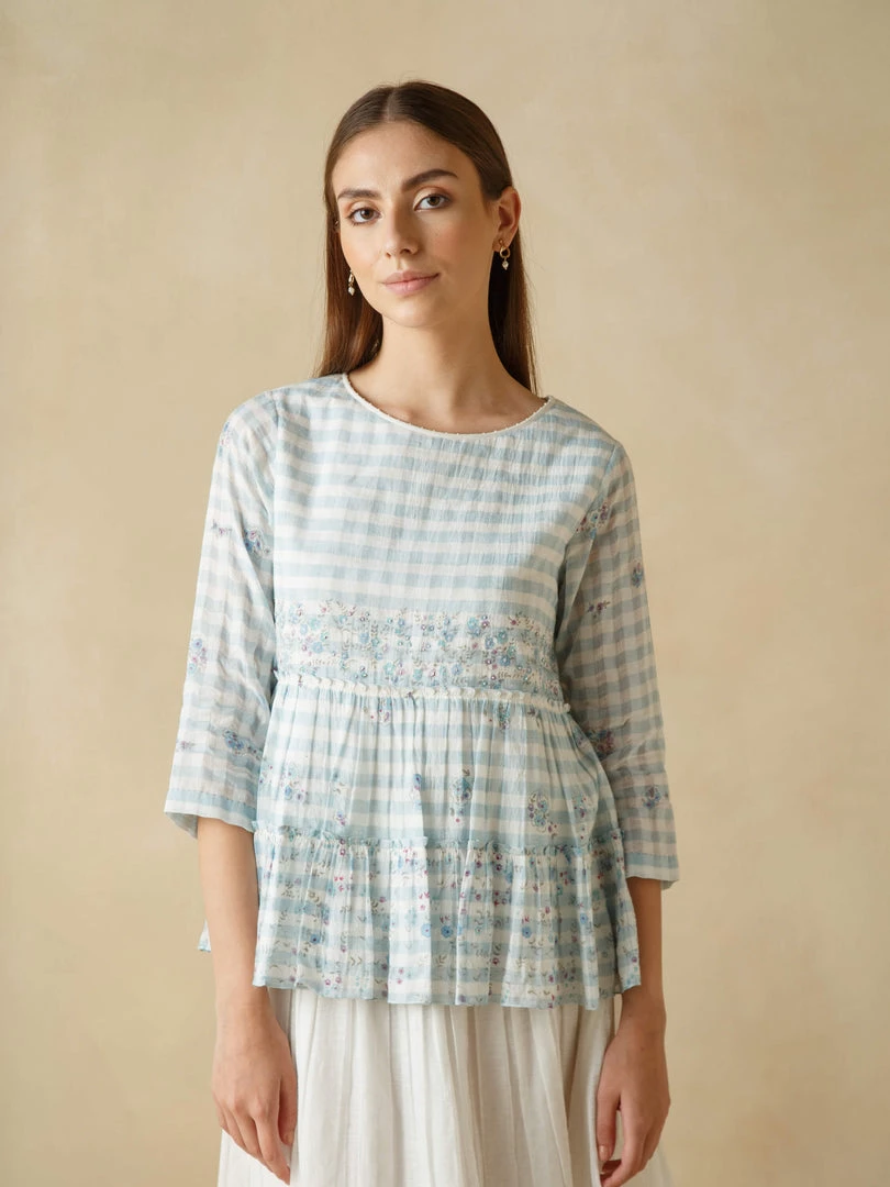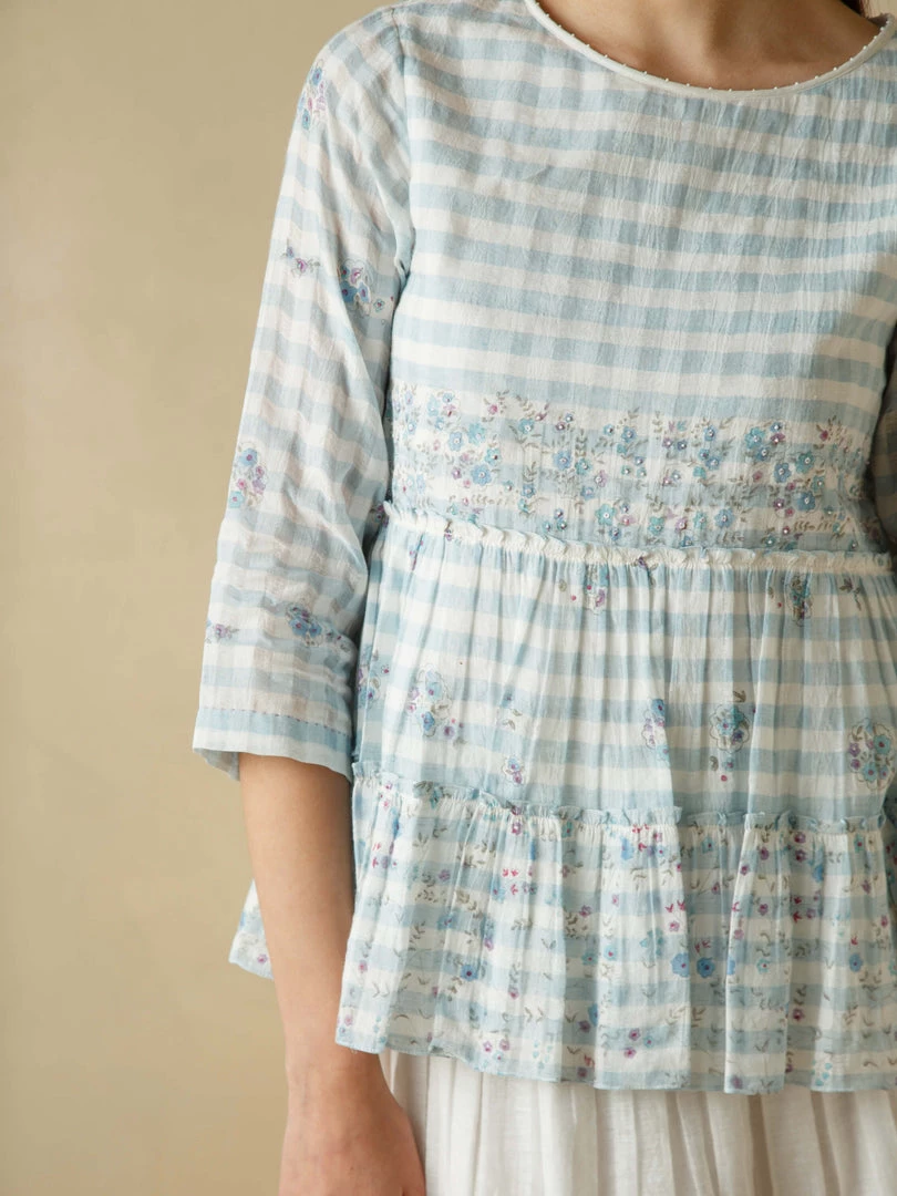 Evoking the subtle beauty of a landscape in which everything—sky, mountains, clouds, mist—merge into a mystical union, our Love-in-a-mist Top is made in mulmul cotton fabric and hand block printed with subtle floral motifs.
