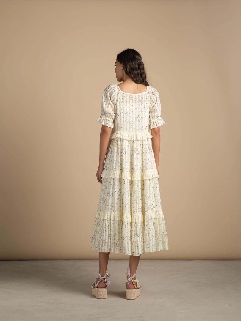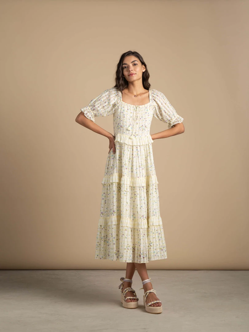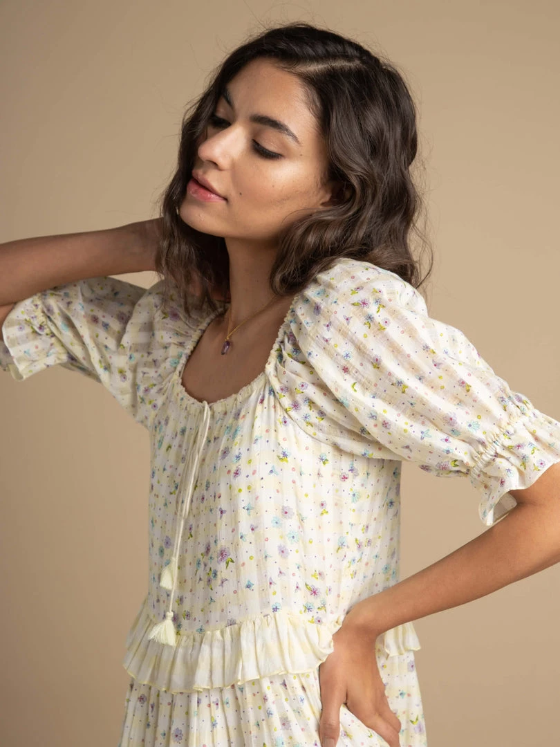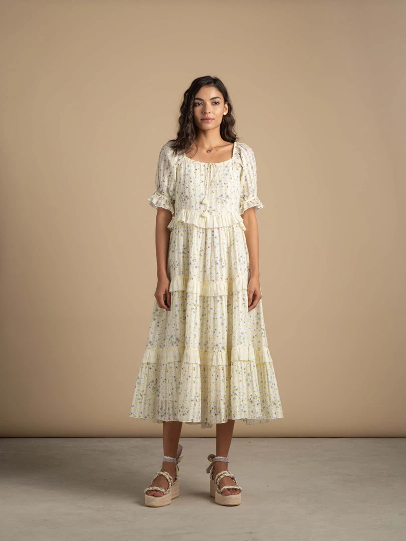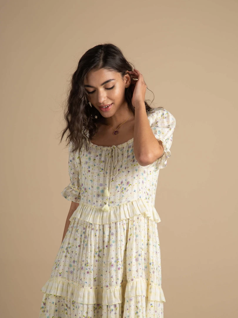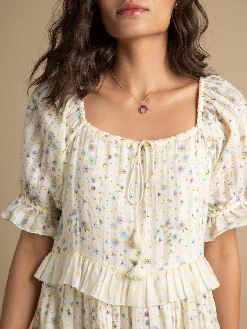 Our lovelorn midi dress features a flattering square neckline which can be worn both on & off-shoulder. The ruffle accents on tiers and short puff sleeves give it a romantic vibe. It’s shaped from our signature lemon yellow gauze check fabric which is light and airy and floats like a dream. Sweeping into a soft midi length with ditzy flowers hand block printed all over, it’s your perfect partner for a sunny day out!