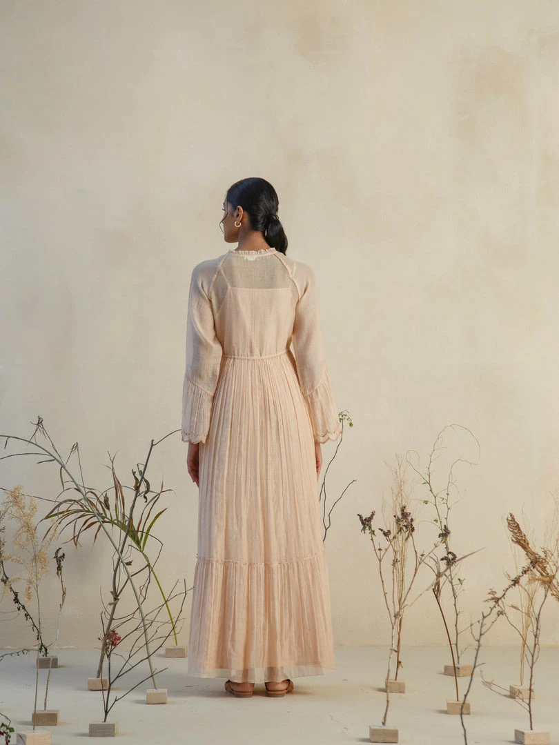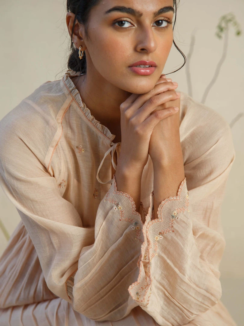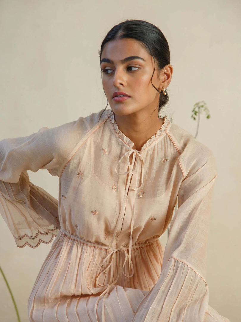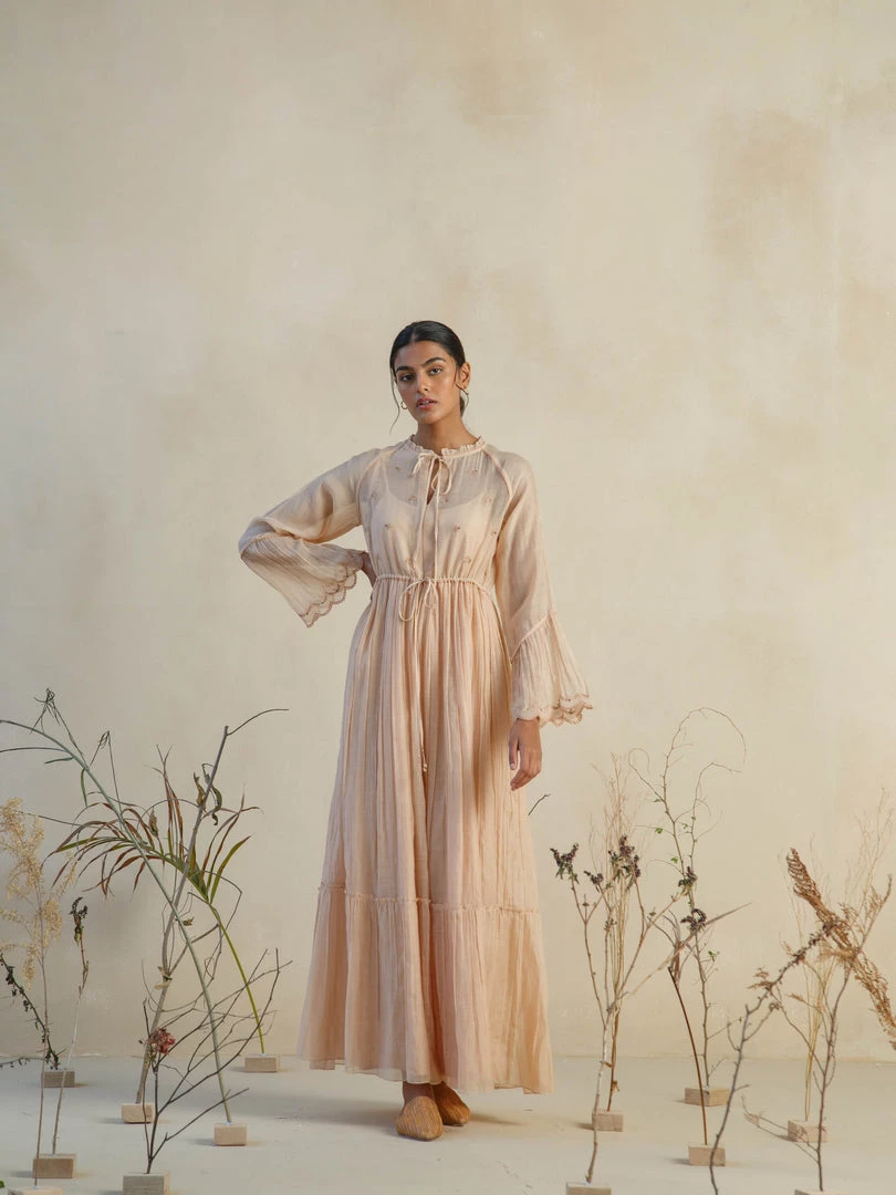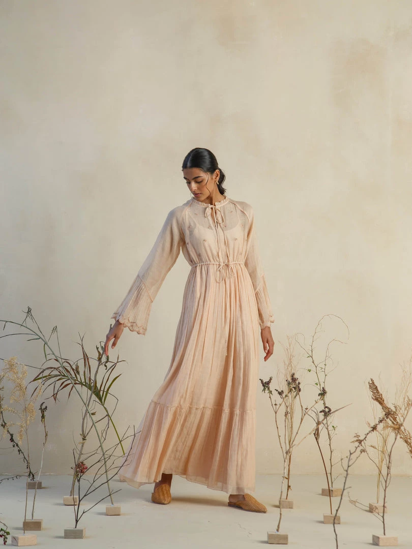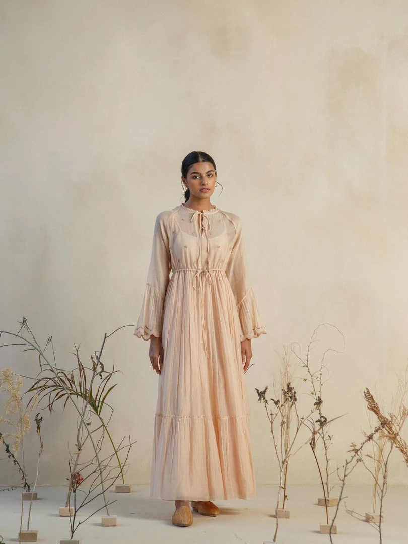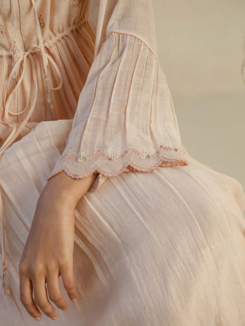 Our signature maxi dress silhouette in a pastel shade of peach is rendered with florals in shadowy patchwork embroidery on the sleeves and yoke. This feminine piece can be cinched at the waist with the beaded drawstring. Style it with sandals for an elegant look.Â