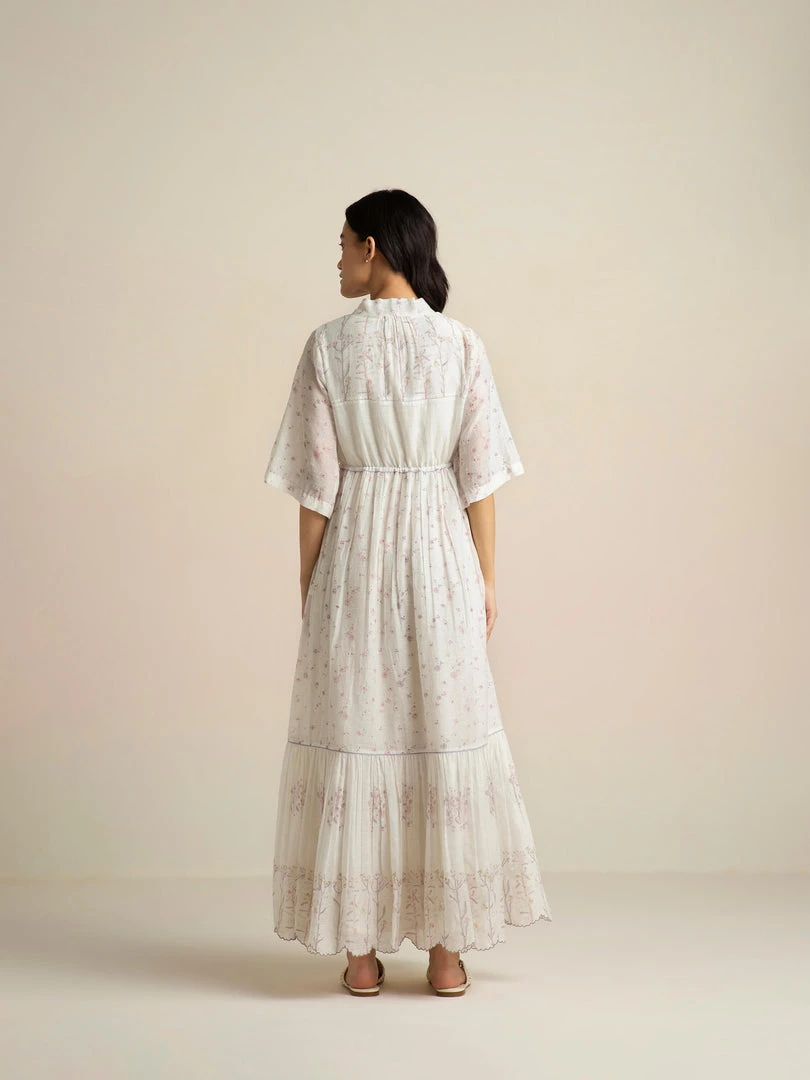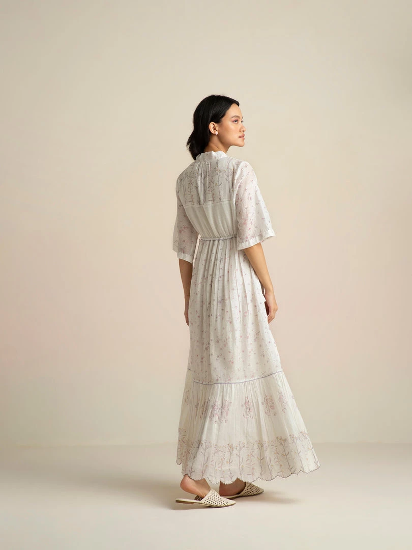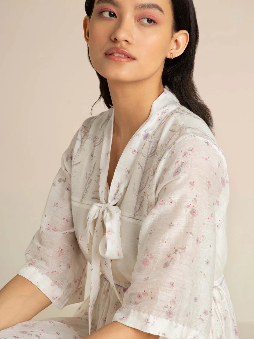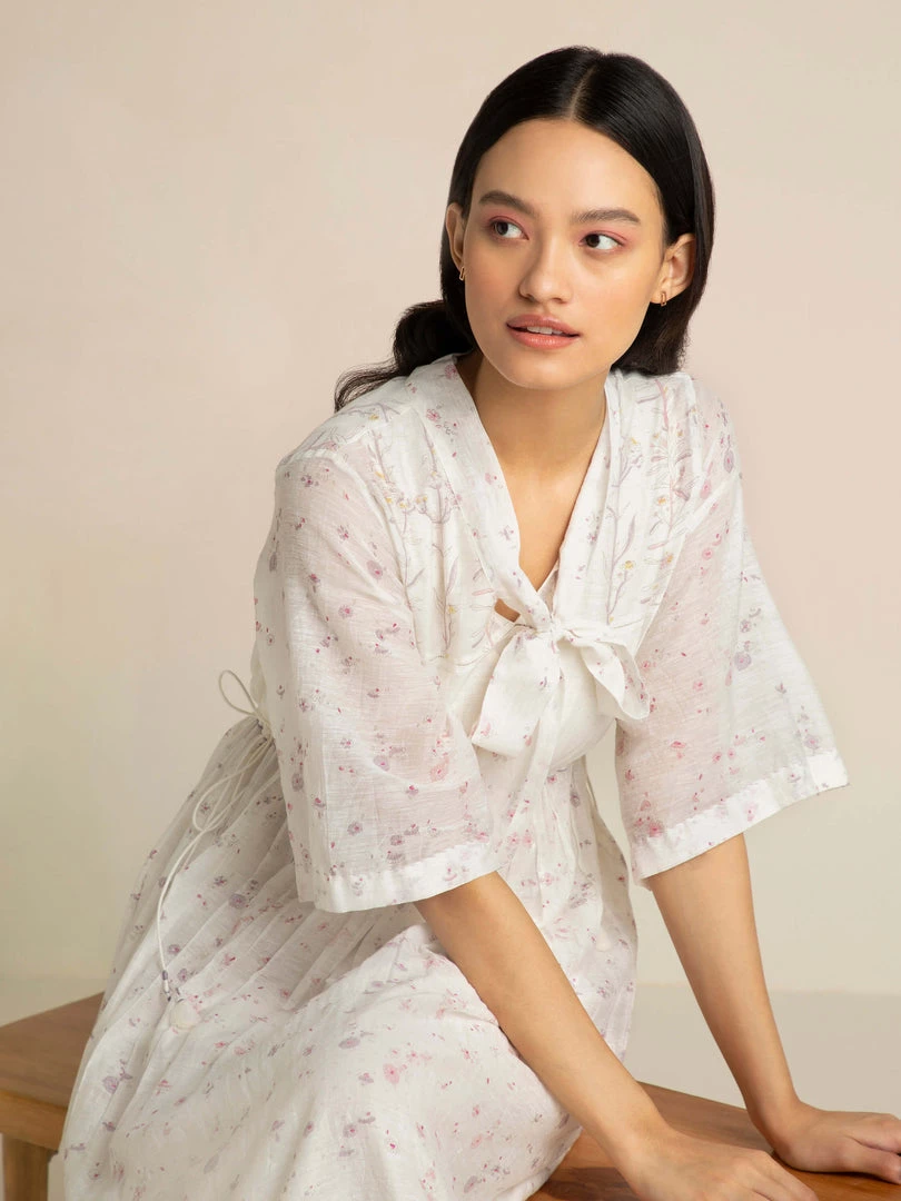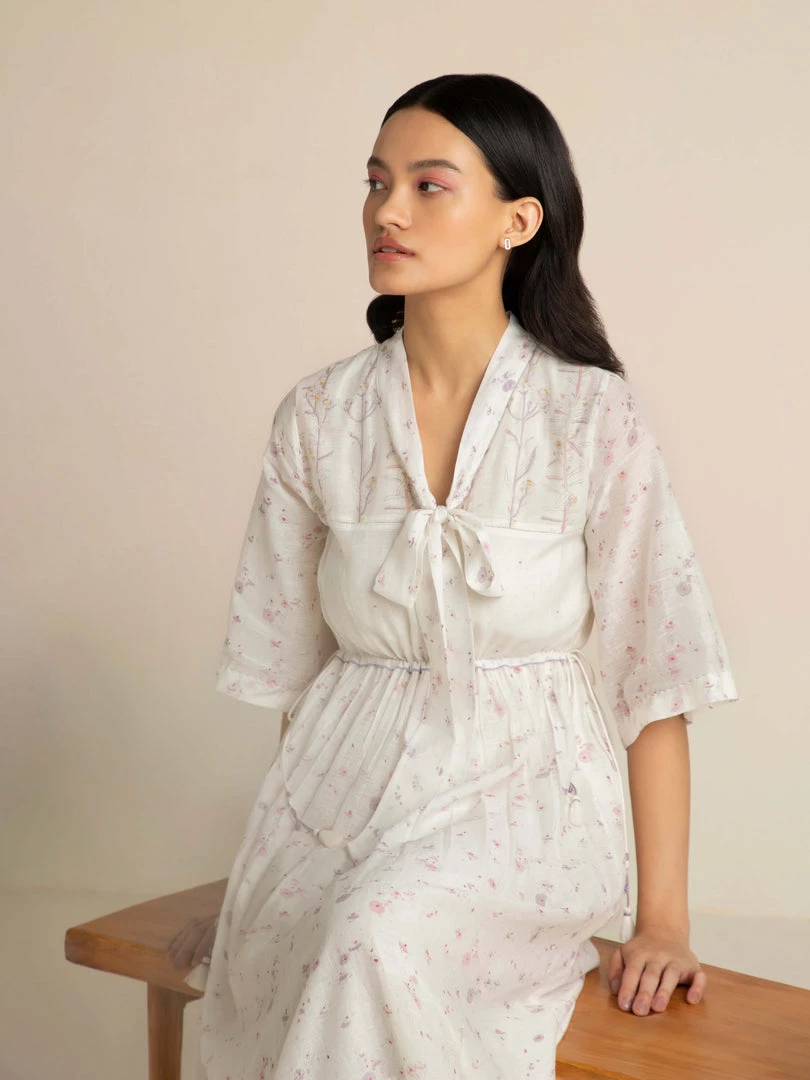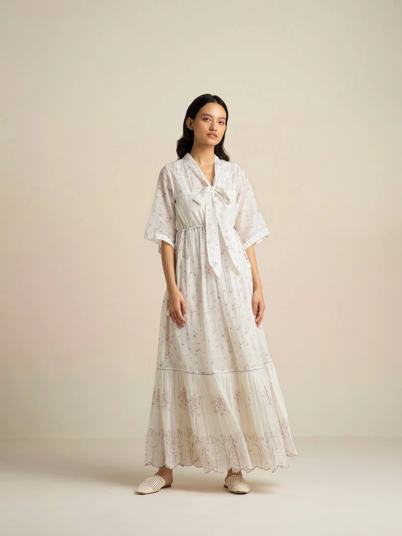 Our Cashmere Maxi Dress with a statement pussy bow at the neckline and drawstring waist is perfect for above the keyboard dressing. Crafted in our signature handloom fabric with rich hand block prints, it is a reminder of the invaluable Indian craft heritage.
