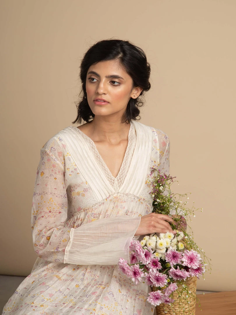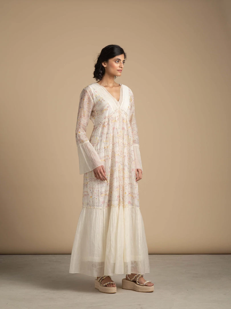 Echoing the sublime and ethereal facets of the feminine, this dress features a deep V-neck and a low back with slender tie-ups at back of neck falling into a sweeping tiered skirt. The painterly garden prints in pink over the bodice and sleeves represent the bubbling joy of nature that spring brings.