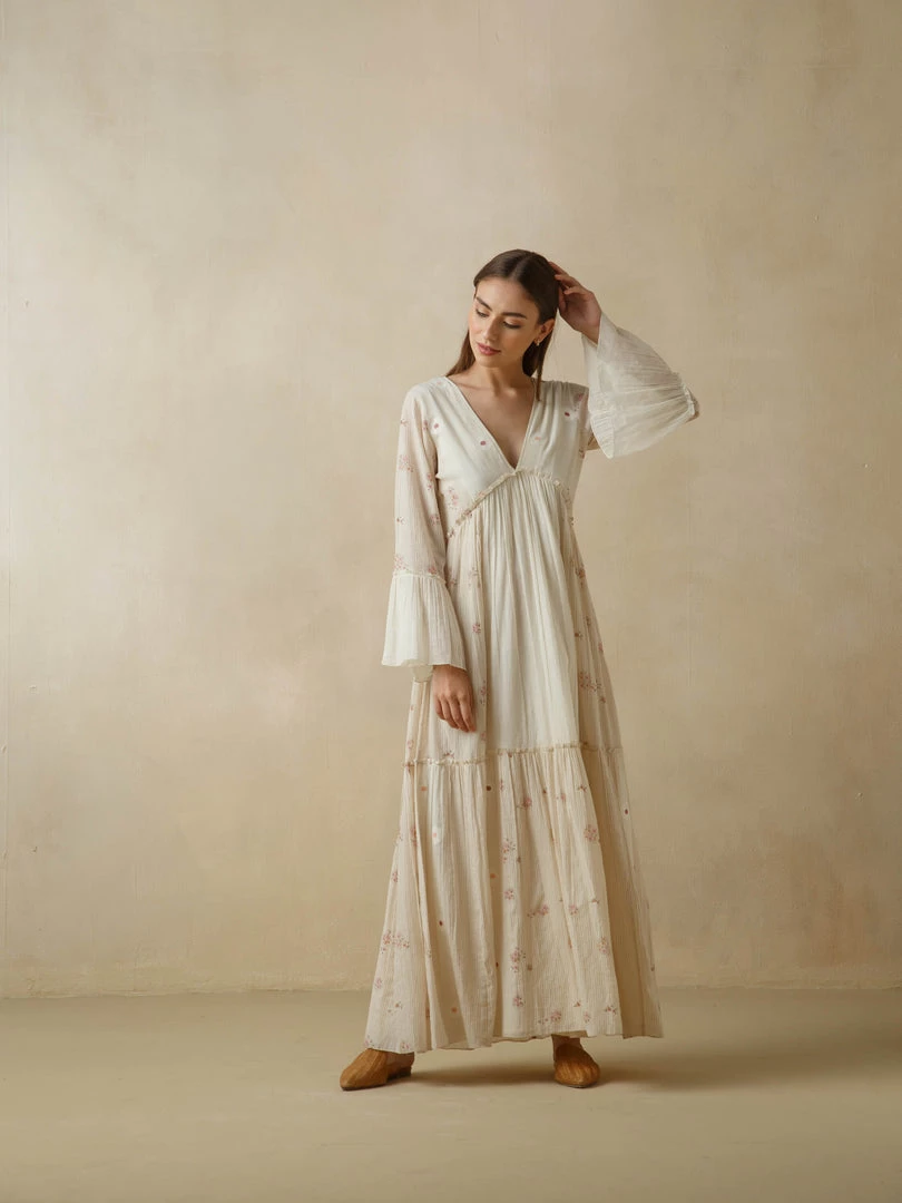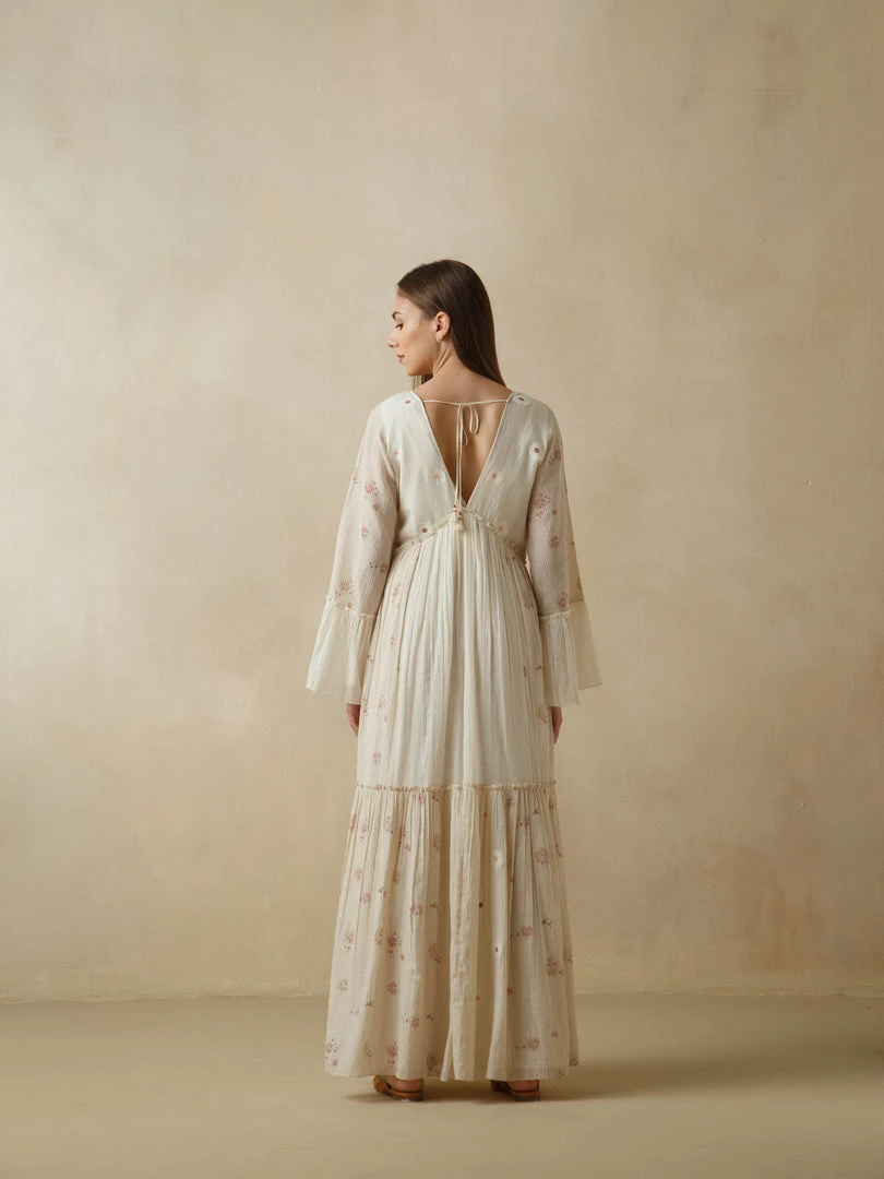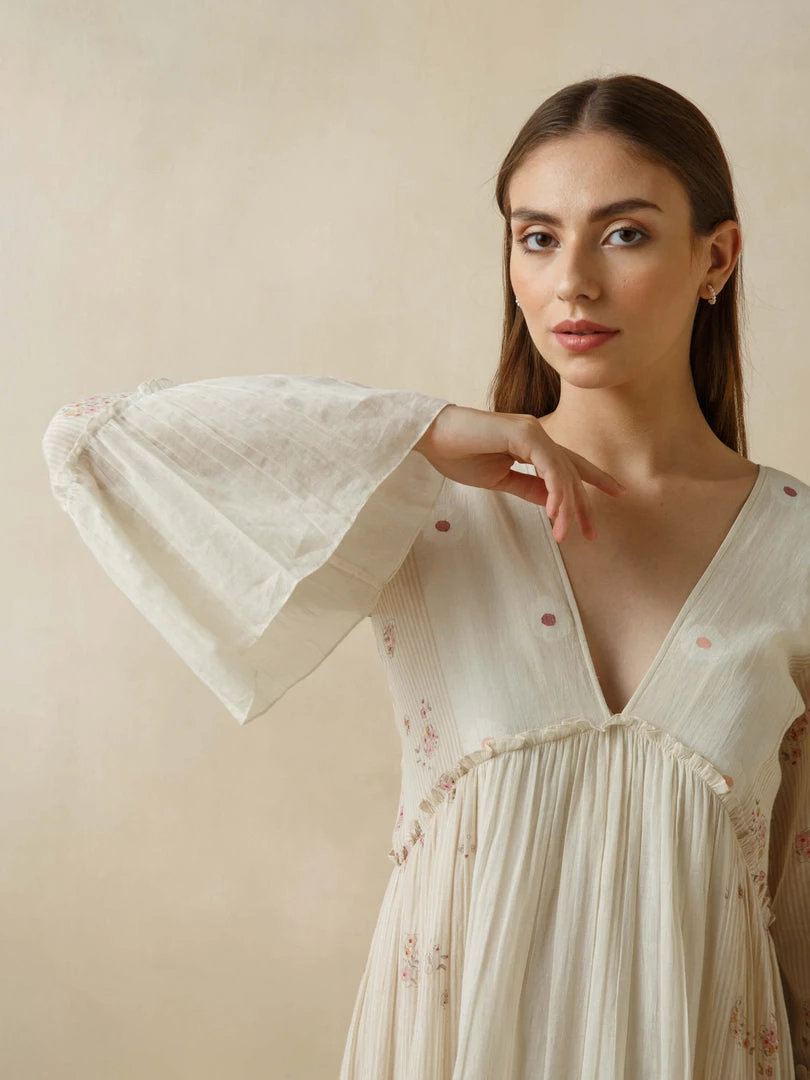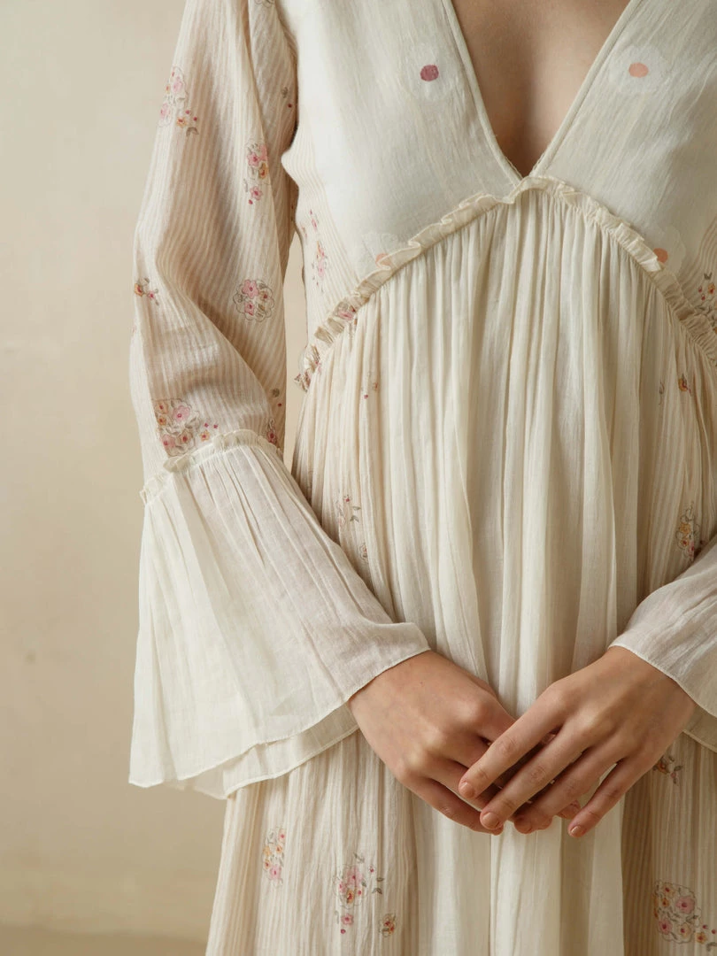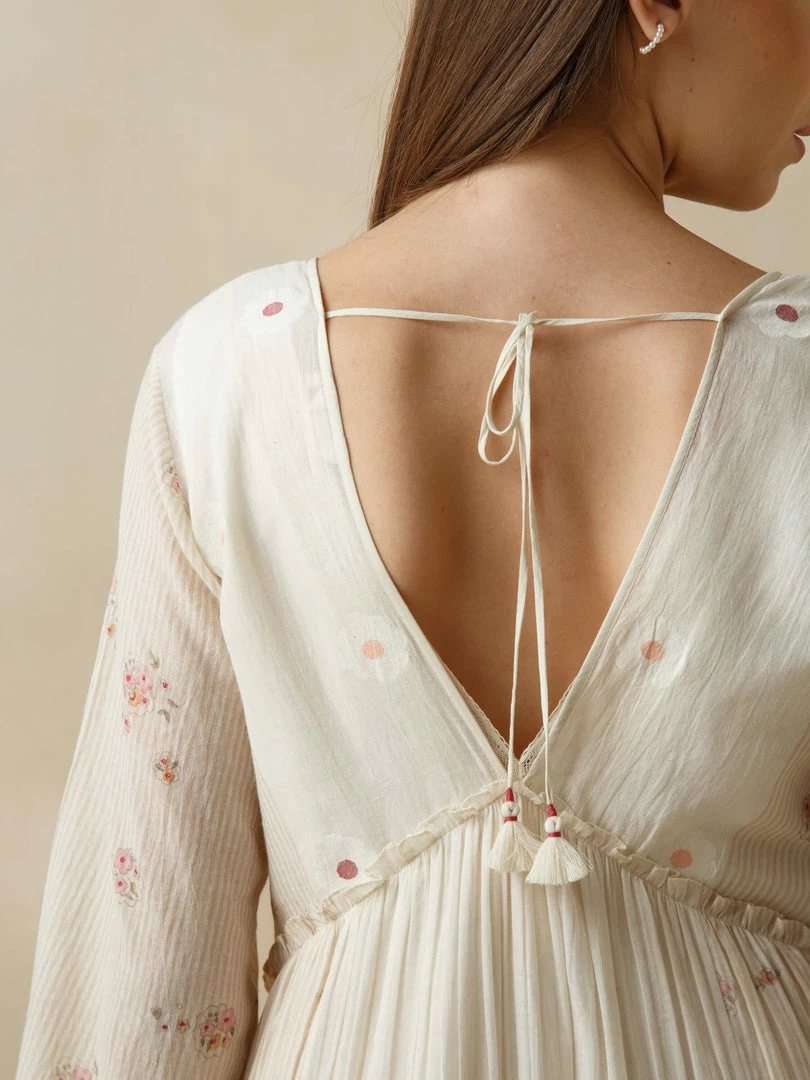 Echoing a dream of summer holidays, this jamdani cotton dress features a deep V-neck and a low back with slender tie-ups at the back of the neck falling into a sweeping tiered skirt. The interwoven floral border over the bodice complimented with hand block printed stripes and flutter sleeves enhances its harmonious mix match aesthetic.Â