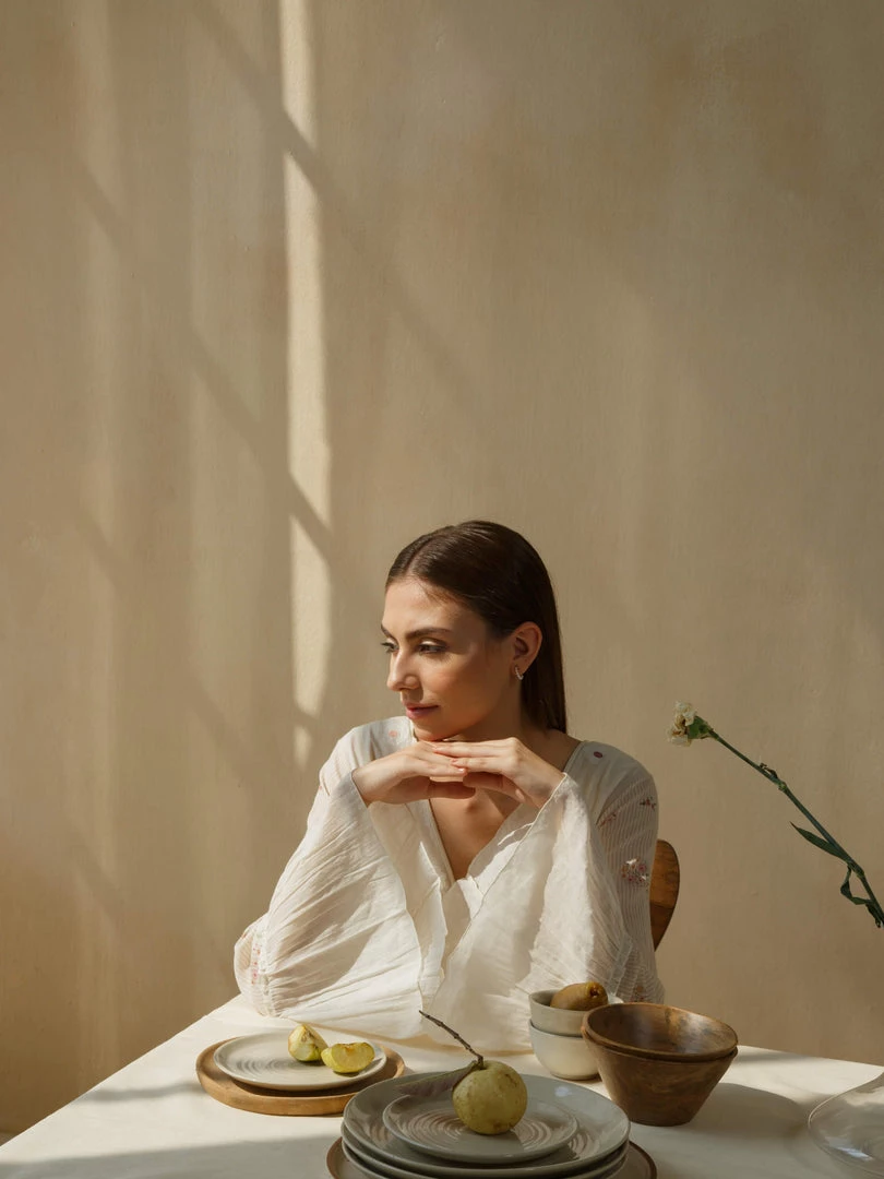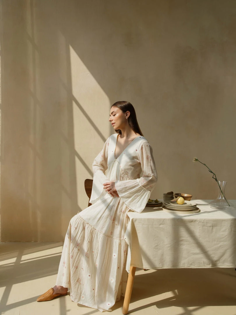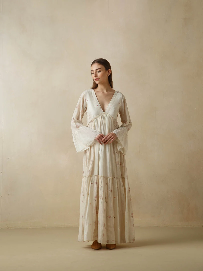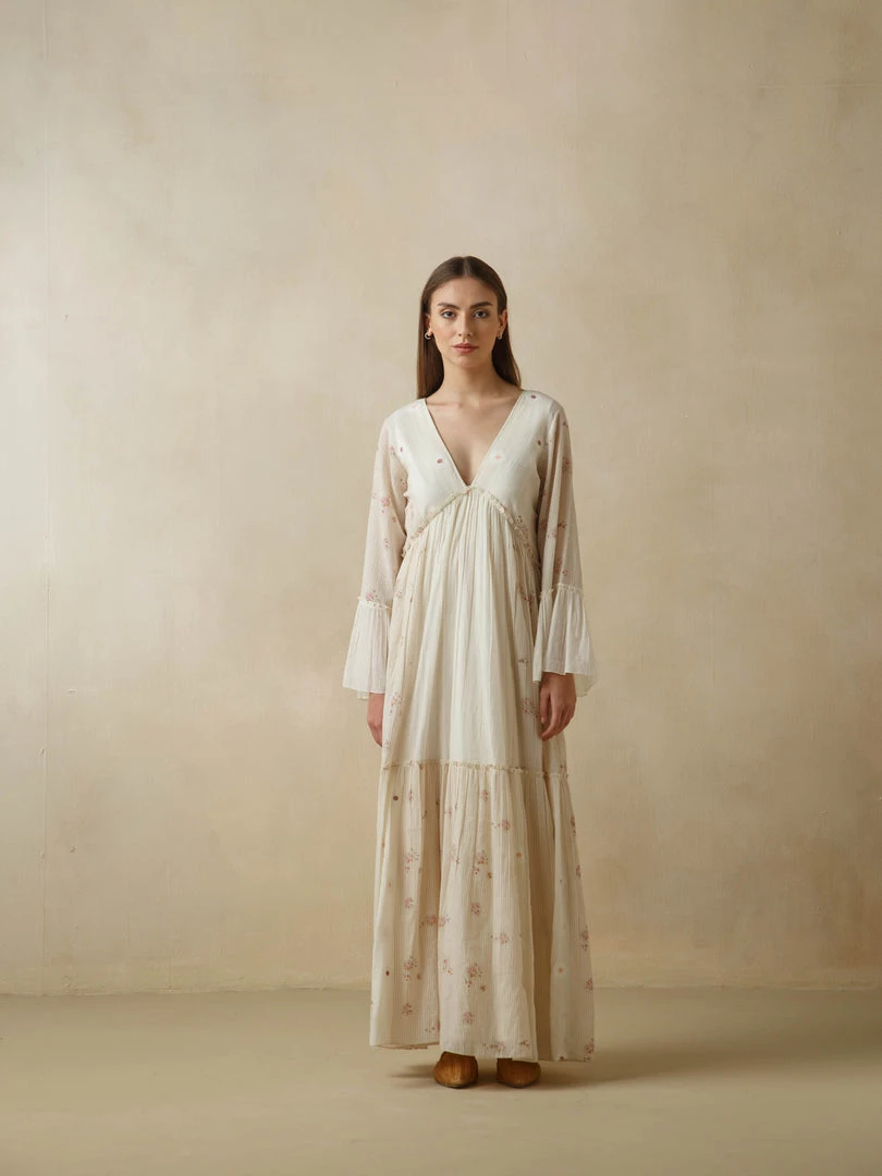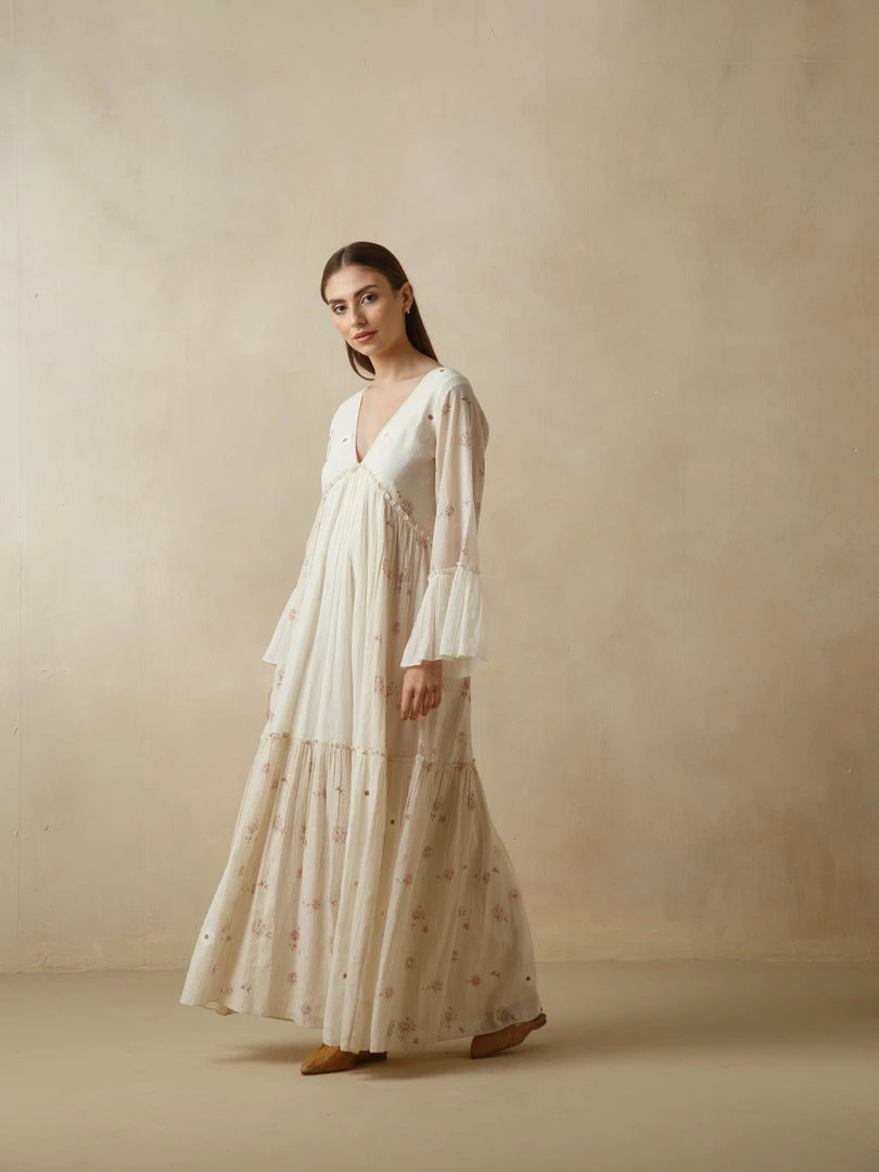 Echoing a dream of summer holidays, this jamdani cotton dress features a deep V-neck and a low back with slender tie-ups at the back of the neck falling into a sweeping tiered skirt. The interwoven floral border over the bodice complimented with hand block printed stripes and flutter sleeves enhances its harmonious mix match aesthetic.Â